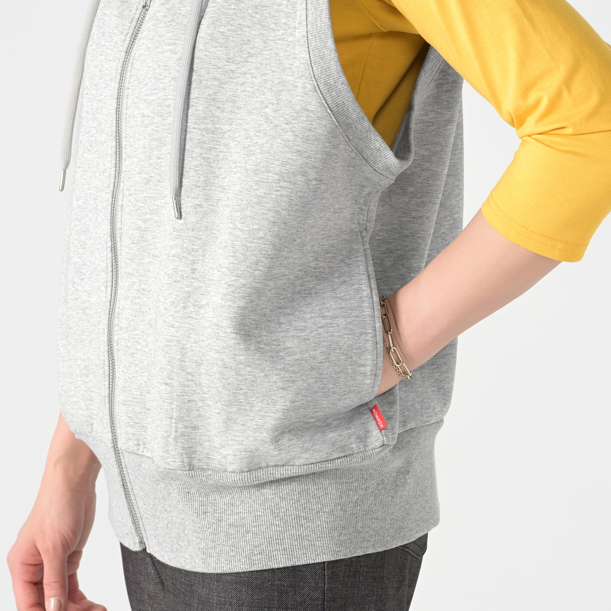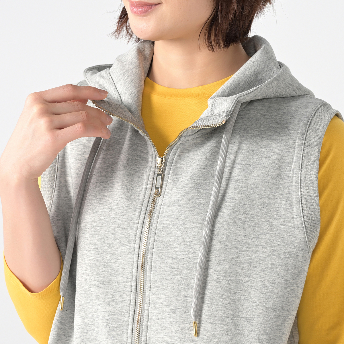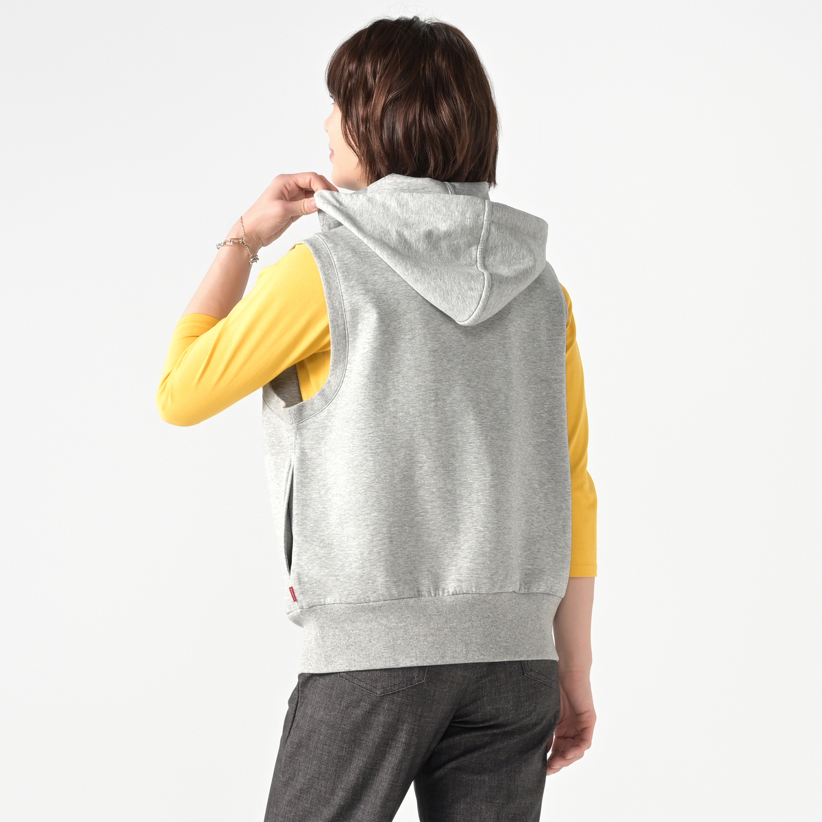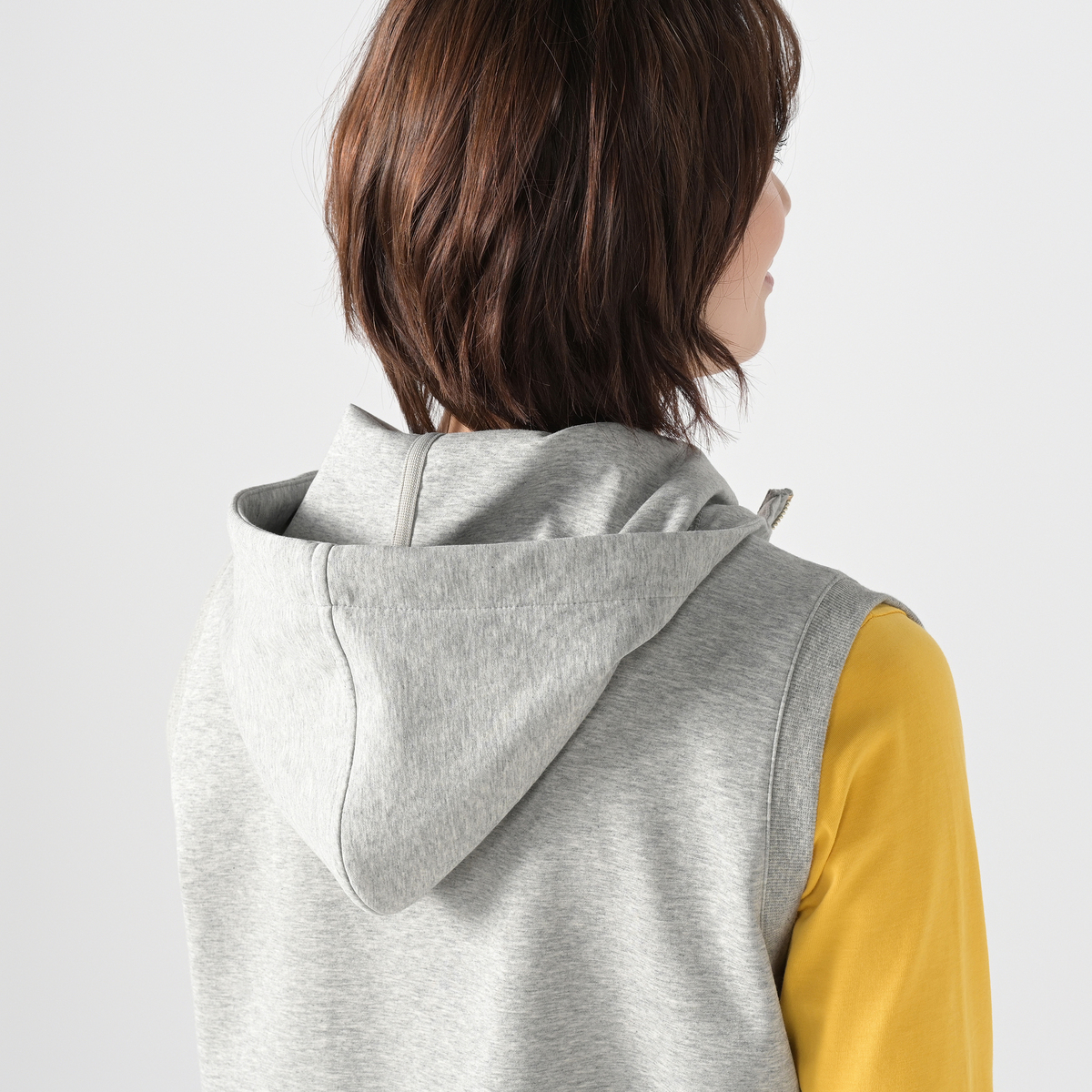 着こなしに立体感を添えるフーディベスト。広めの肩幅がフレンチスリーブ風で、立ち上がりのあるフードがアクセントになり、羽織としても使いやすい一枚です。両脇には便利なポケット付きです