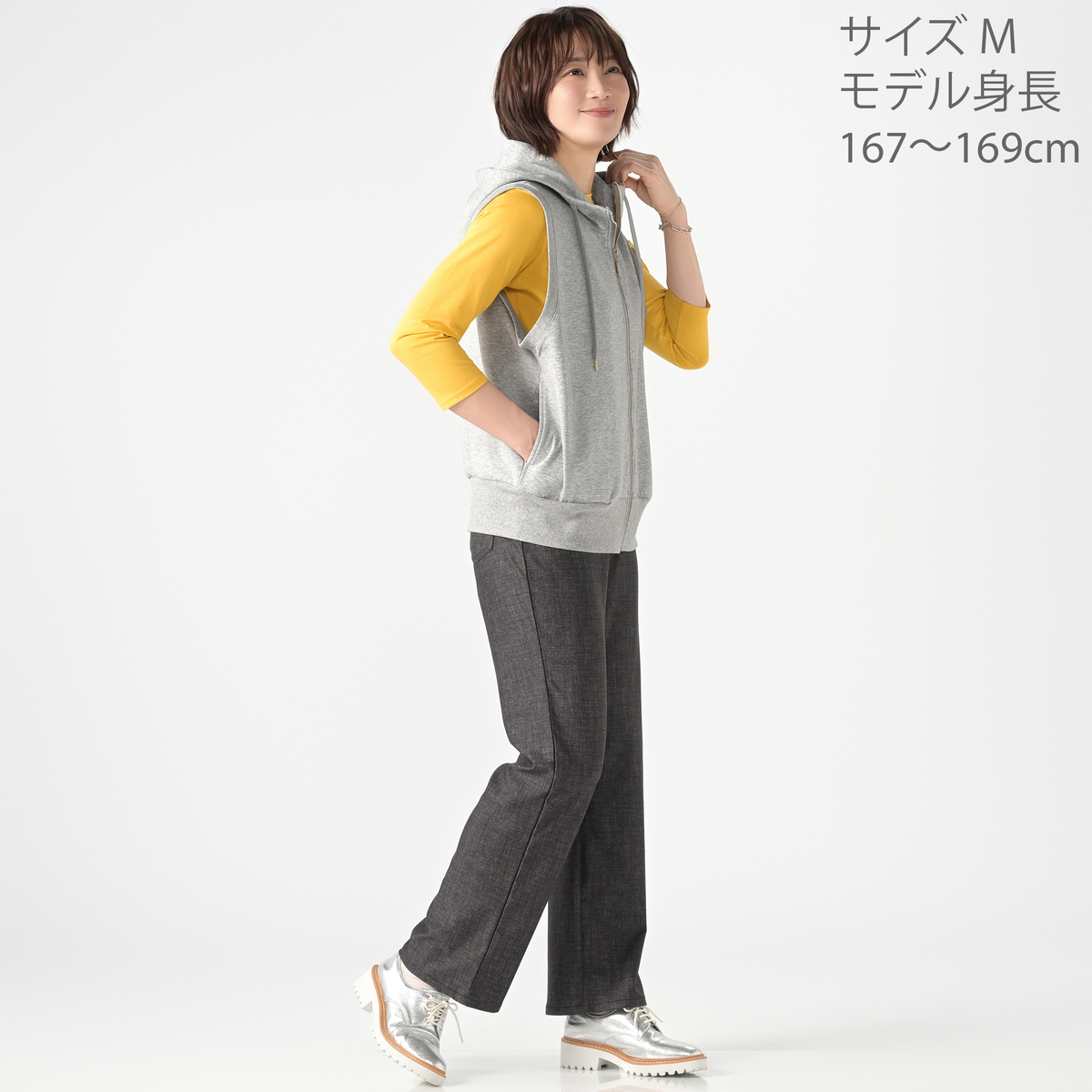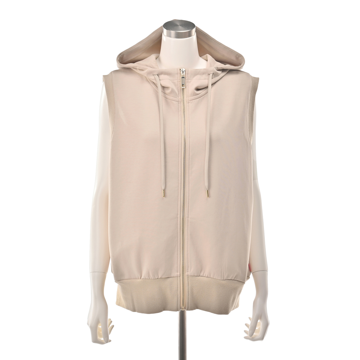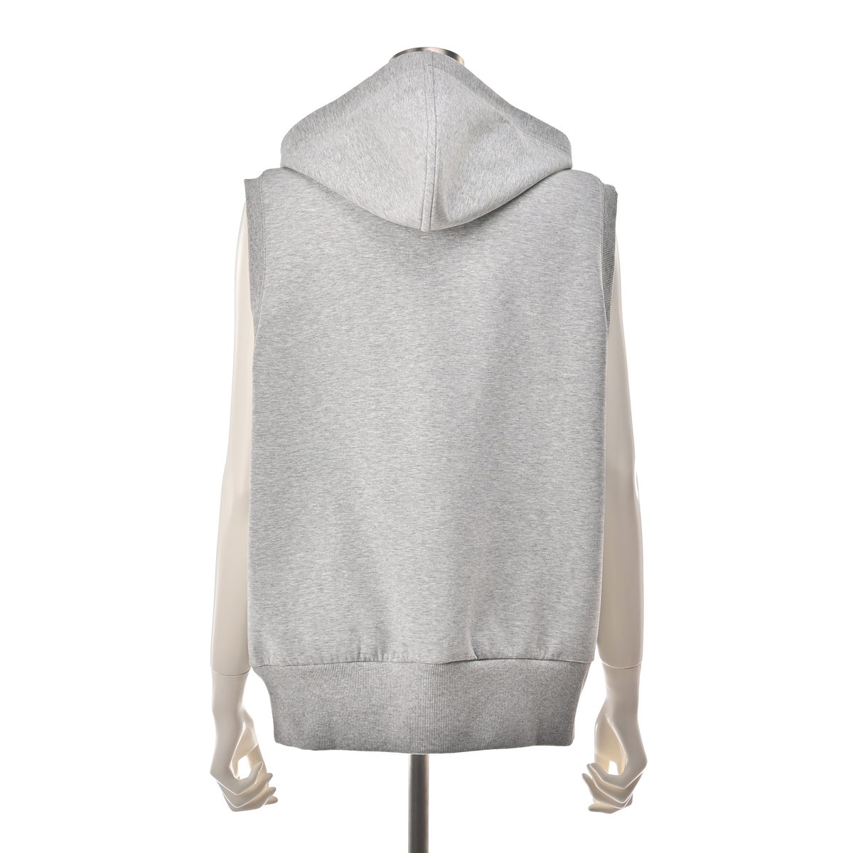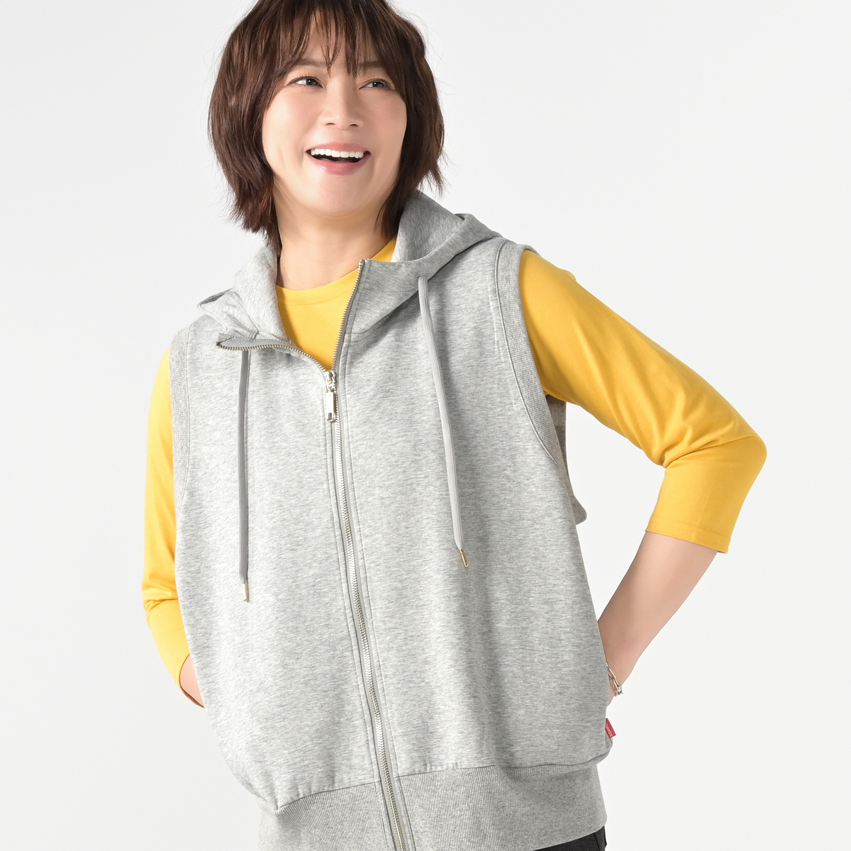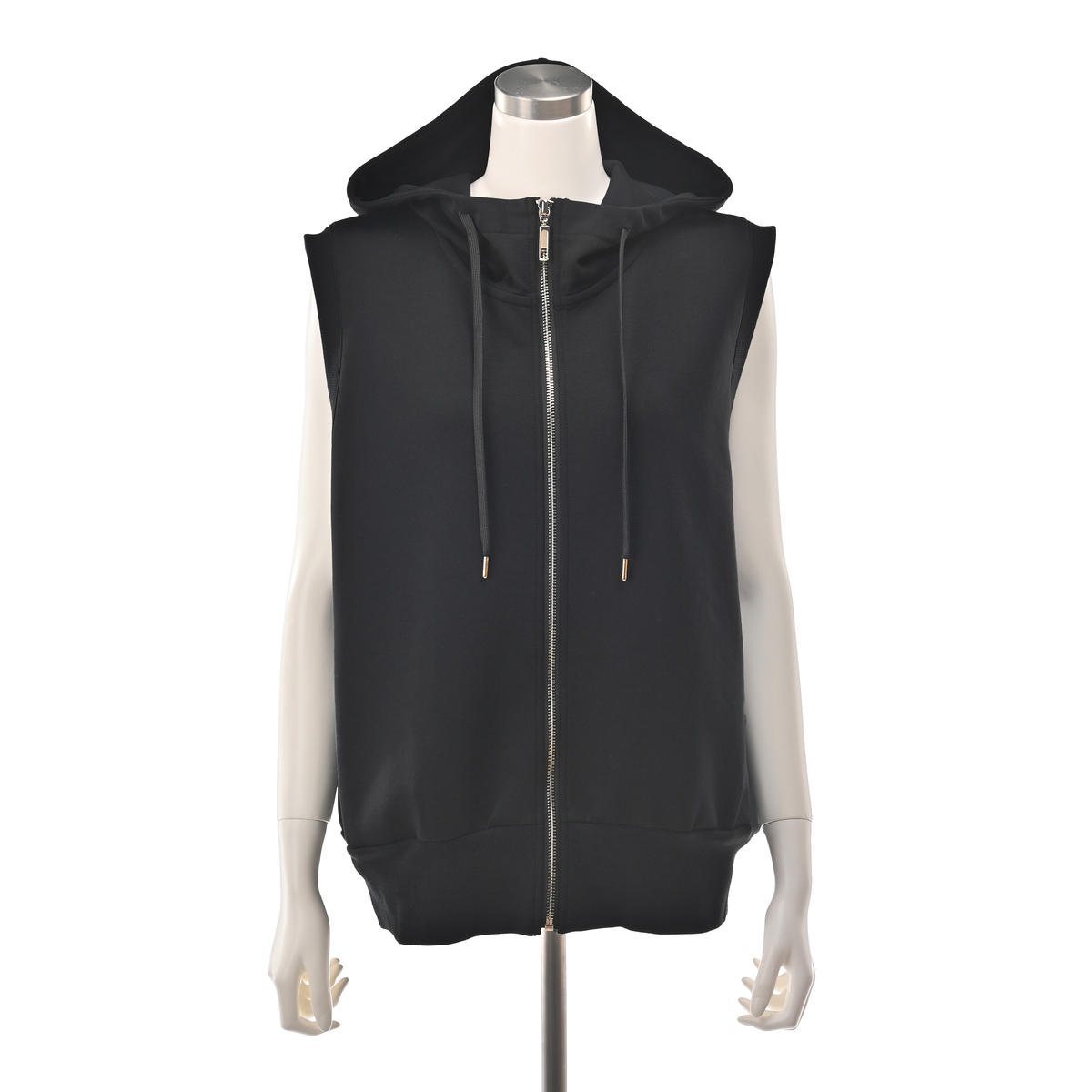 着こなしに立体感を添えるフーディベスト。広めの肩幅がフレンチスリーブ風で、立ち上がりのあるフードがアクセントになり、羽織としても使いやすい一枚です。両脇には便利なポケット付きです