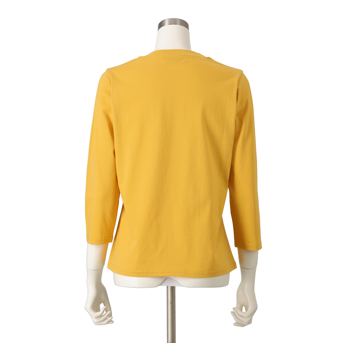 程よい光沢が上品で高見えする綿100%天竺素材を使用。ソフトな風合いで肌触りが良く、カジュアルながらもキレイめな印象に。シルケット加工を施しているので、毛羽立ちが少なく程よいハリ感があり綺麗なシルエットです