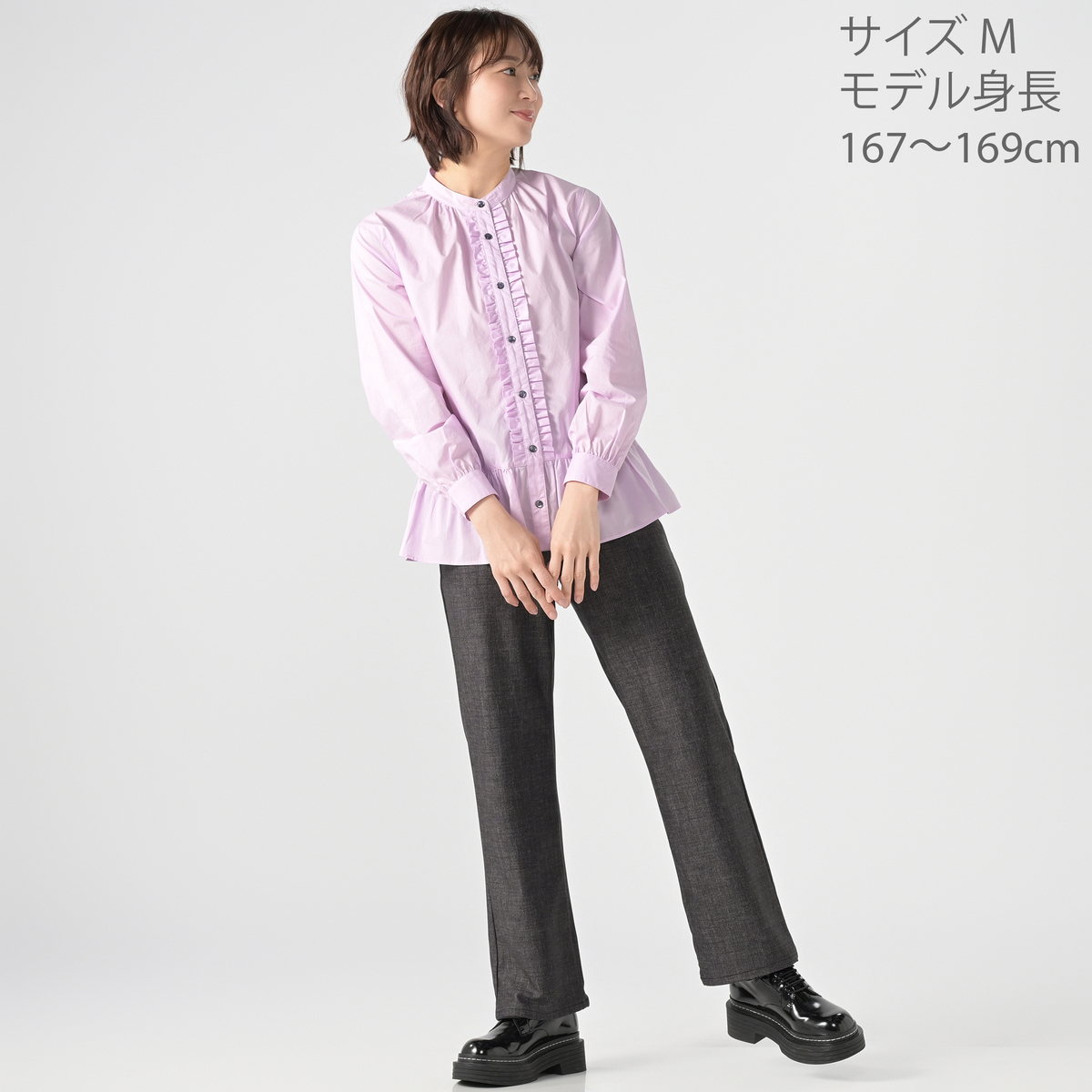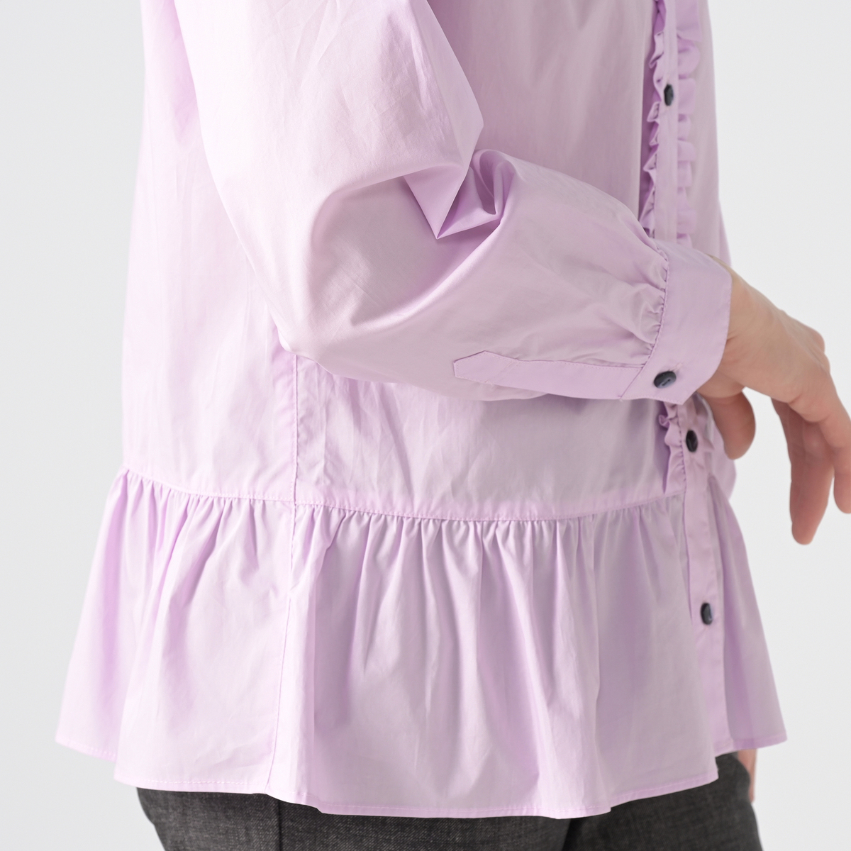 前立てのフリルや、裾、袖口のギャザー切替がフェミニンなブラウス。デニムを合わせてレディライクなカジュアルスタイルに。ベストやジャケットを羽織れば、より華やかな印象で着こなせます