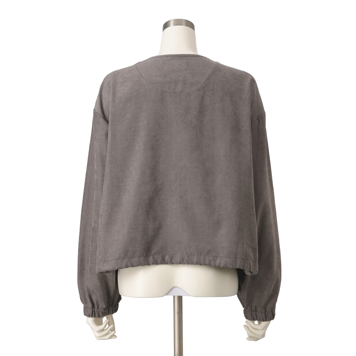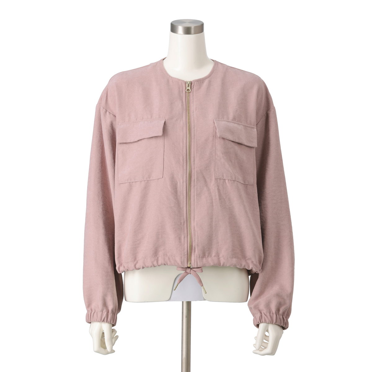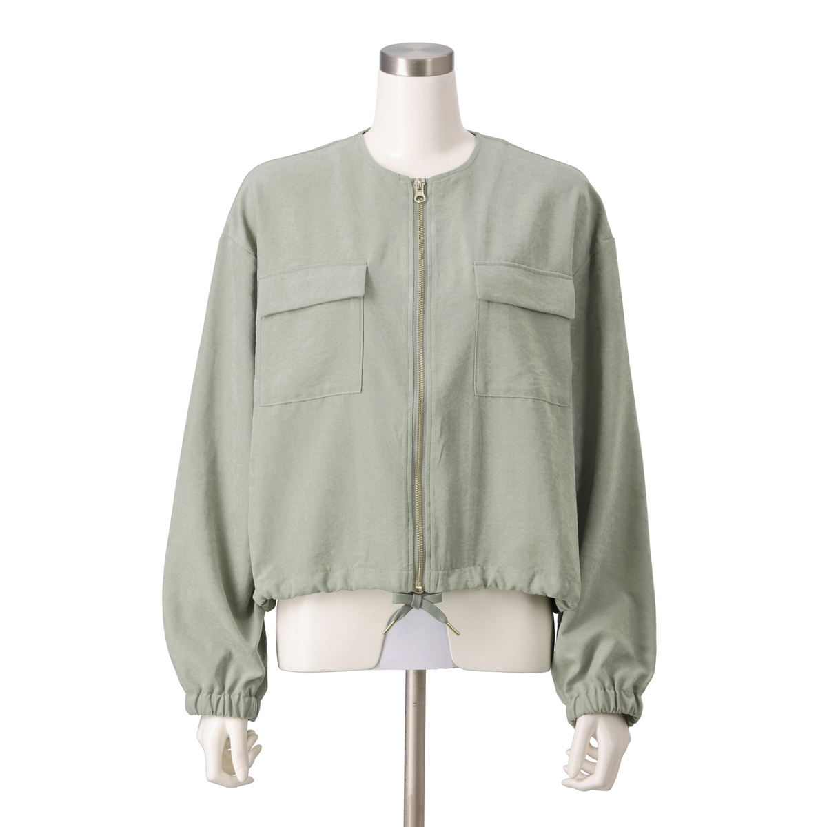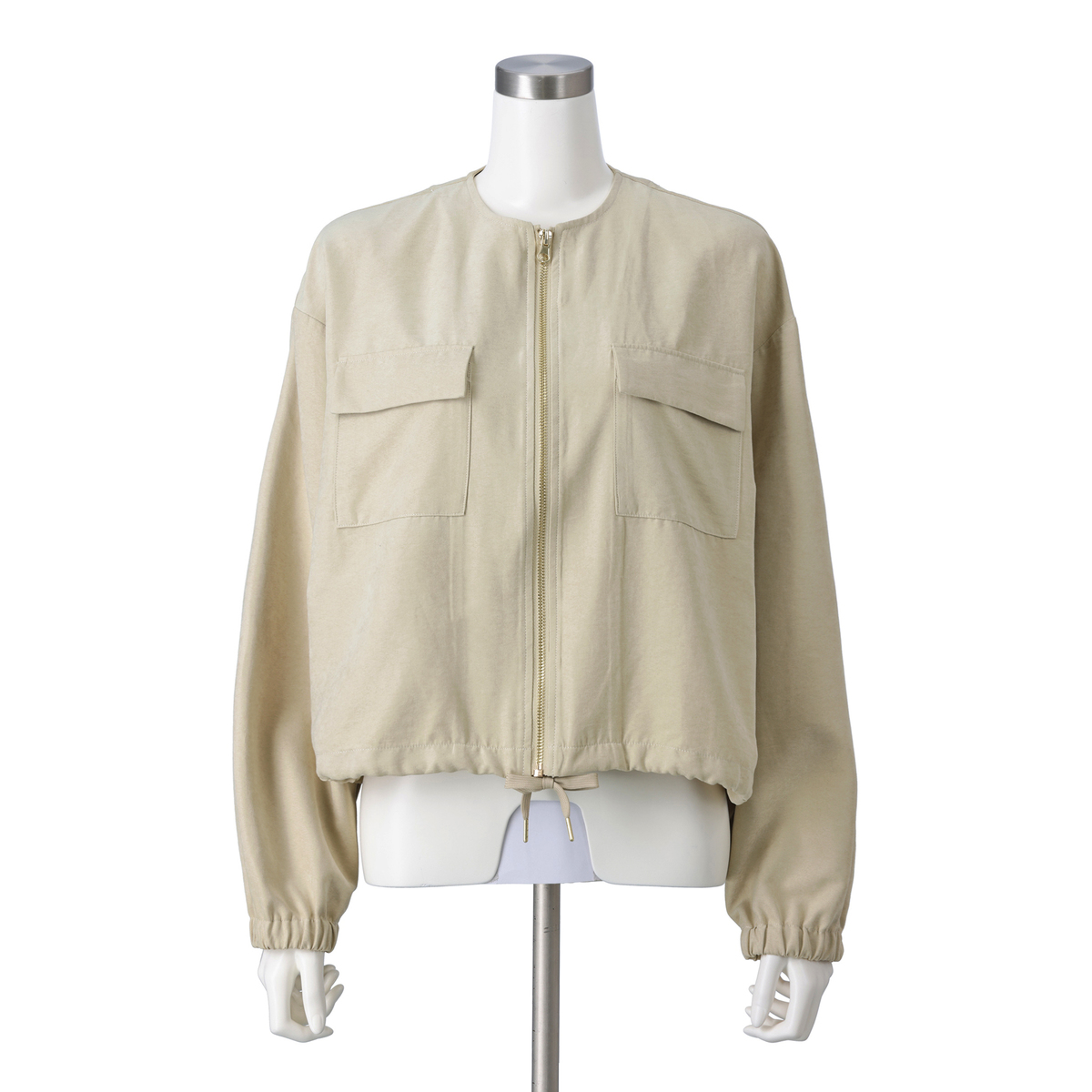 ショート丈が腰位置を高く見せ、スタイルアップ効果も期待できるデザイン。裾は絞れるのでシルエットを調整でき、袖口はゴム入りでまくりやすい仕様。すっきり見えするノーカラーで、シャープな印象を与えます