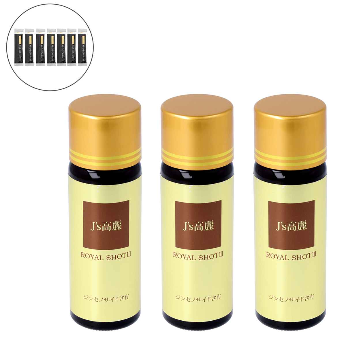 [セット内容] ・J’s高麗ロイヤルショットIII 3本セット ・熟成発酵濃縮黒にんにくゼリーα 7包(プレゼント) [原材料] イソマルトオリゴ糖、紅参濃縮液、ローヤルゼリー、ブルーベリー果汁粉末、ブルーベリー濃縮液/ビタミンC