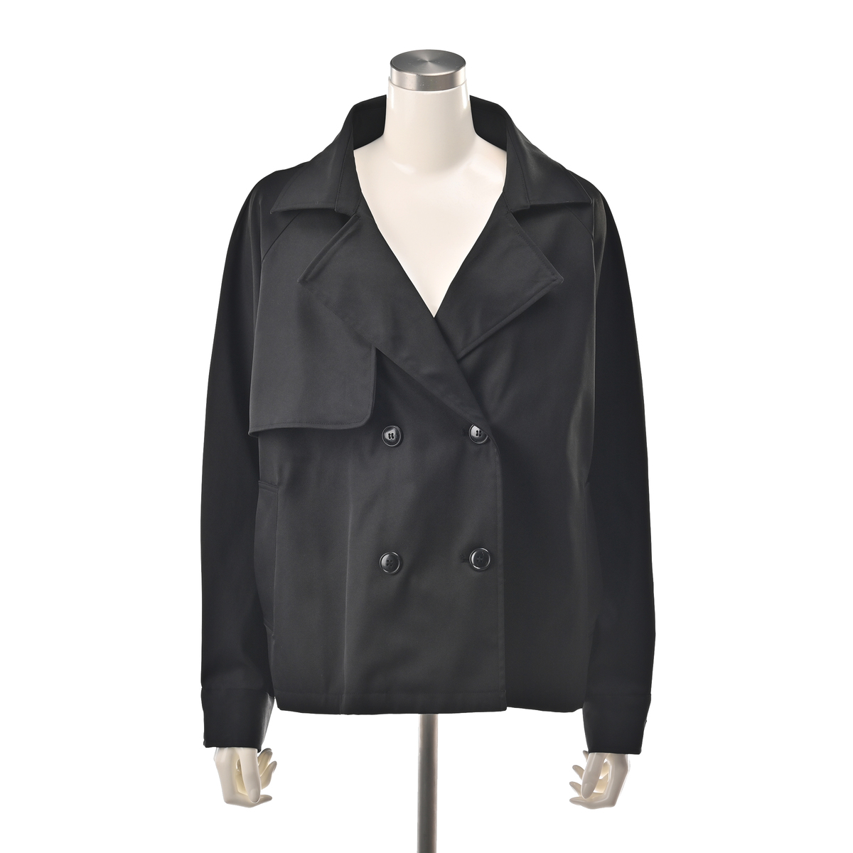センターと袖口の大きめボタンがアクセント。バックヨークと立体的な衿で横からのスタイルも美しく見せます。ショート丈ならではの脚長効果も期待でき、軽やかな着心地でロングシーズン活躍する一枚です