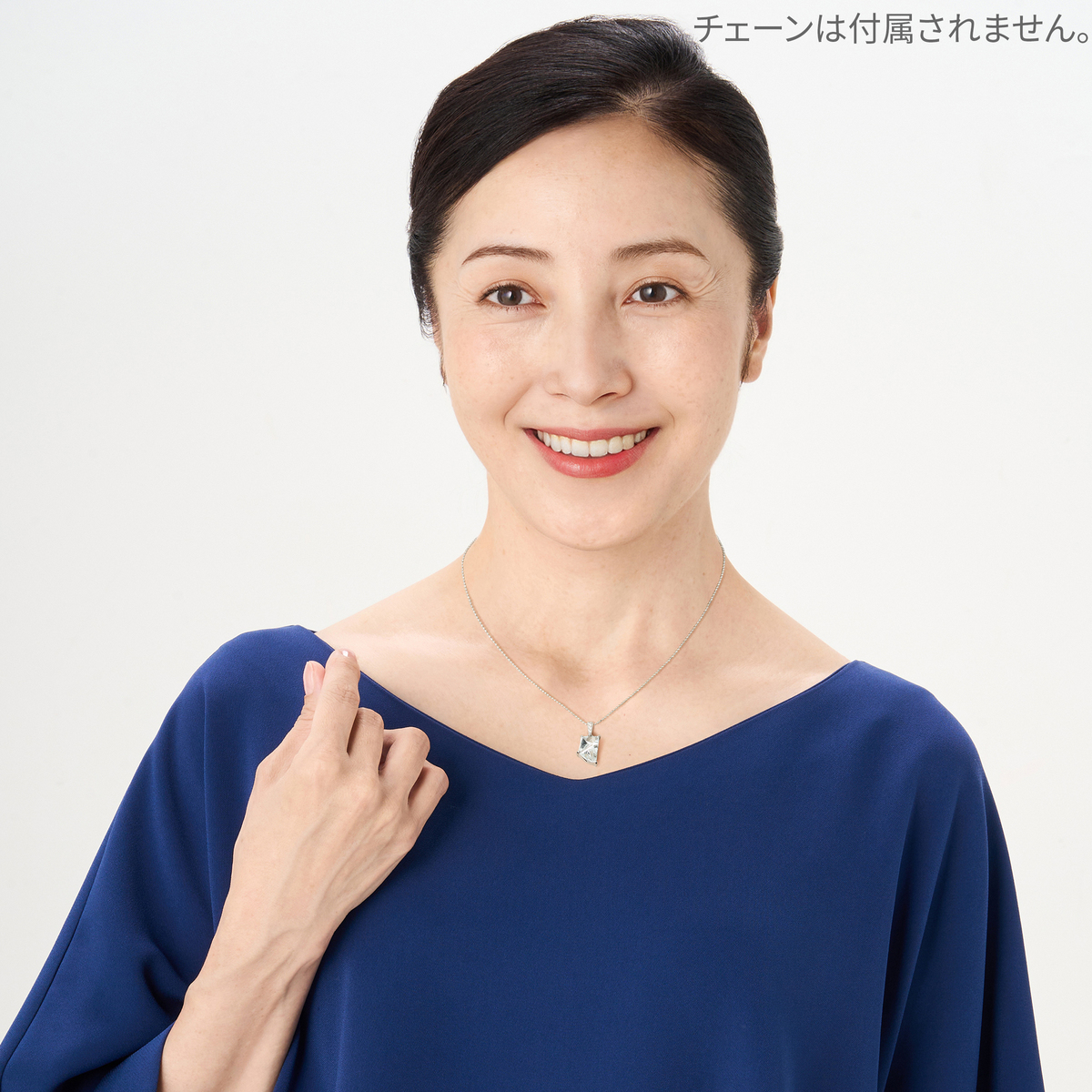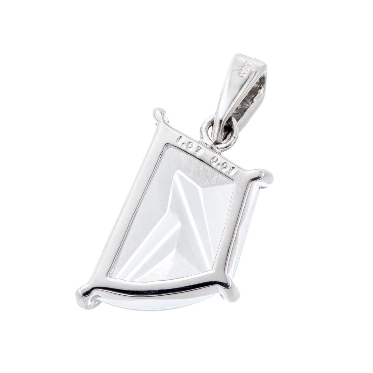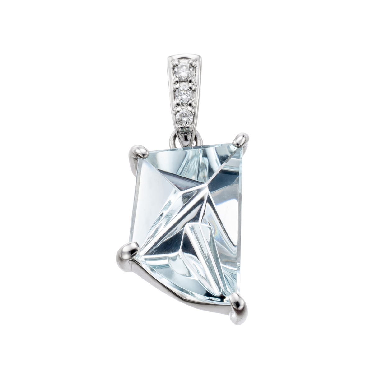 アクアマリンの輝きを引き立てるペンダントヘッド。カット名の「Mantis」はカマキリの鋭い手をイメージし、キューレット側に不規則なカットを施すことで光を複雑に反射します。3粒のダイヤモンドをあしらったバチカンとプラチナの組合せが、洗練された存在感を放つ逸品です