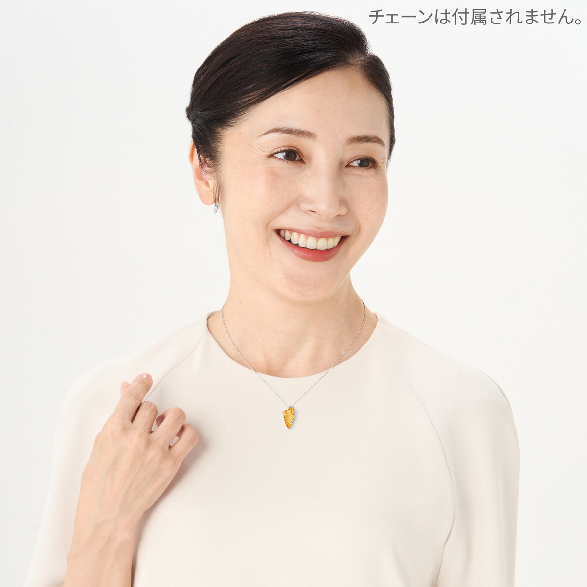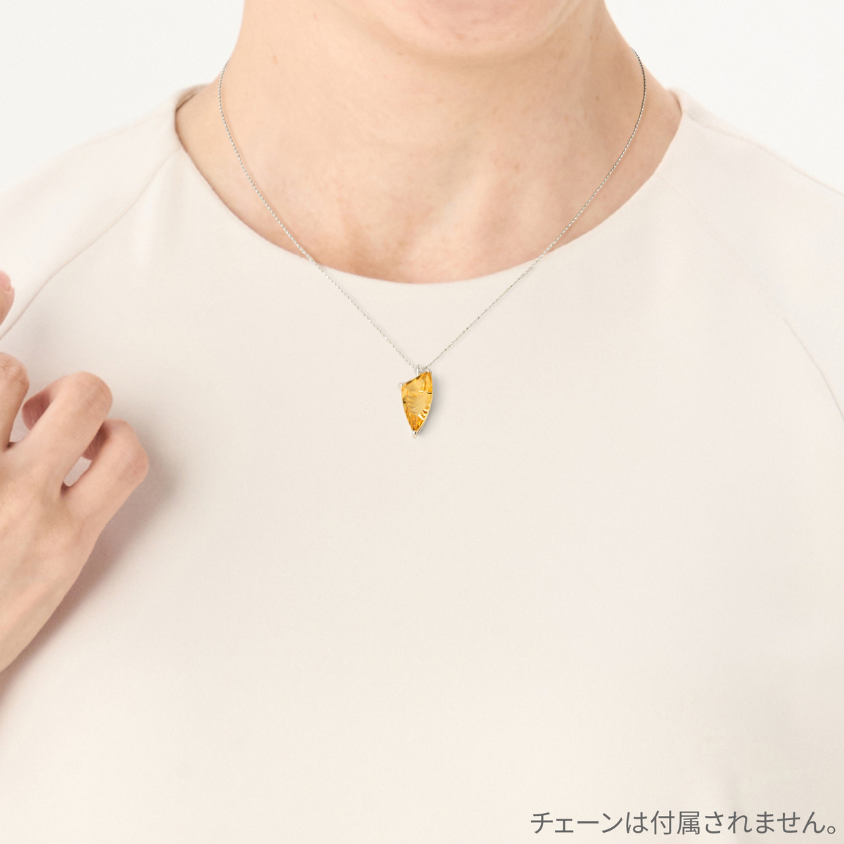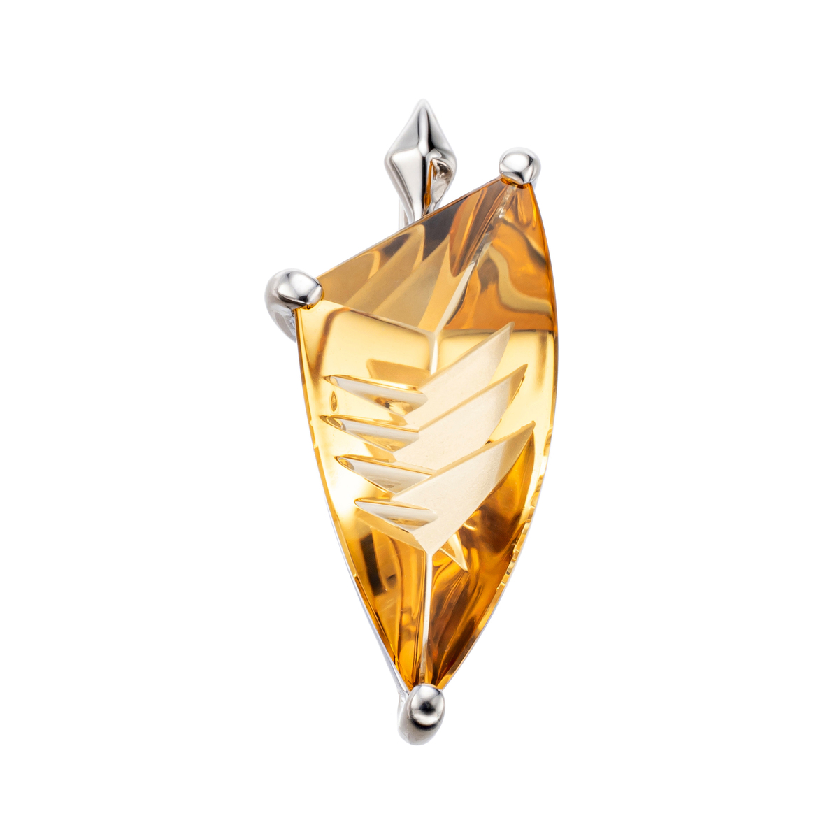 黄金色に輝くイエローベリルのペンダントヘッド。裏側に施した鋭いカットと一部のつや消し加工が、光と質感のコントラストを際立たせます。菱形のバチカンはドラゴンの爪をイメージし、プラチナの上質な輝きとともに力強さと洗練を兼ね備えた逸品です