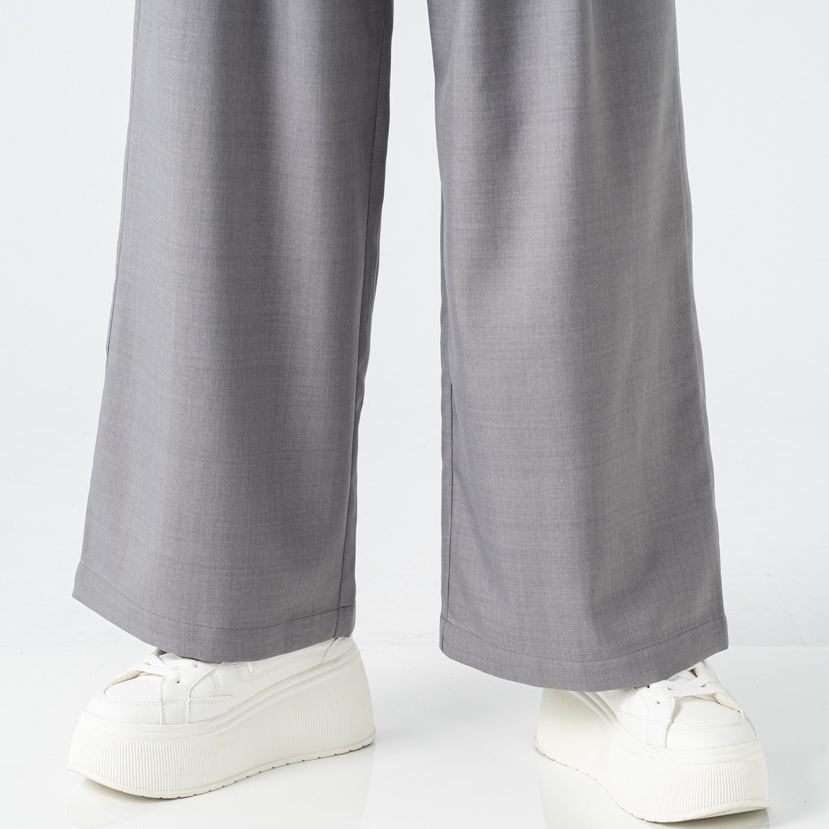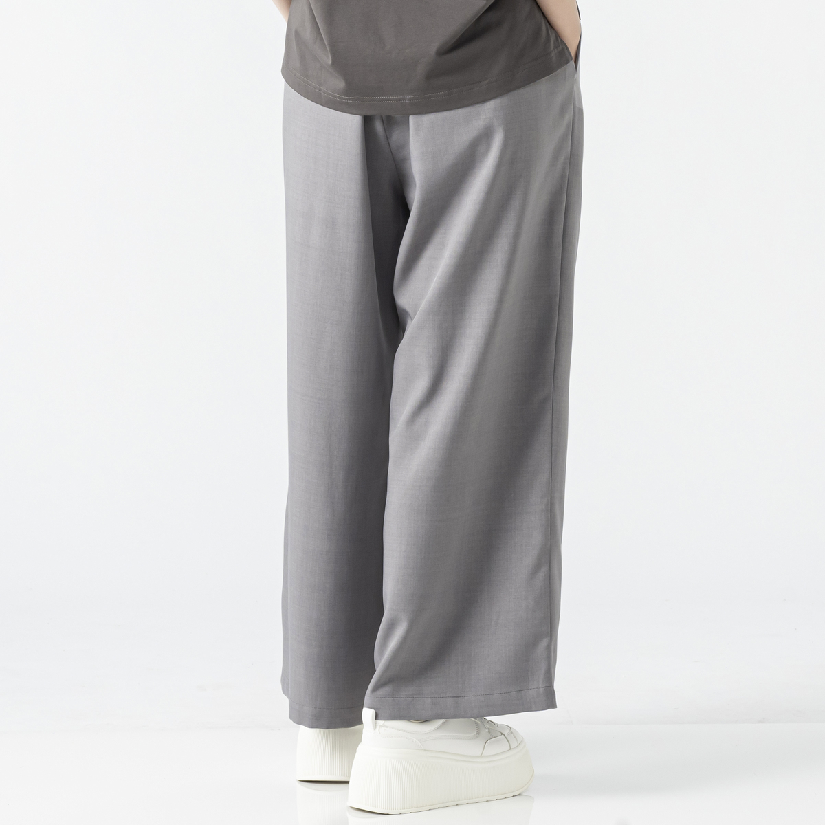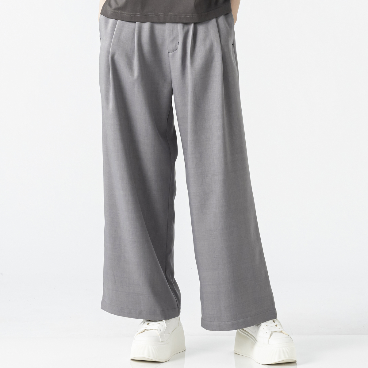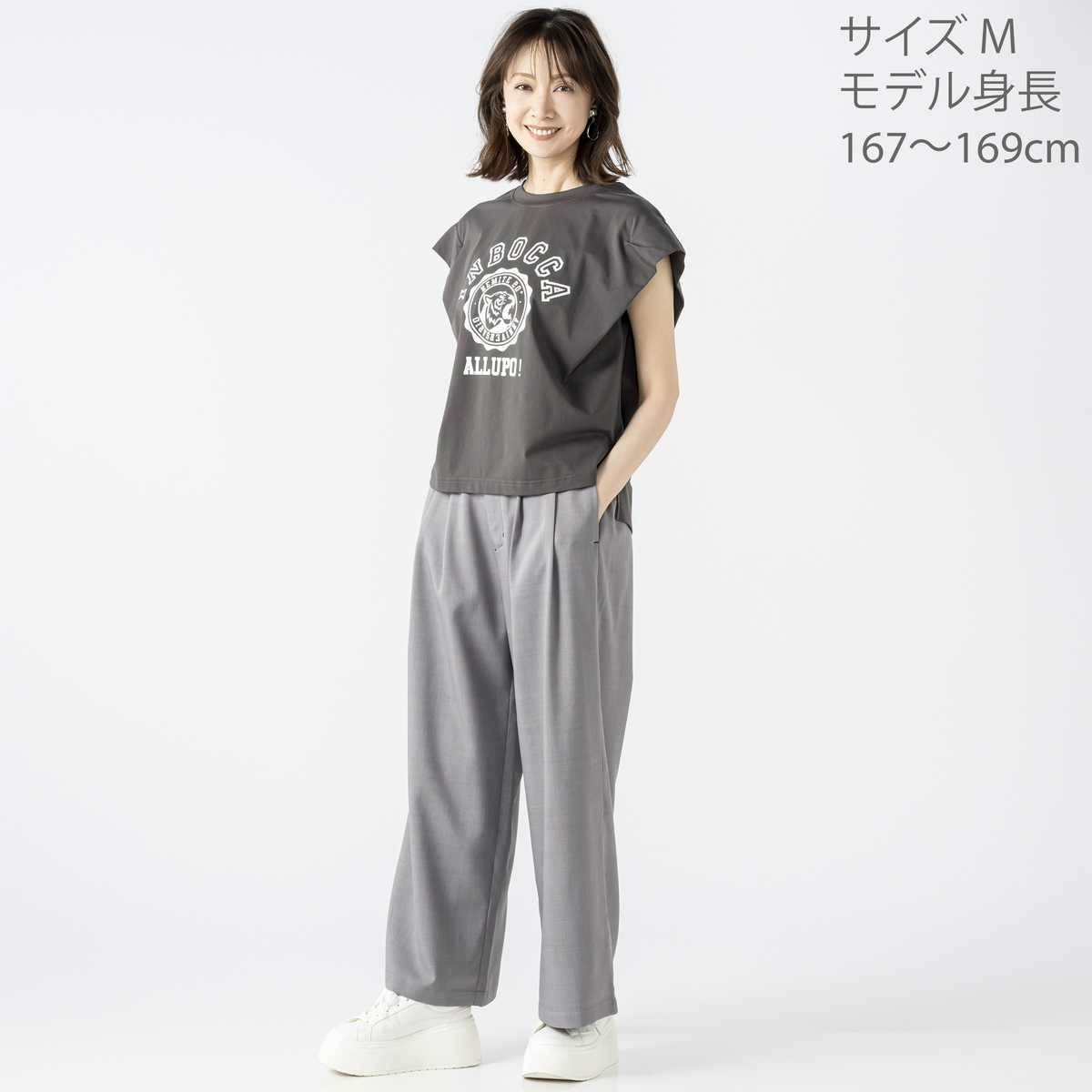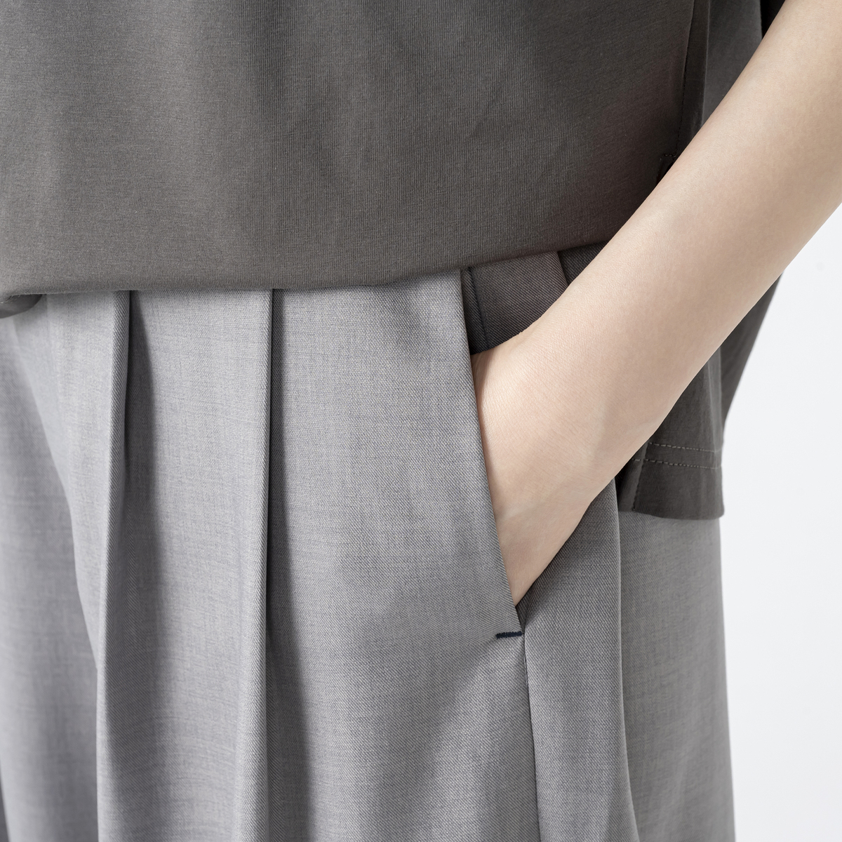 カジュアルなTシャツやきれいめブラウスなど、幅広いスタイリングにマッチ。ワイドシルエットが足のラインを拾いにくく、バランスよく穿いていただけます