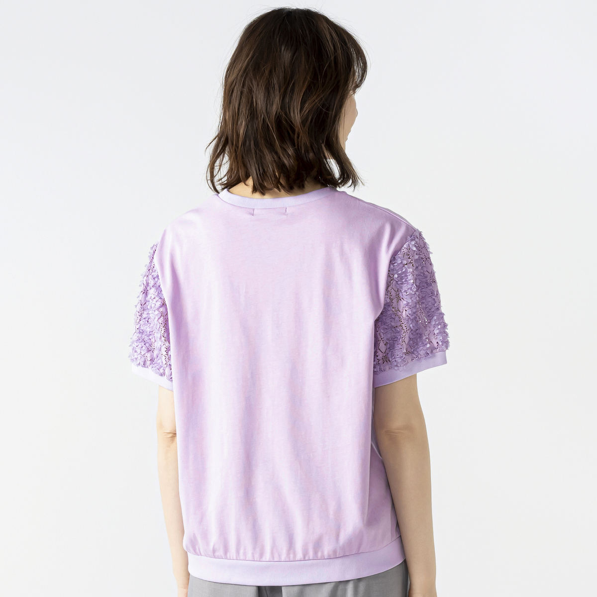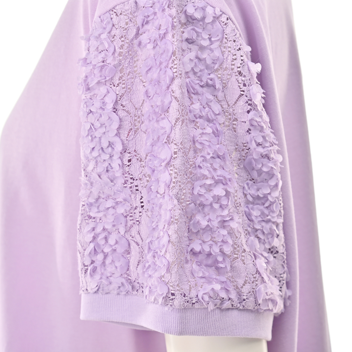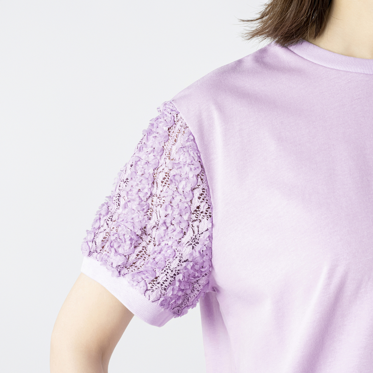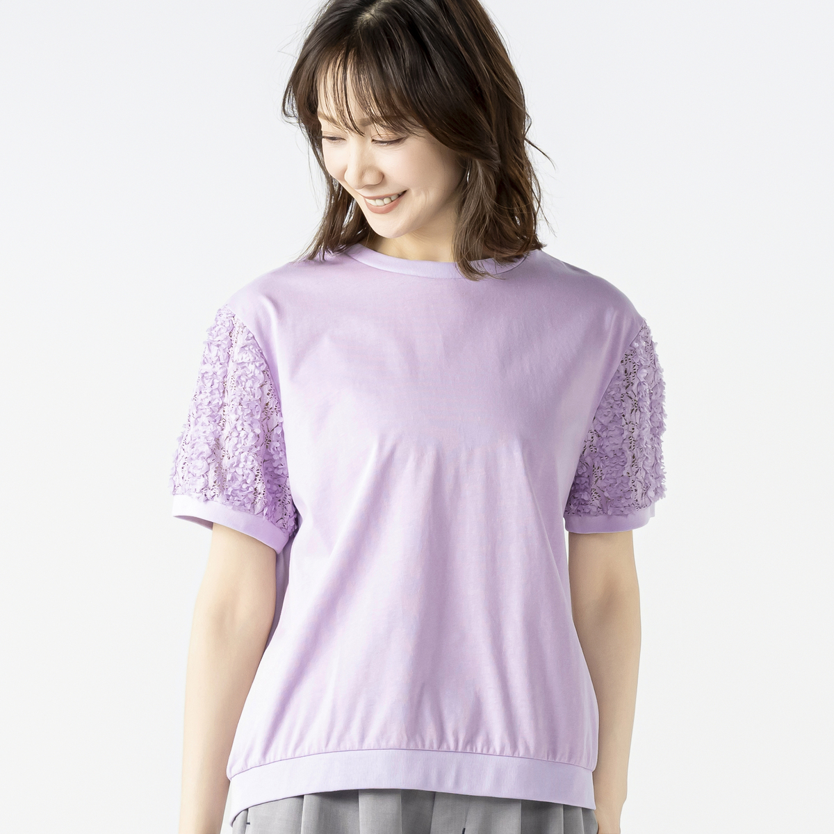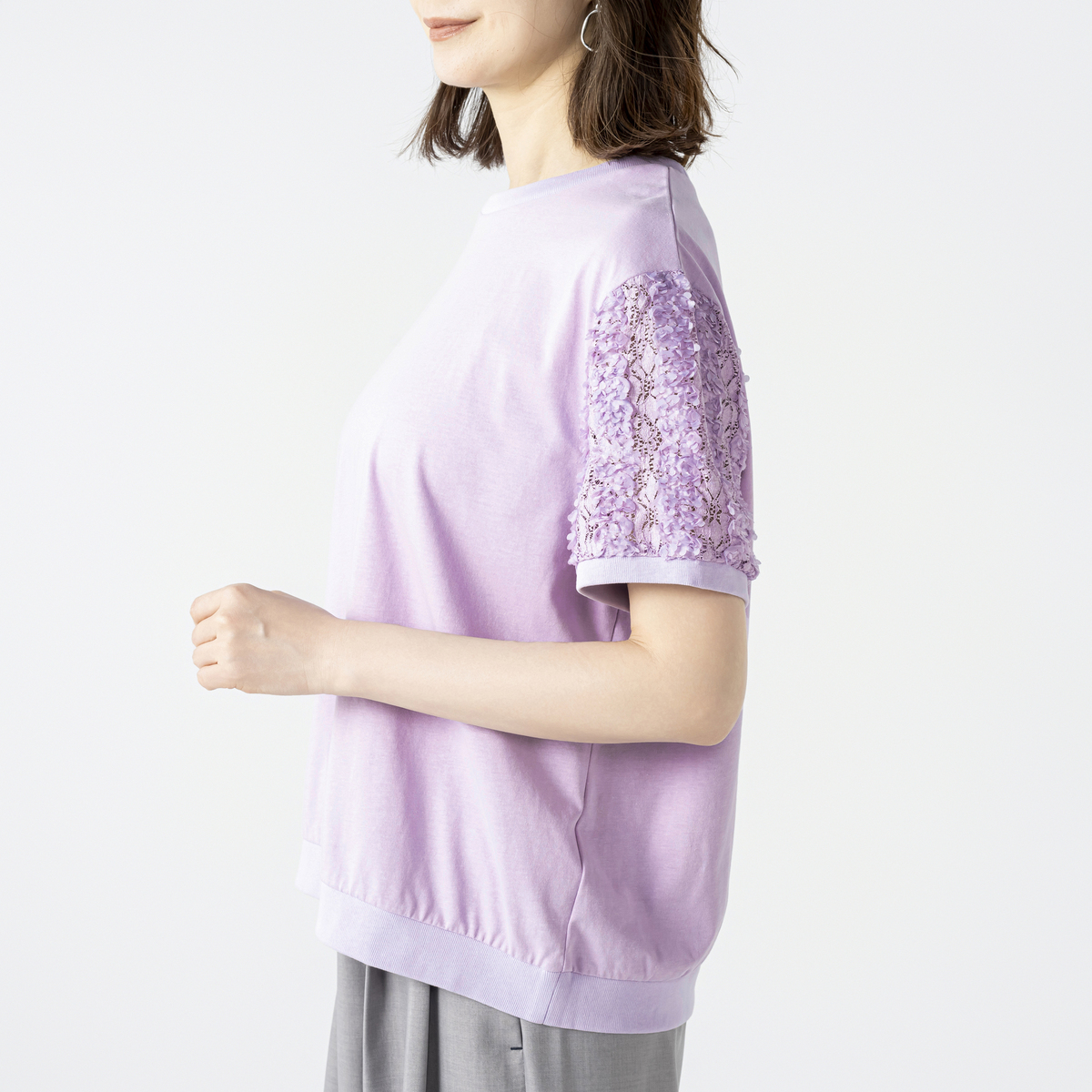 立体的な花モチーフレース袖がポイントのチュニック。レギュラー丈のクルーネックで着やすく、袖には凹凸のある花柄レースを使用。袖口と裾口はフライスで程よく締め、全体のバランスを整えています