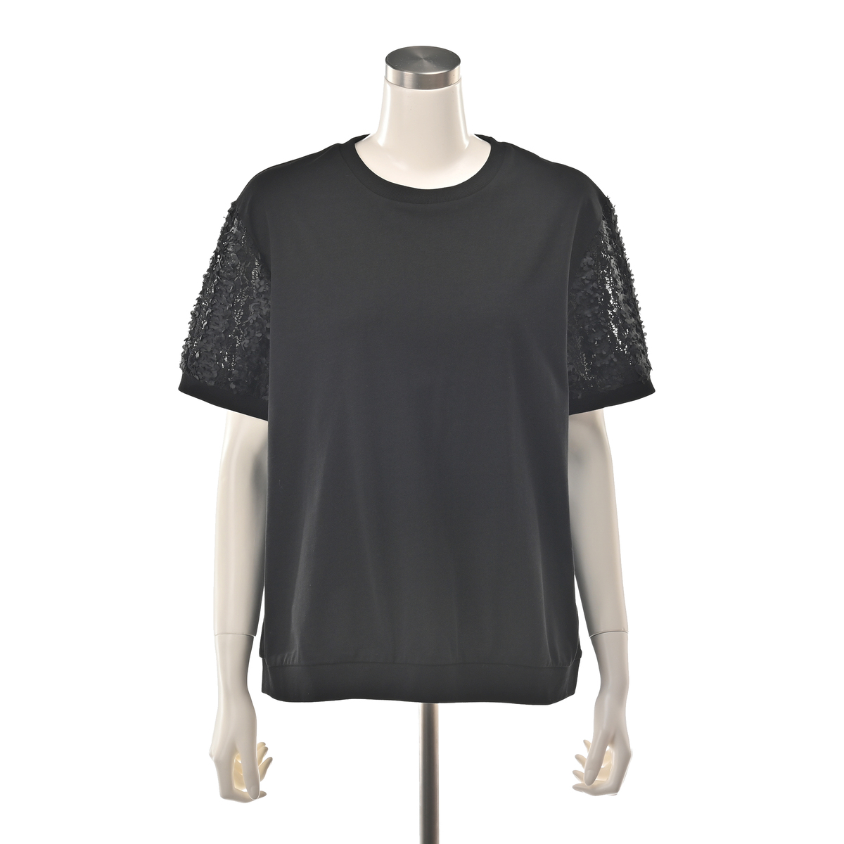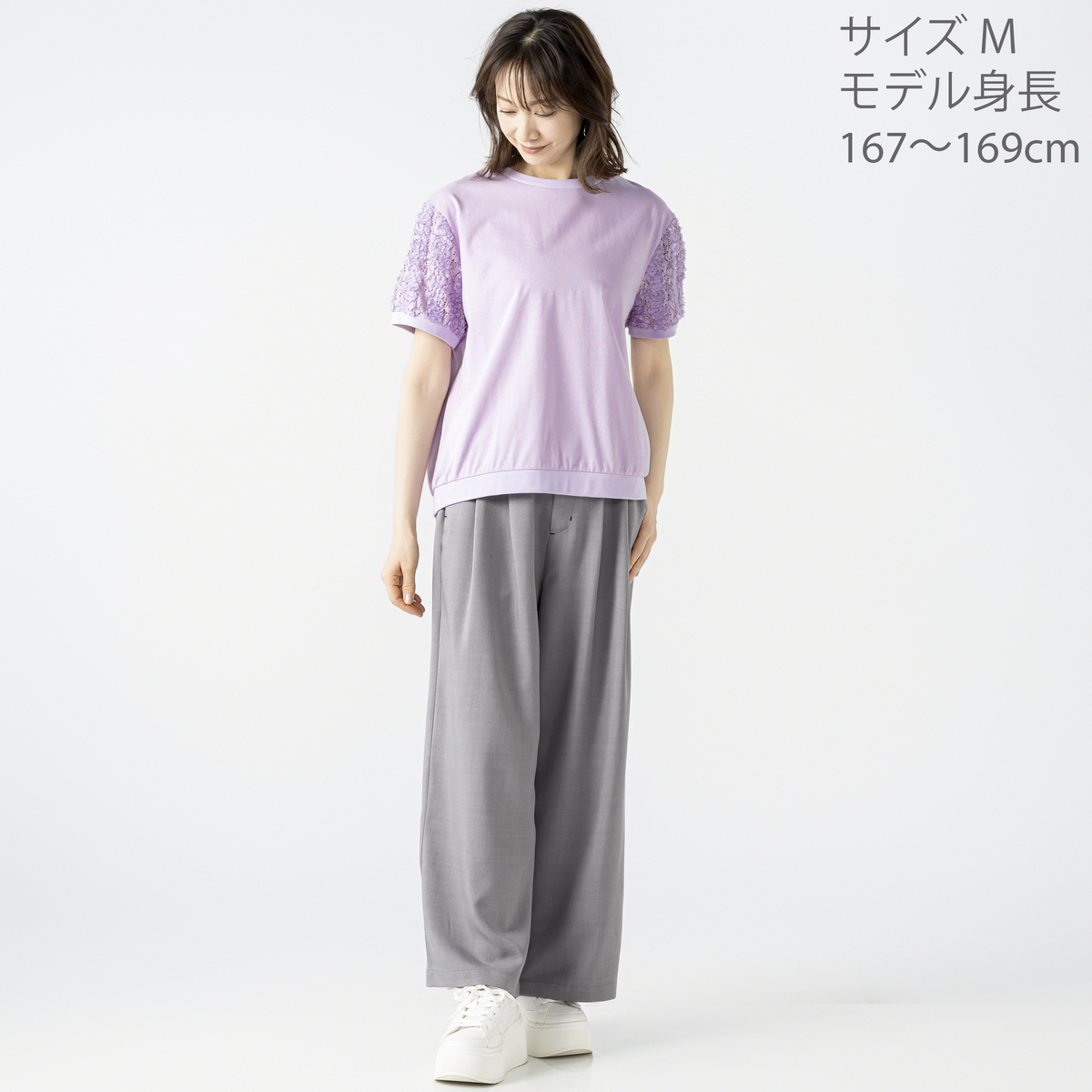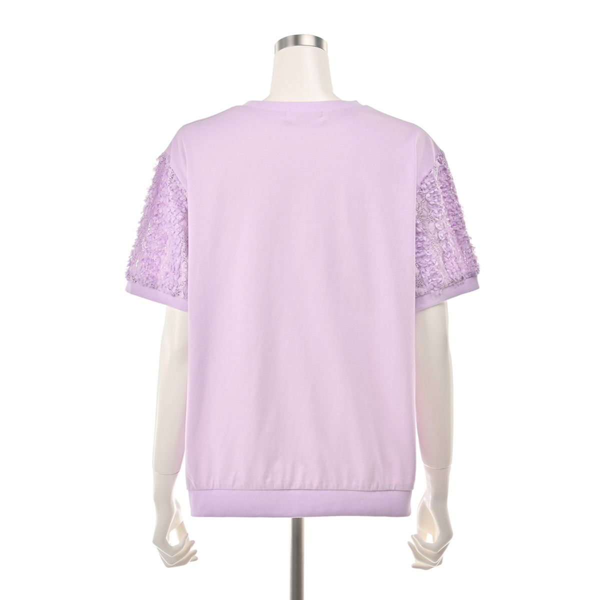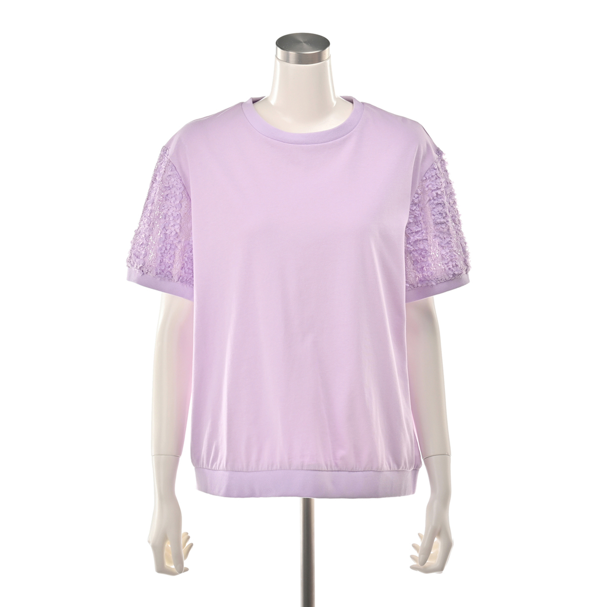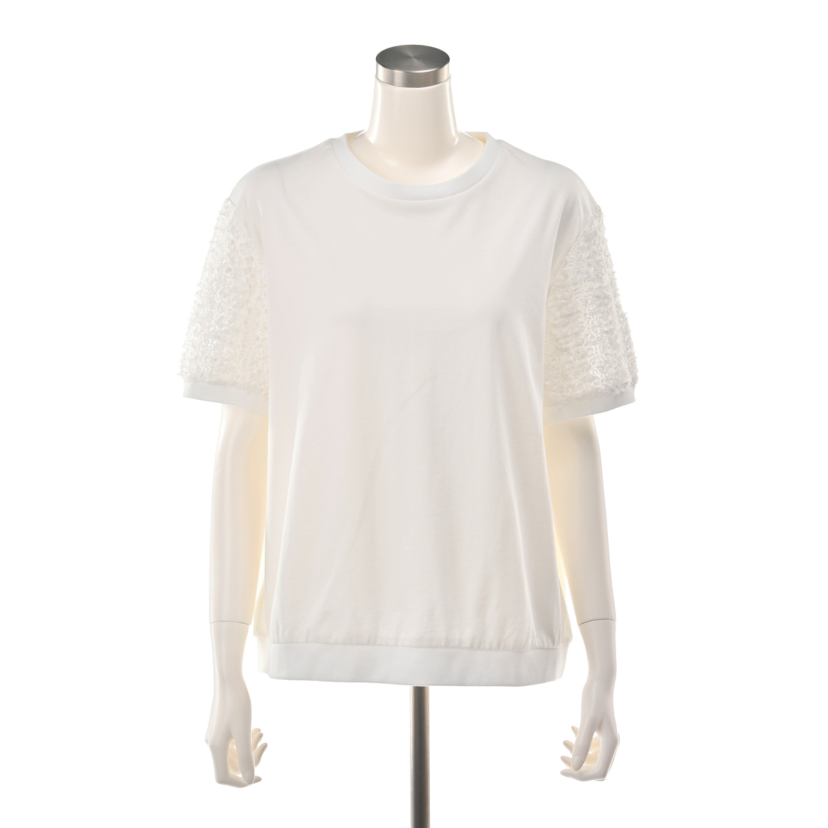 立体的な花モチーフレース袖がポイントのチュニック。レギュラー丈のクルーネックで着やすく、袖には凹凸のある花柄レースを使用。袖口と裾口はフライスで程よく締め、全体のバランスを整えています