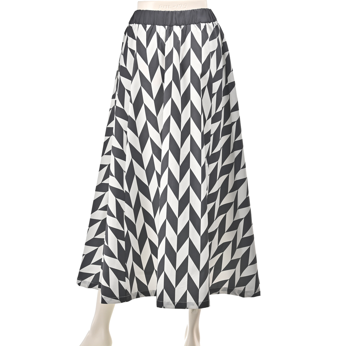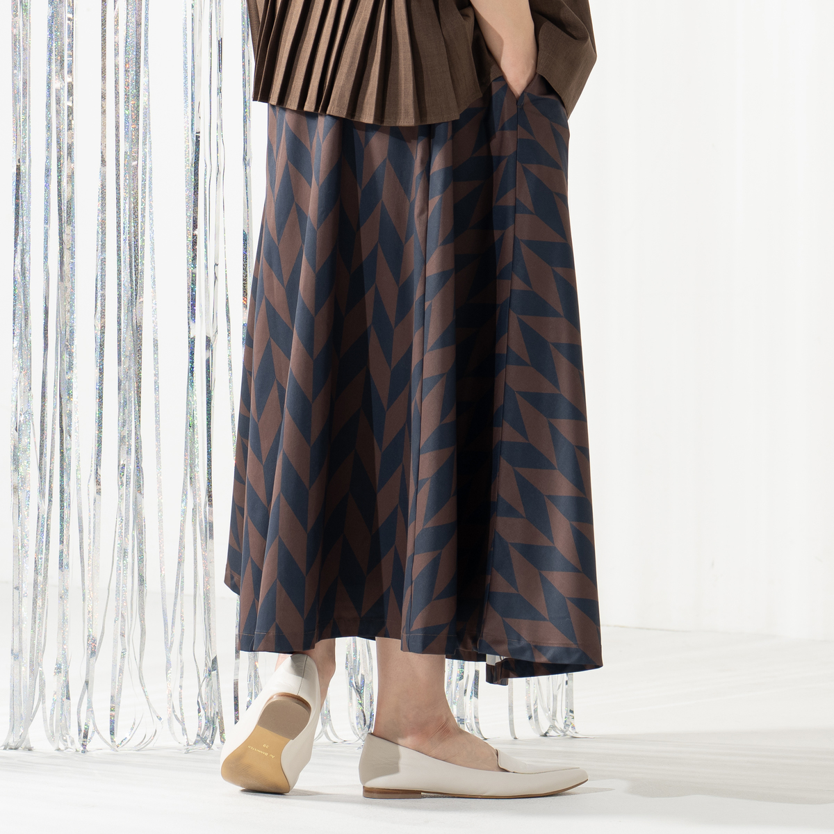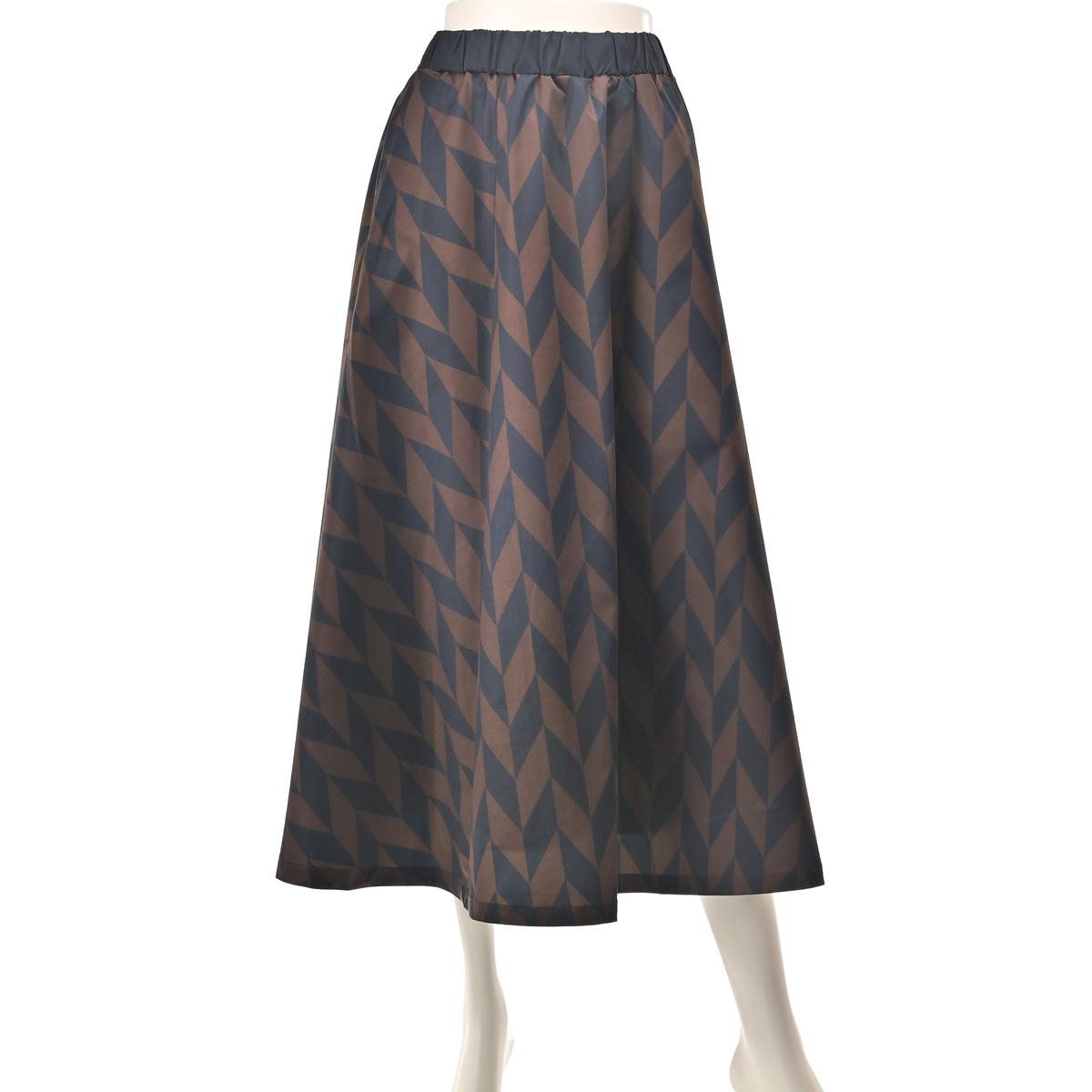 幾何学柄のプリントが目を引くスカートです。ブランドオリジナルの柄と配色が、コーディネートに華やかさをプラス。ウエストはゴム仕様で、楽に穿けながら、洗練されたシルエットを演出します