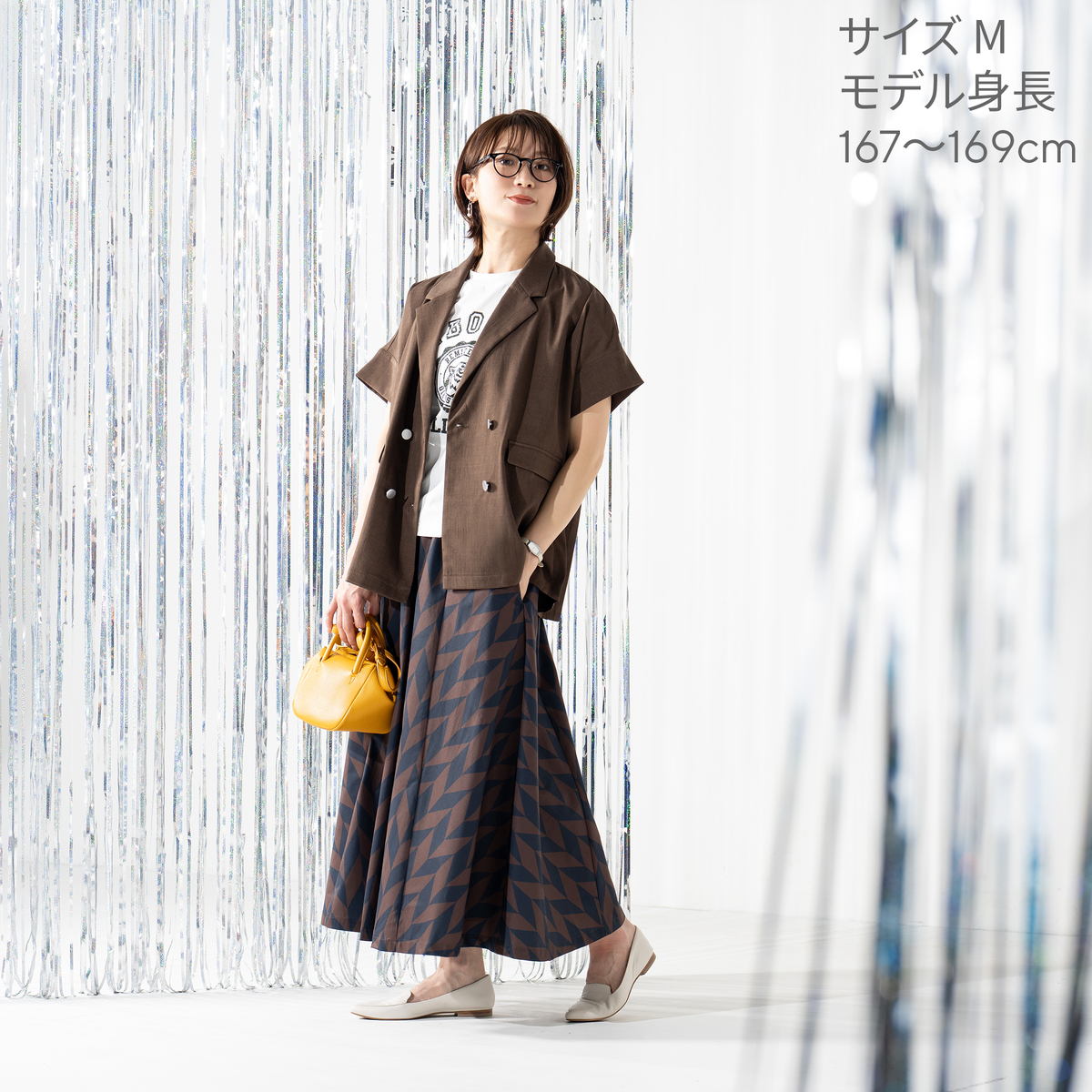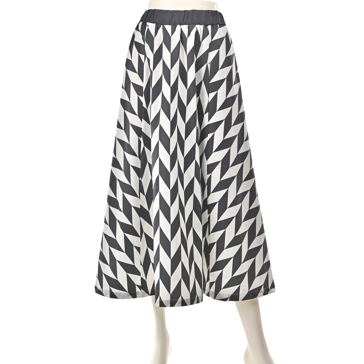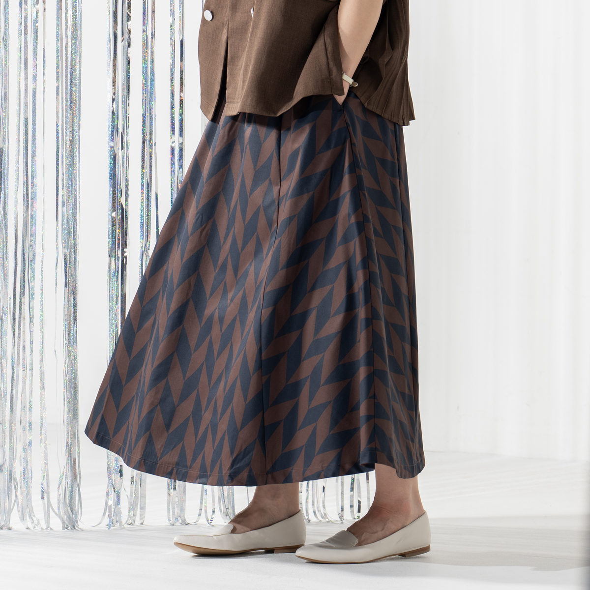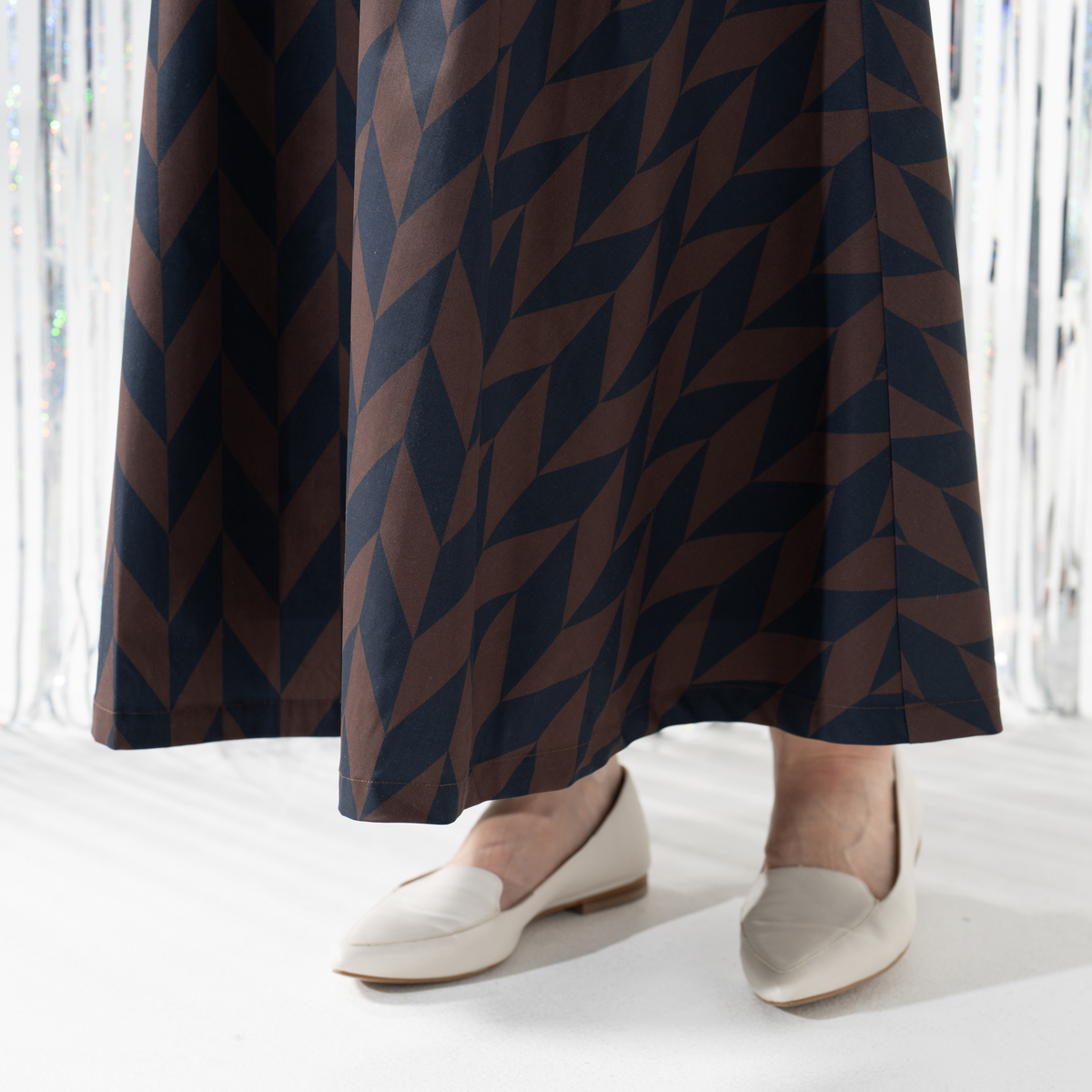 幾何学柄のプリントが目を引くスカートです。ブランドオリジナルの柄と配色が、コーディネートに華やかさをプラス。ウエストはゴム仕様で、楽に穿けながら、洗練されたシルエットを演出します