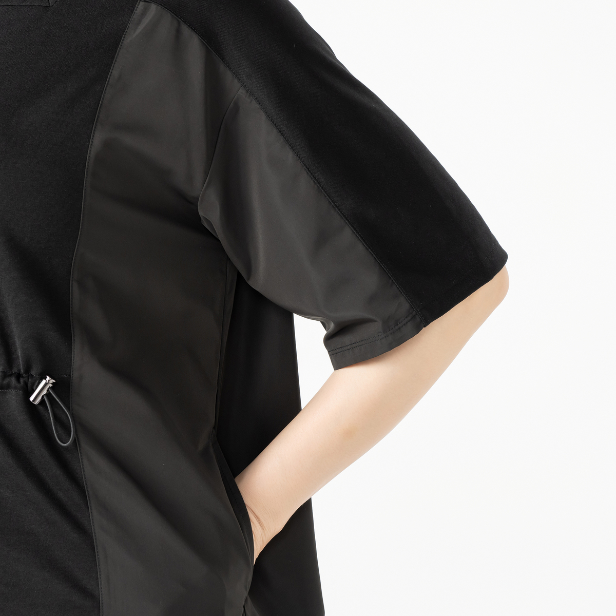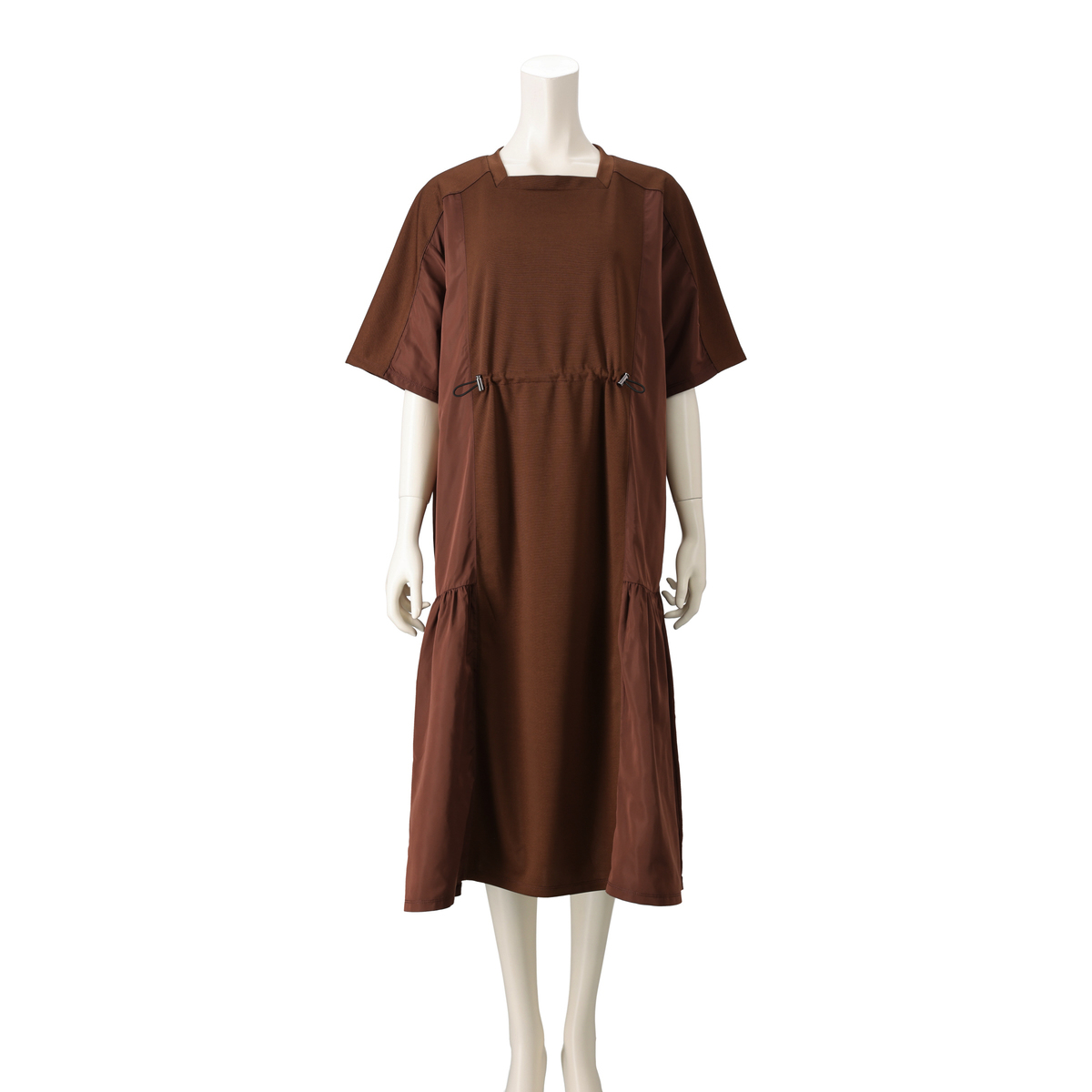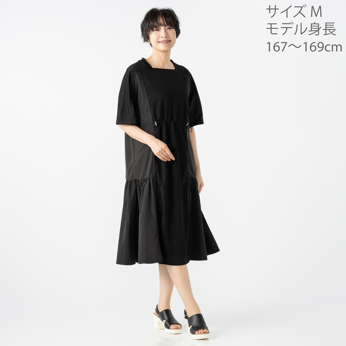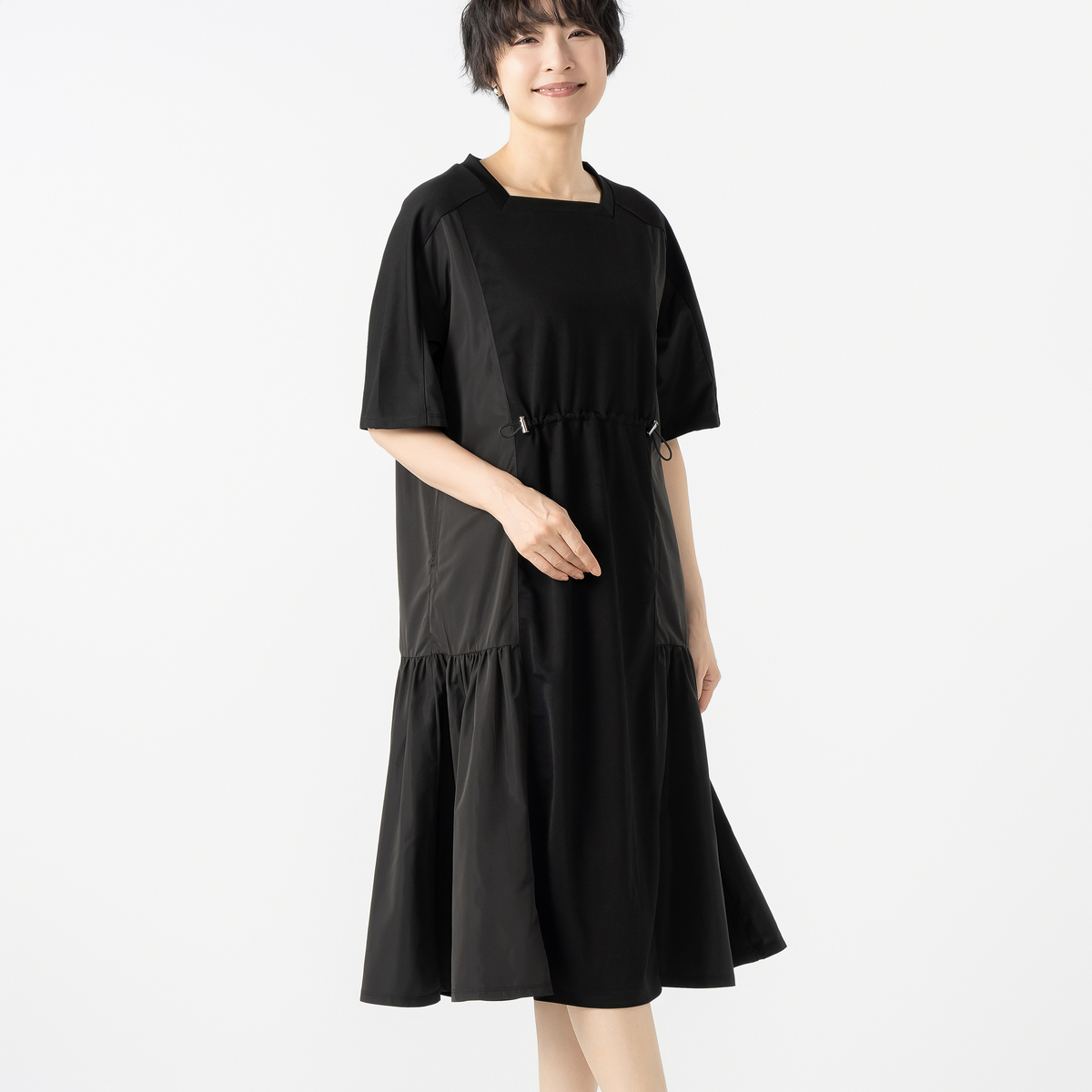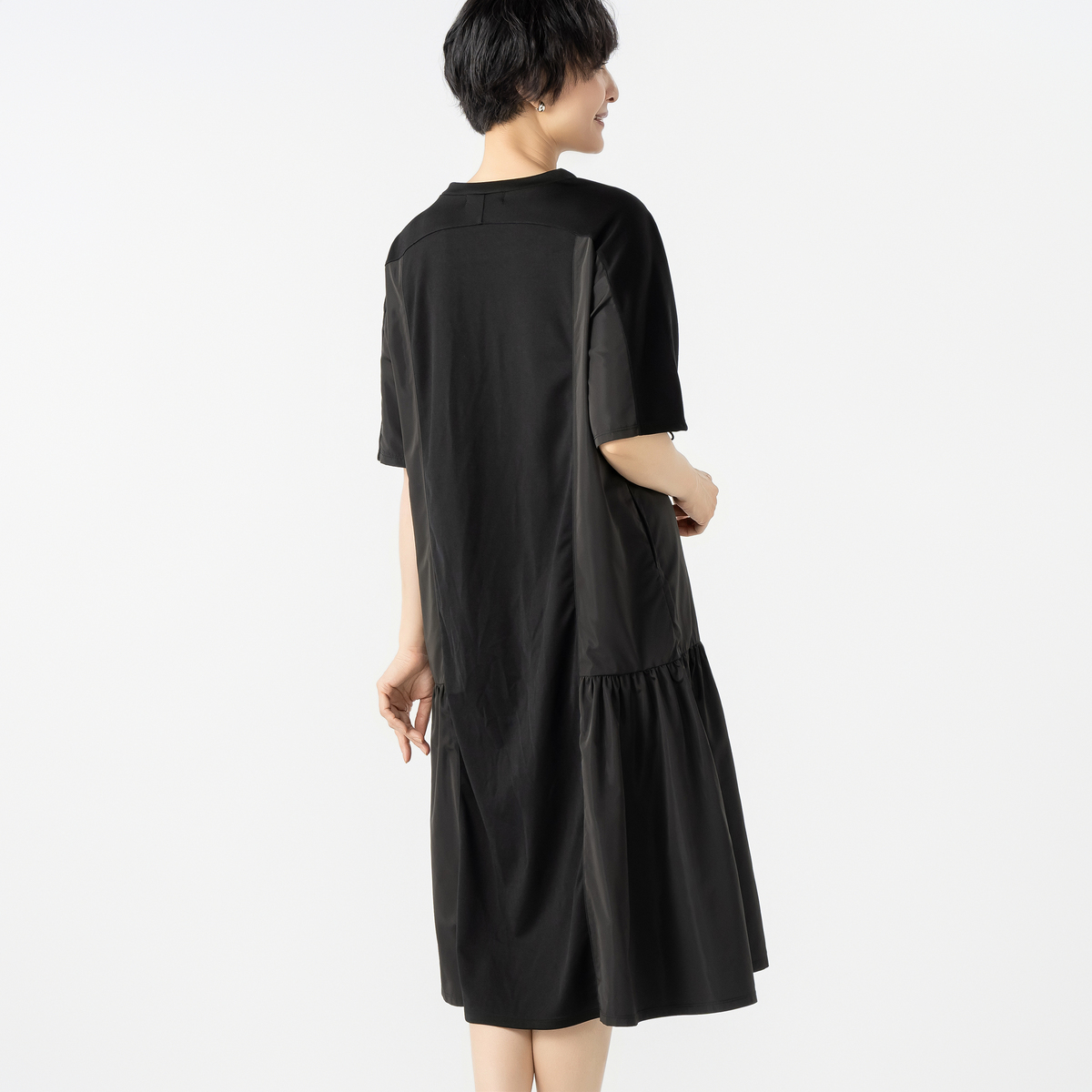 柔らかなカットソーと布帛を組合せたワンピース。細く見えるよう切替位置にこだわりました