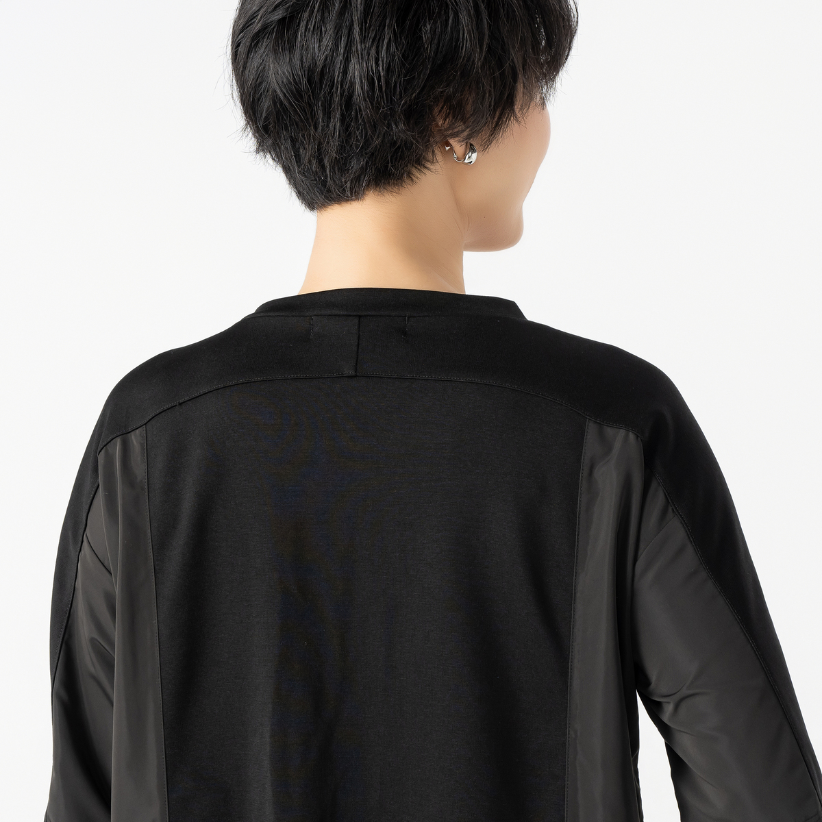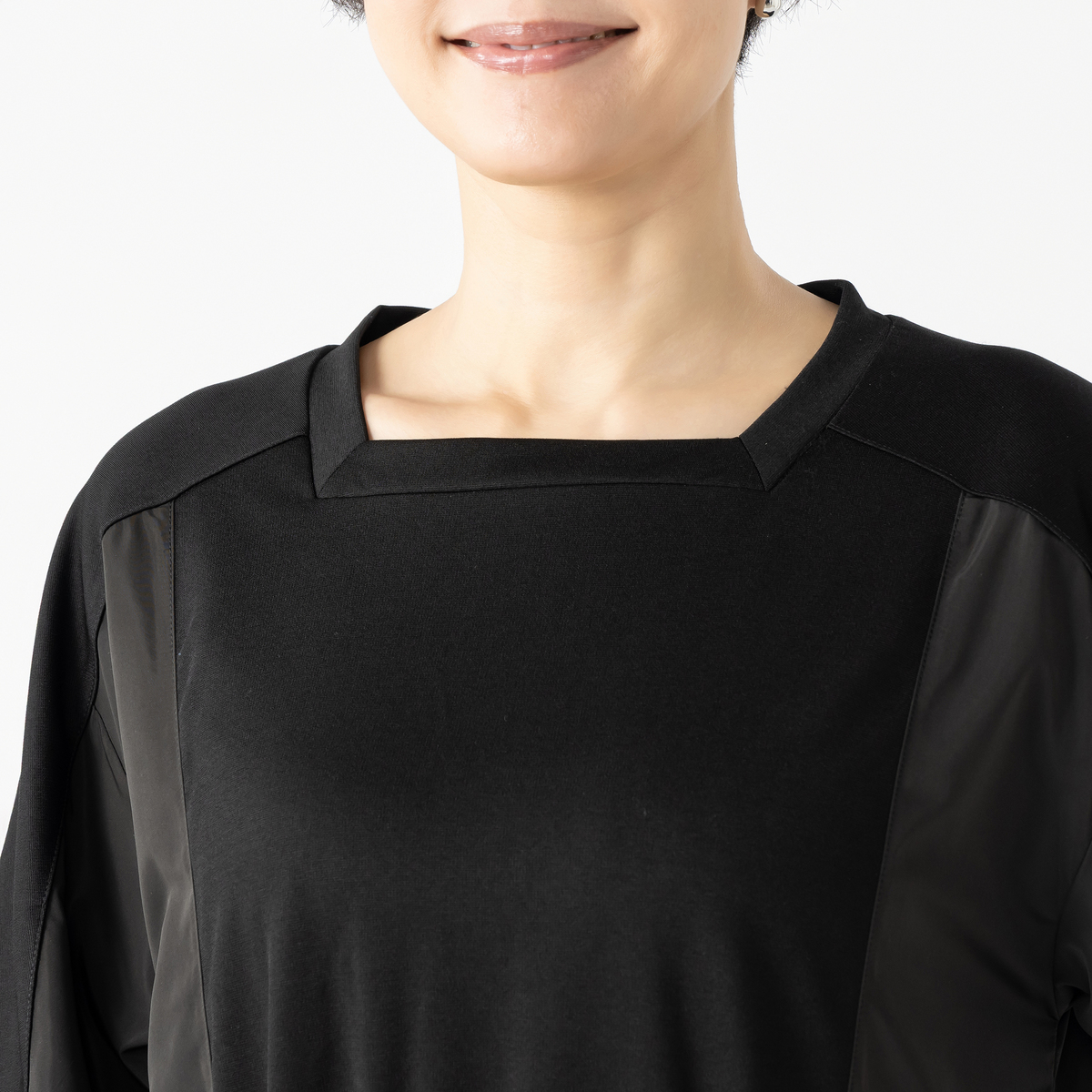身頃と袖に直線の切り替えを入れ、シャープな印象をプラス。裾にかけてギャザーが広がり、動きのあるシルエットが楽しめます