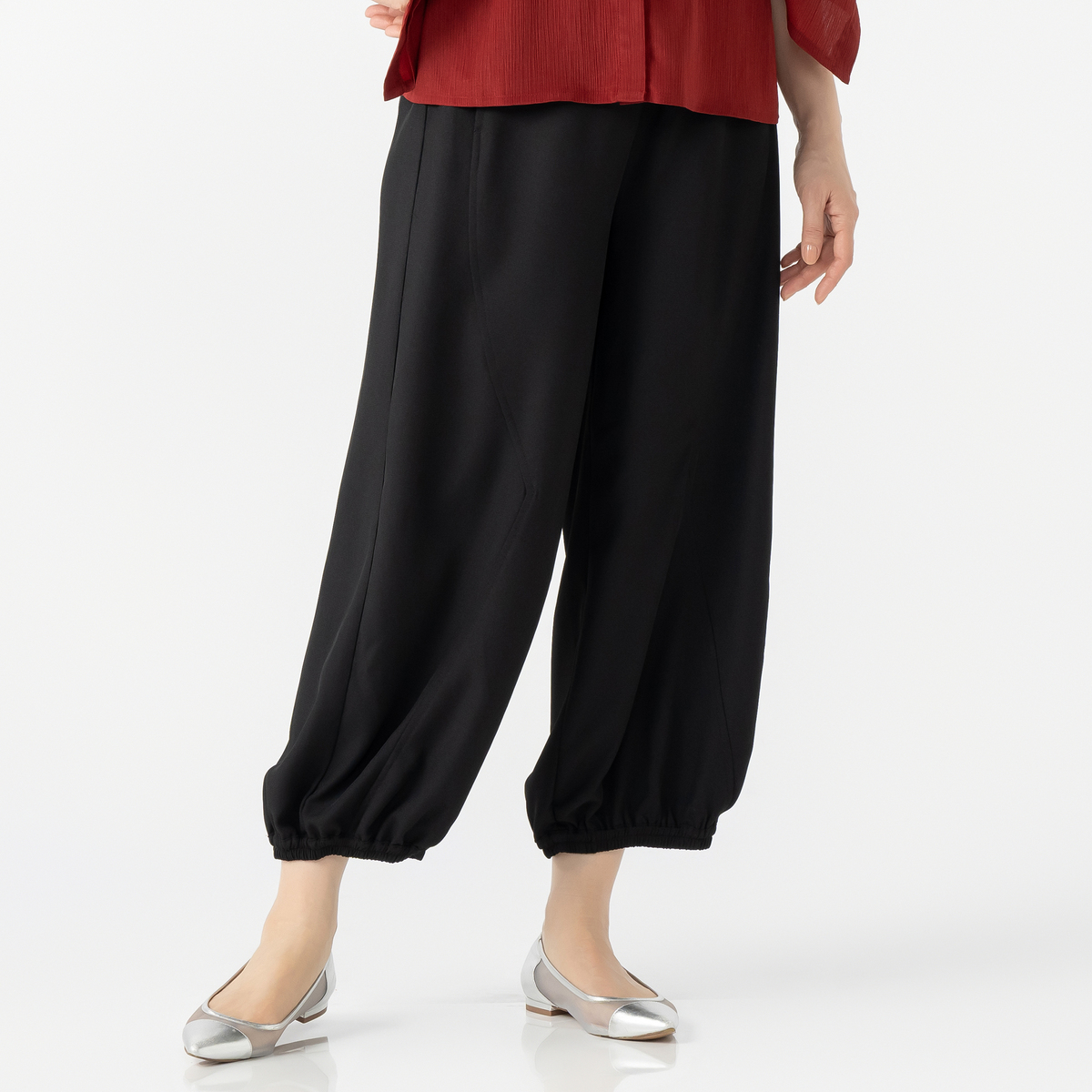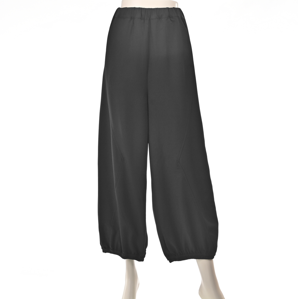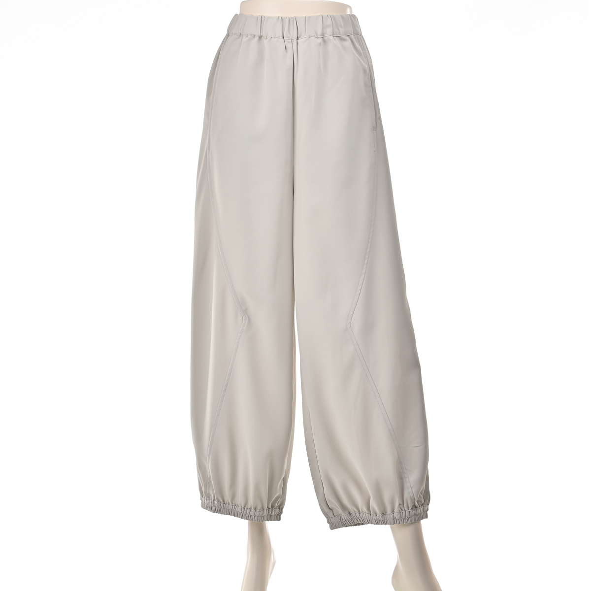 ジグザグ切り替えが印象的なワイドパンツです。裾に配した平ゴムが足元を引き締め、すっきりとしたラインを演出。個性的なシルエットが、装いにアクセントを加えます