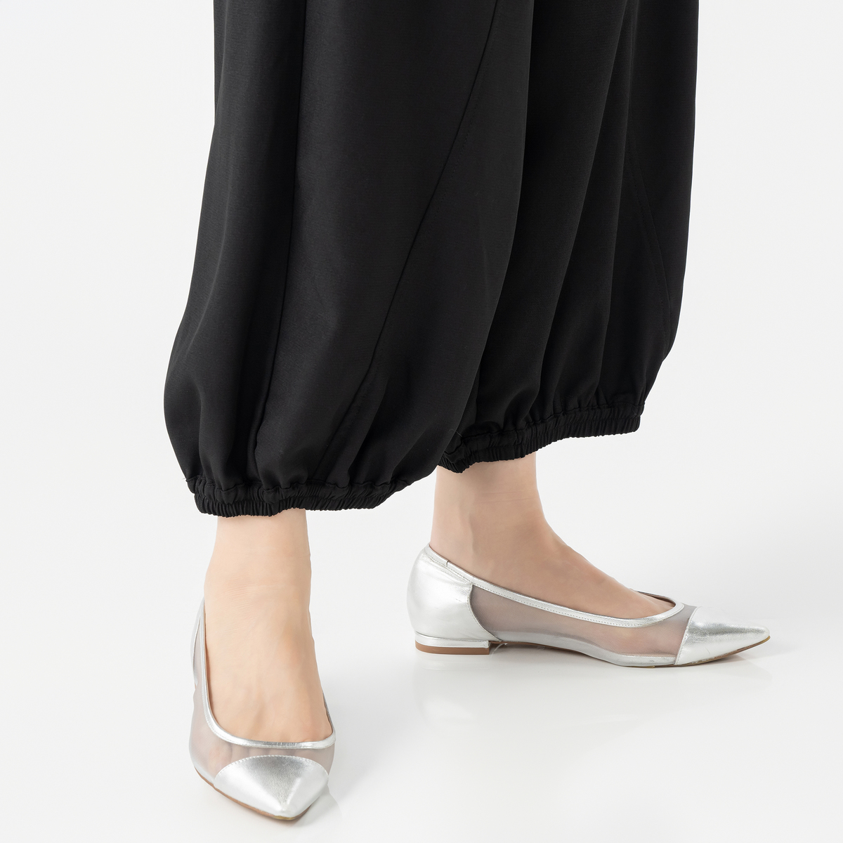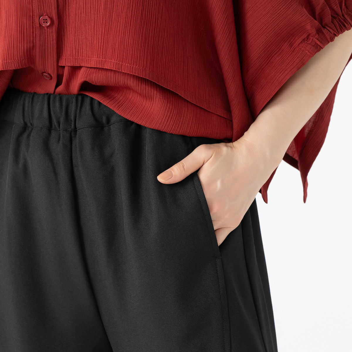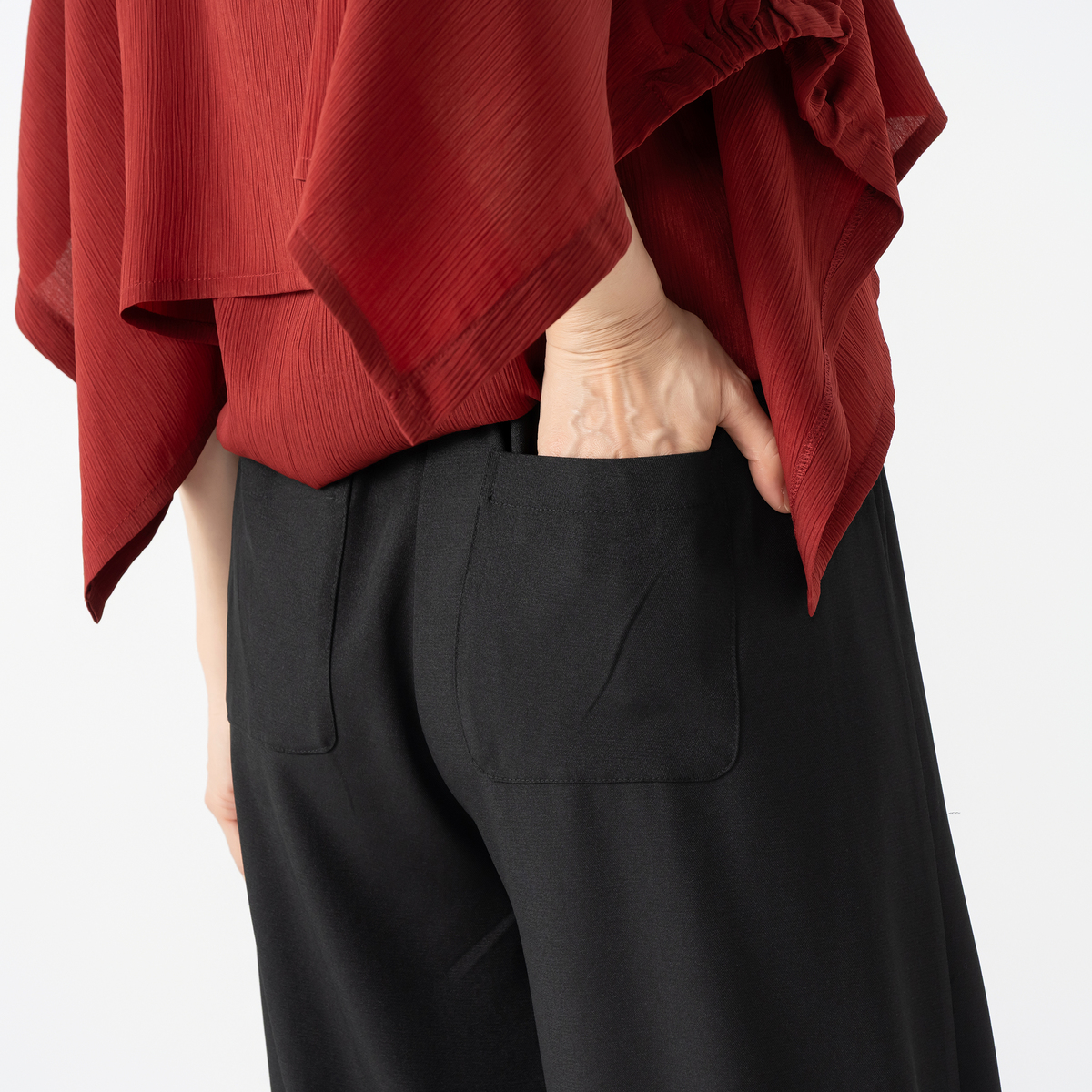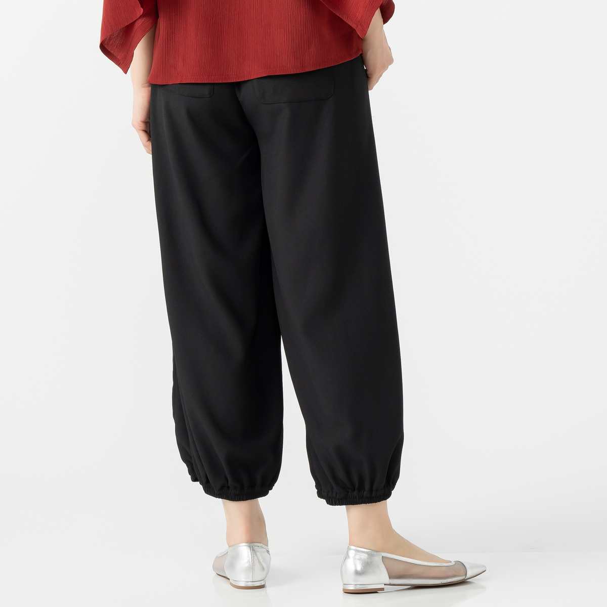 ジグザグ切り替えが印象的なワイドパンツです。裾に配した平ゴムが足元を引き締め、すっきりとしたラインを演出。個性的なシルエットが、装いにアクセントを加えます