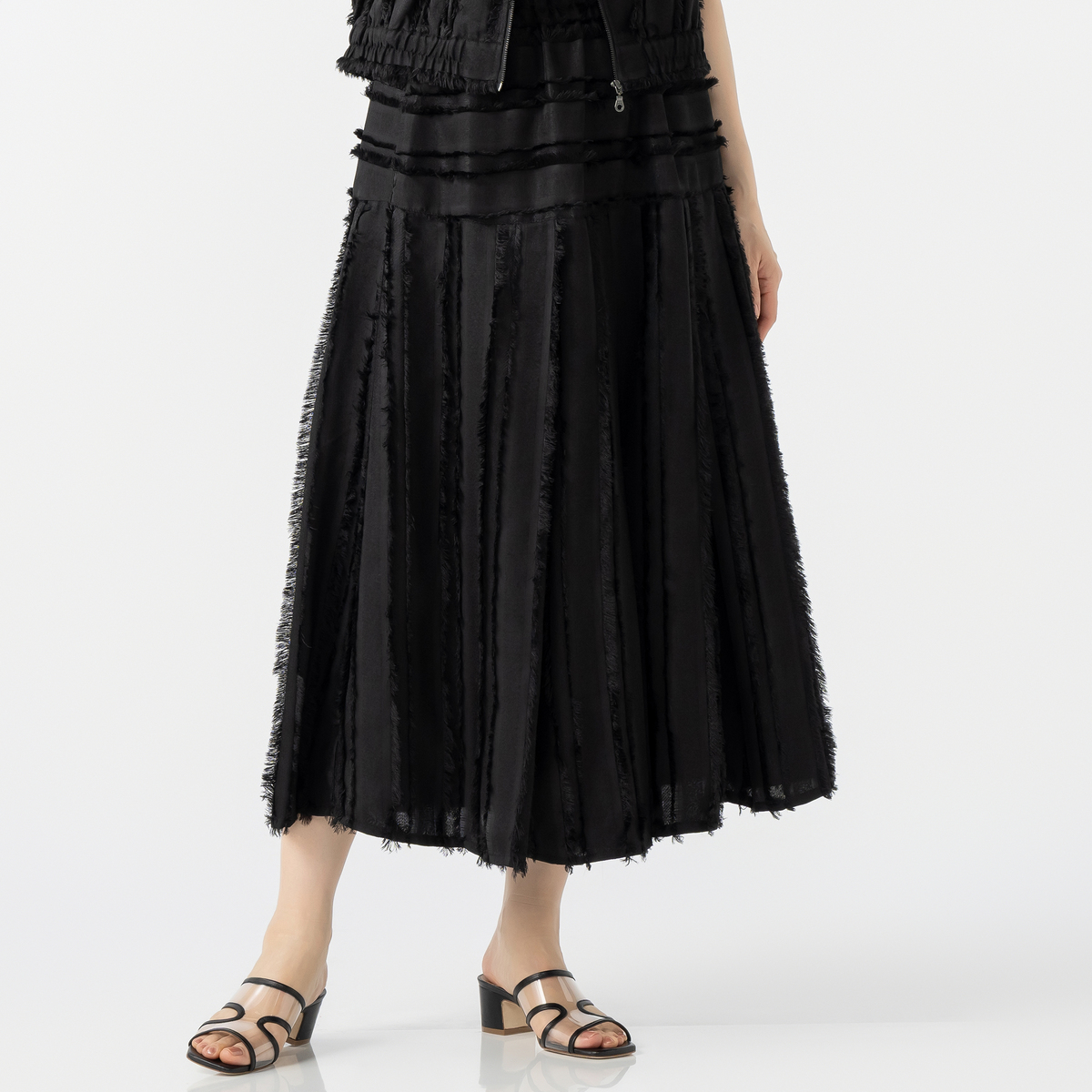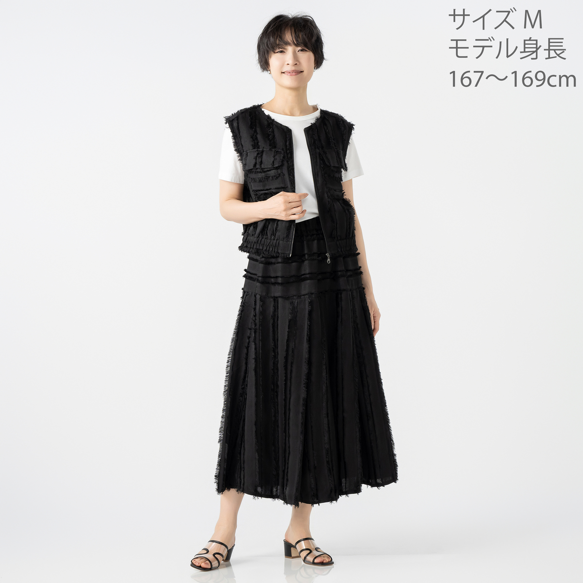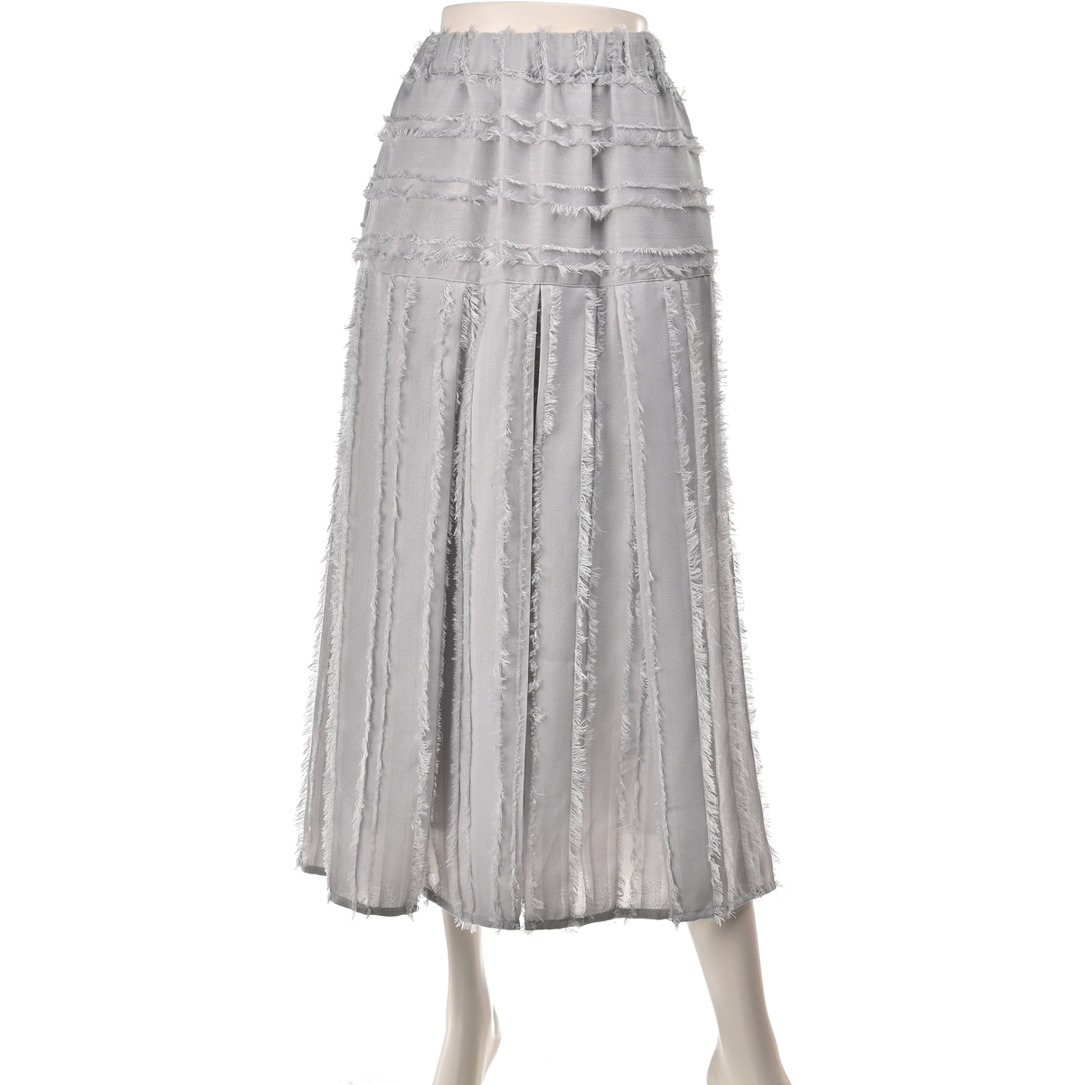華やかなカットジャガードで仕立てたスカート。繊細なフリンジでストライプ柄を立体的に表現しました