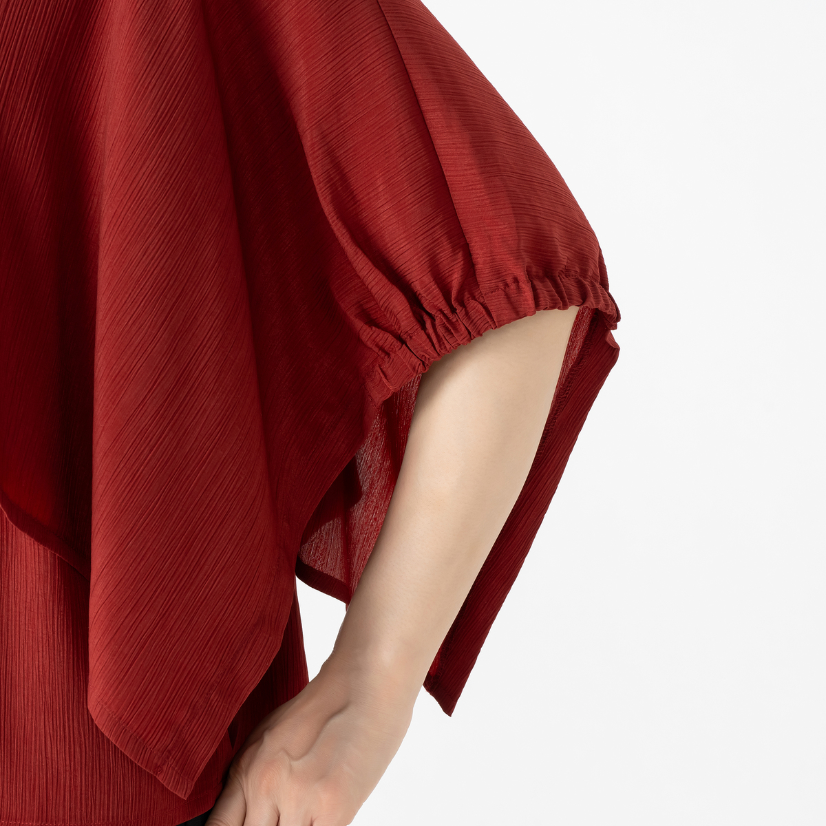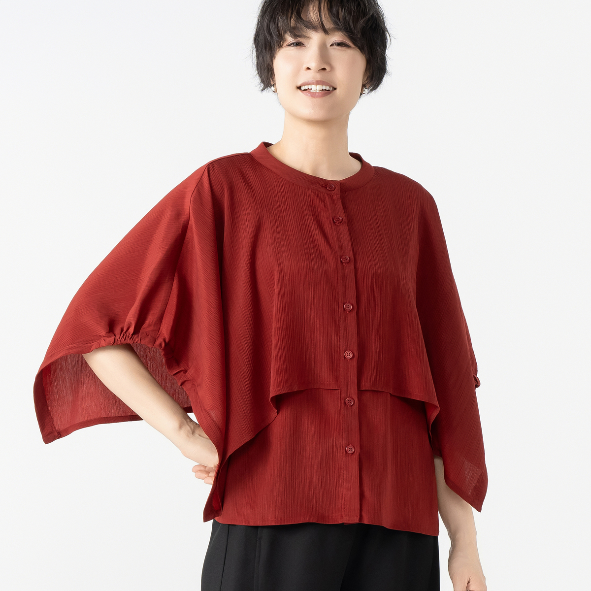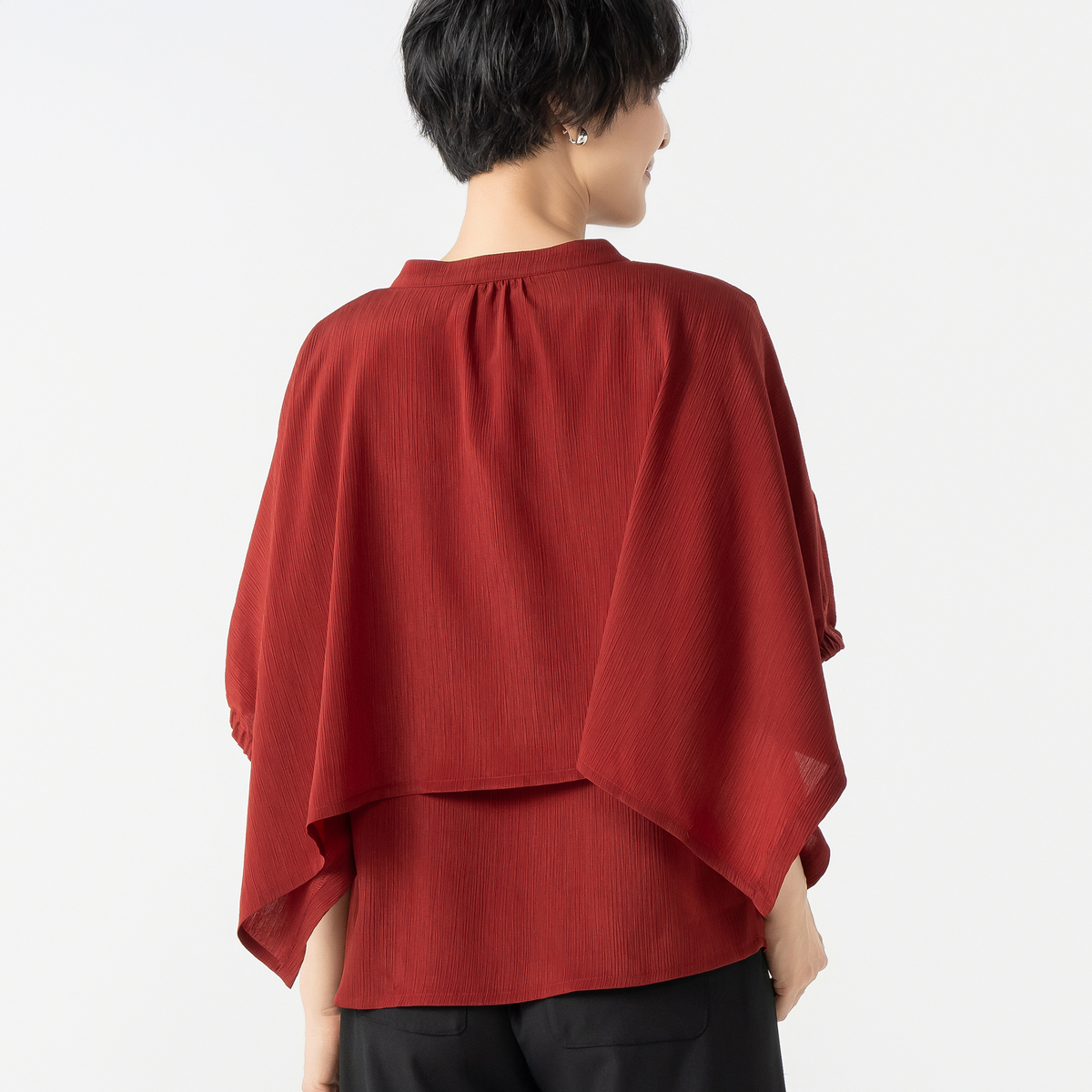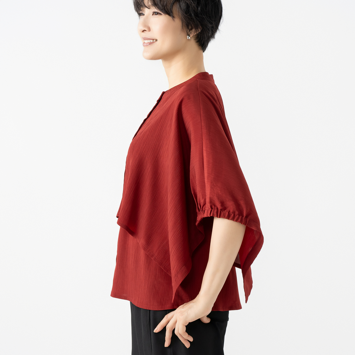 やわらかなレイヤード風デザインのシャツ。ノースリーブの本体にポンチョのような上布を重ねました。ふんわりと広がる上布が動くたびに揺らめき、フェミニンな装いを演出します