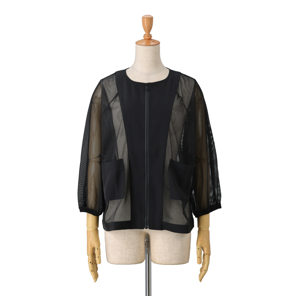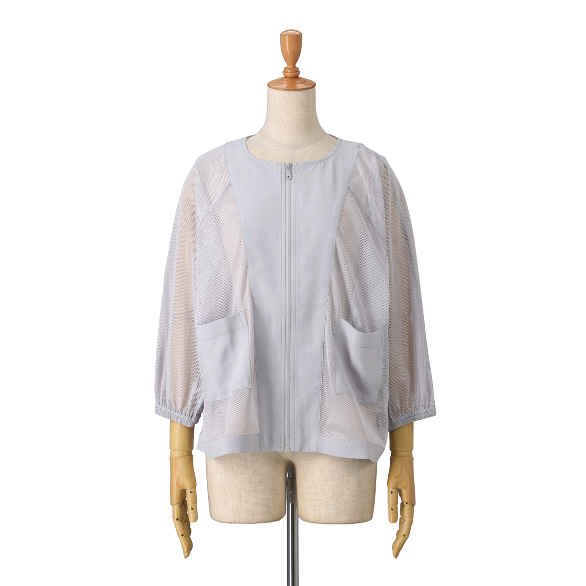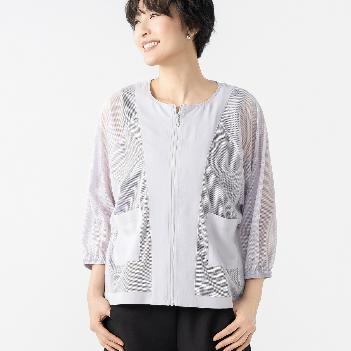 異素材を組合せたメッシュブルゾンです。ゆったりシルエットとドルマンスリーブが動きやすさを引き出し、ボリュームのあるトップスの上からもさっと羽織って、気軽におしゃれをプラスできます
