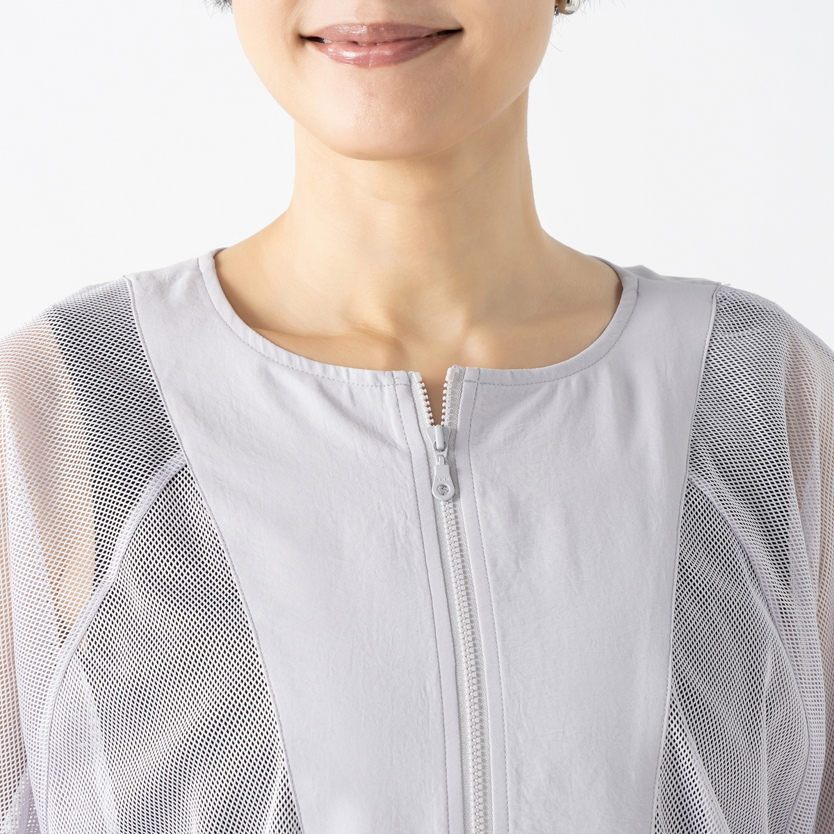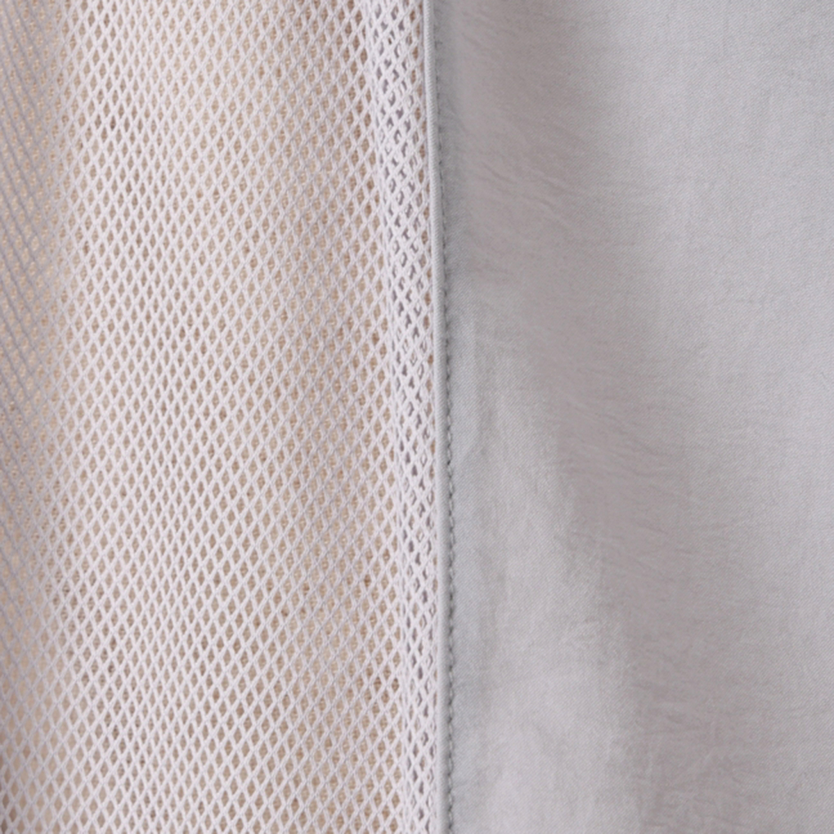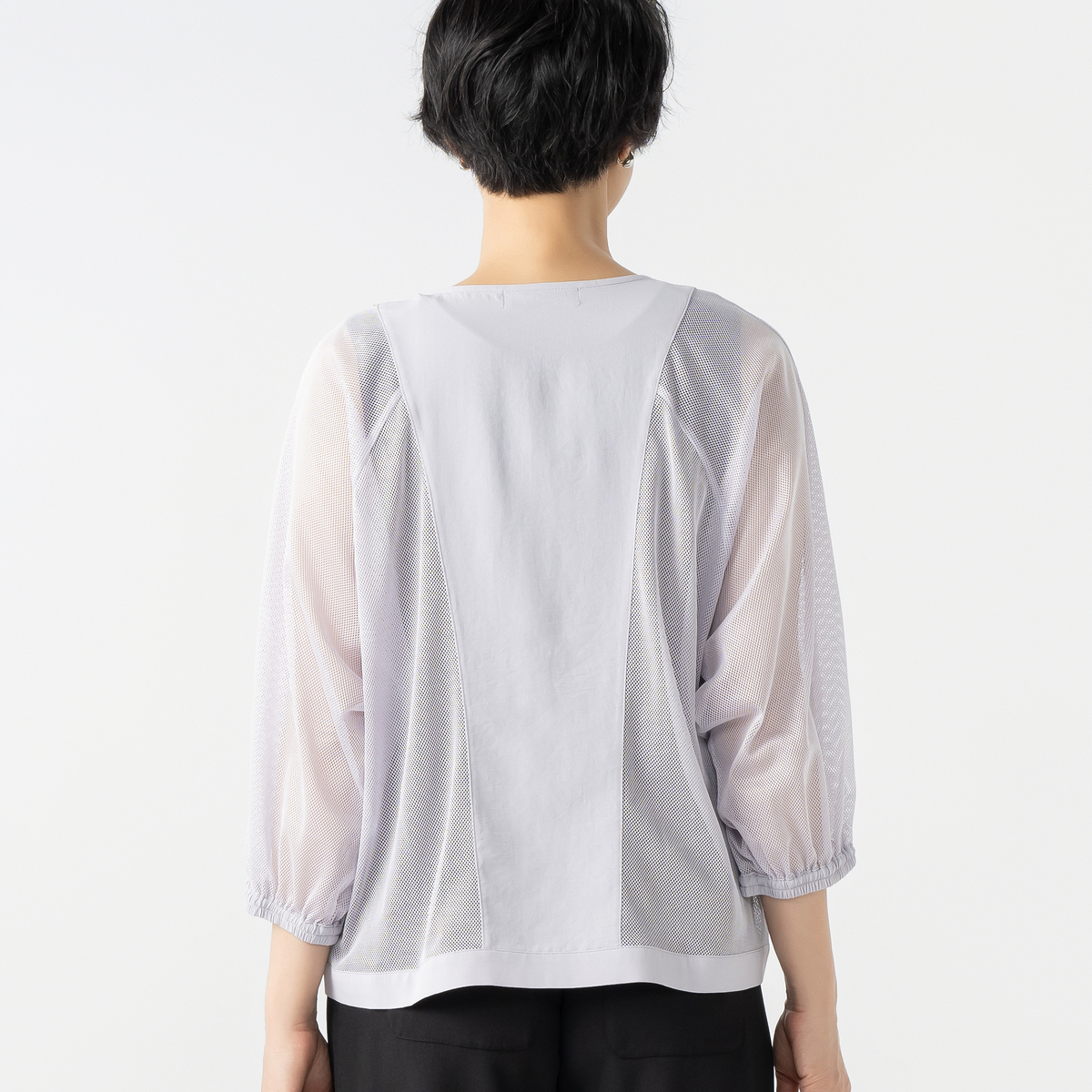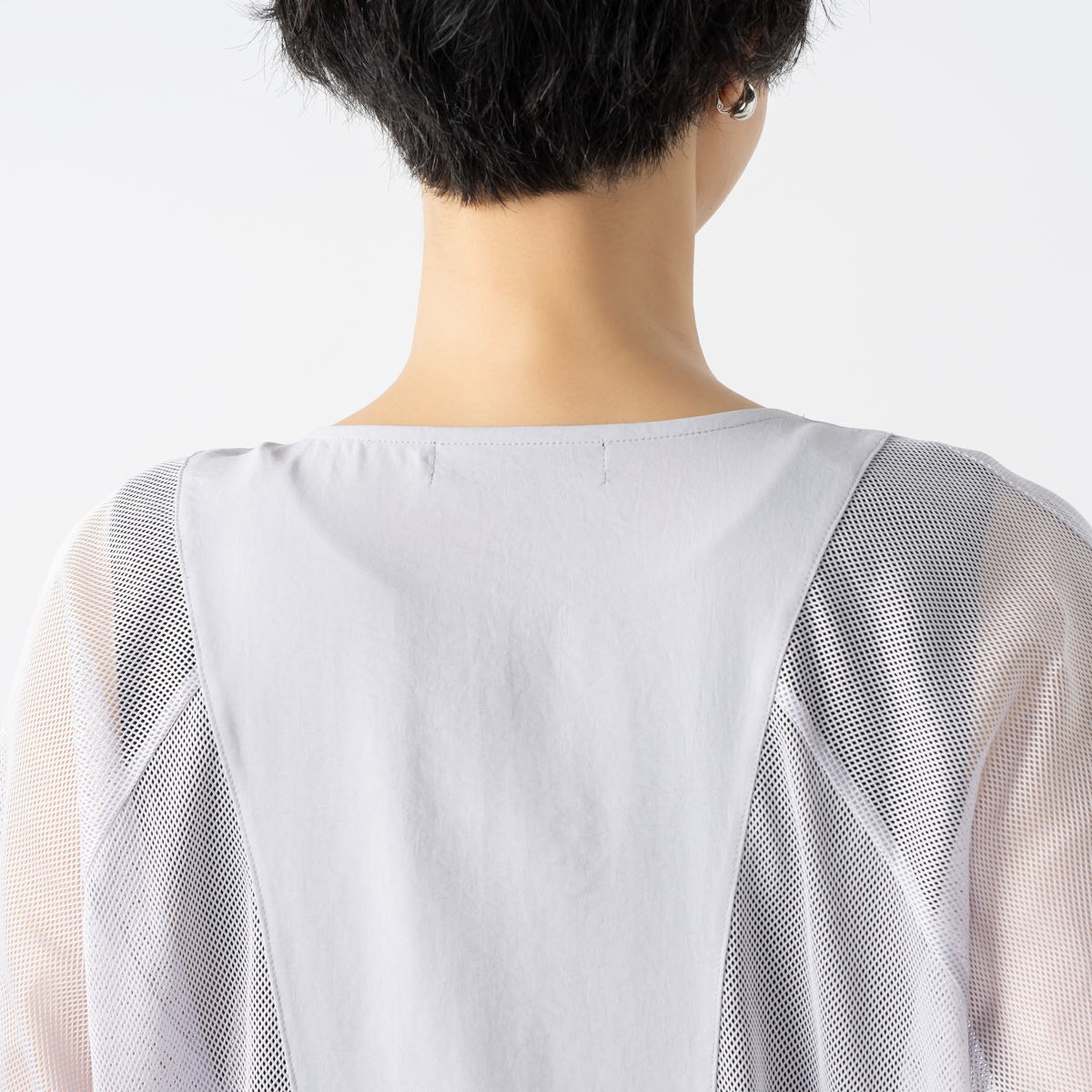 細かなメッシュ生地が上品な透け感を生み、見た目にも涼やか。ポイントに布帛生地を配置してシャープな印象を添え、コーディネートに新鮮さを加えます