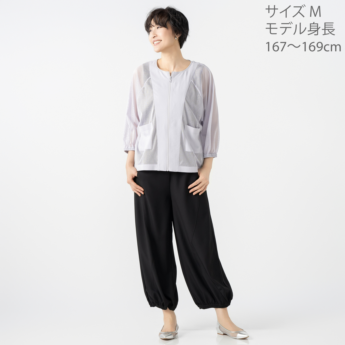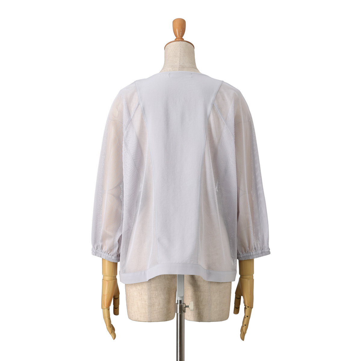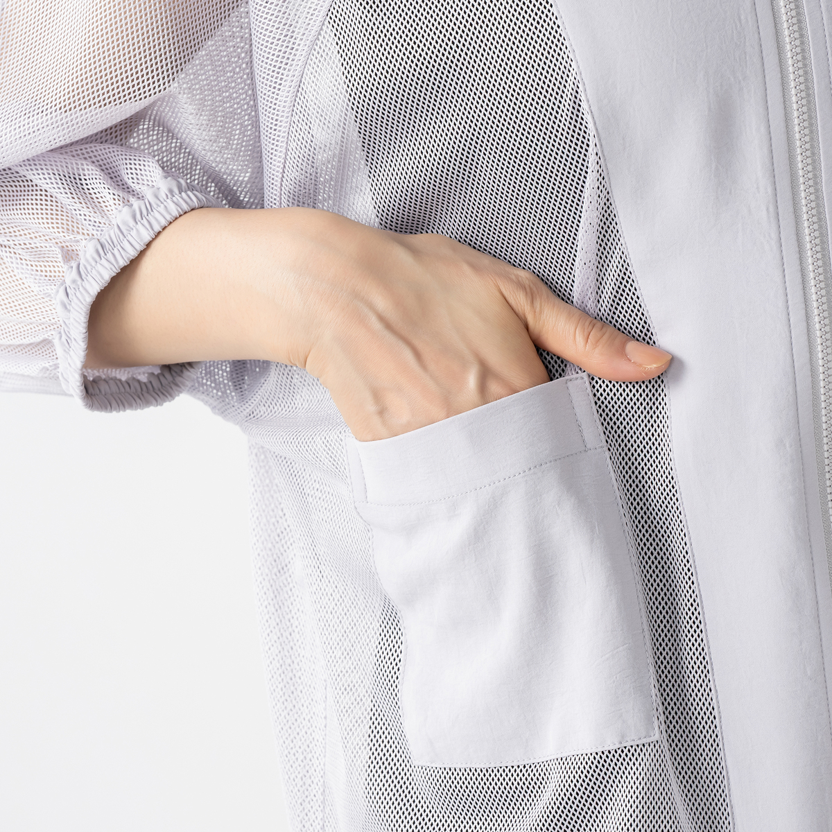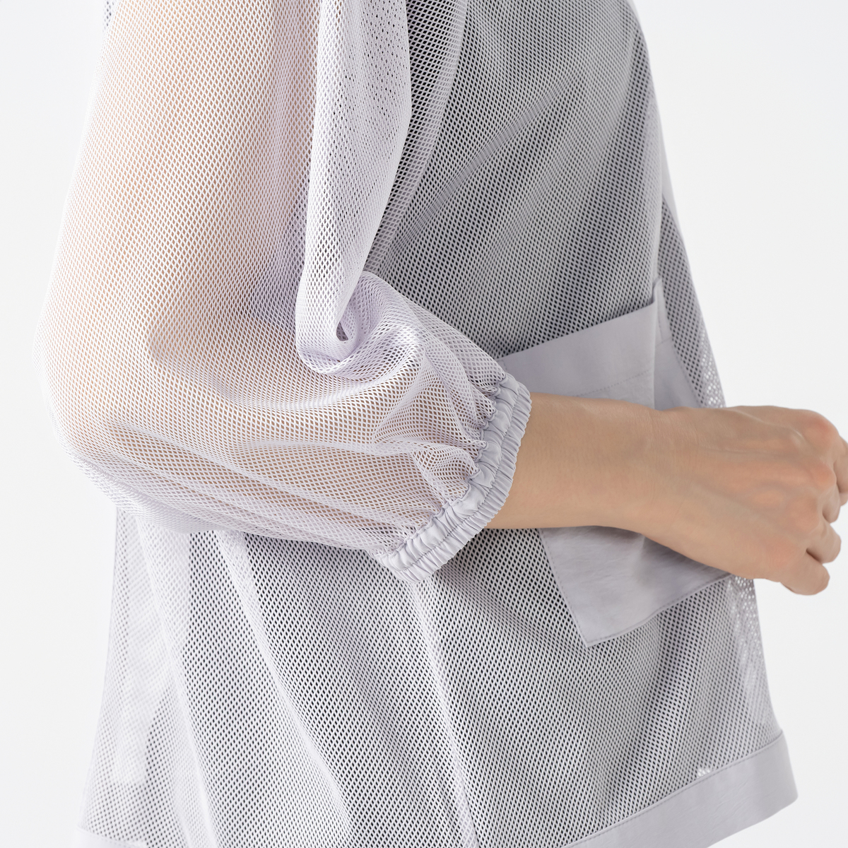 細かなメッシュ生地が上品な透け感を生み、見た目にも涼やか。ポイントに布帛生地を配置してシャープな印象を添え、コーディネートに新鮮さを加えます