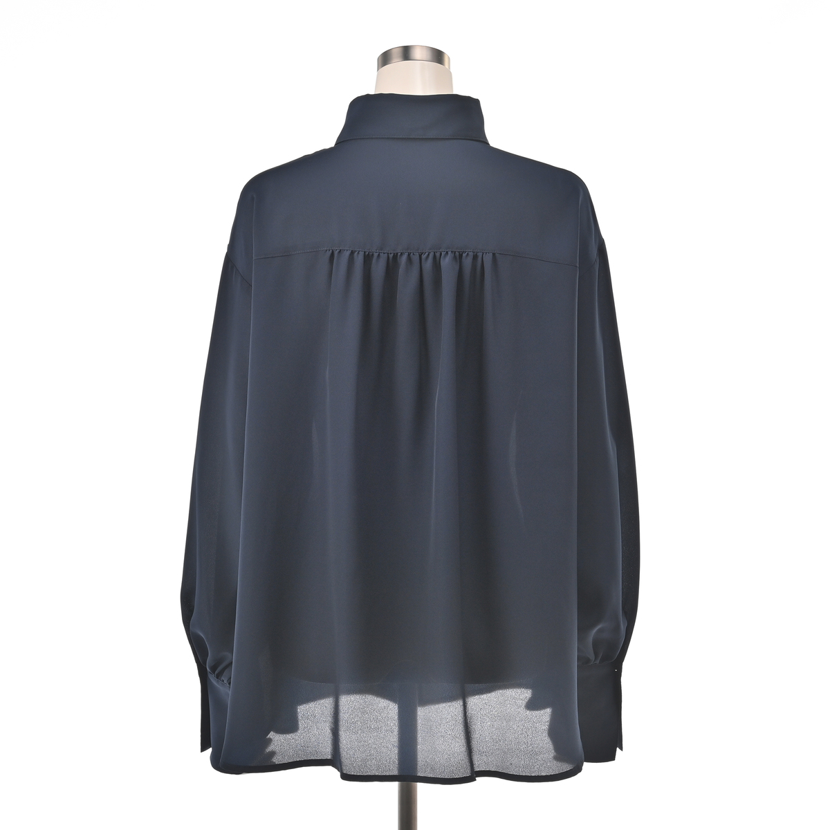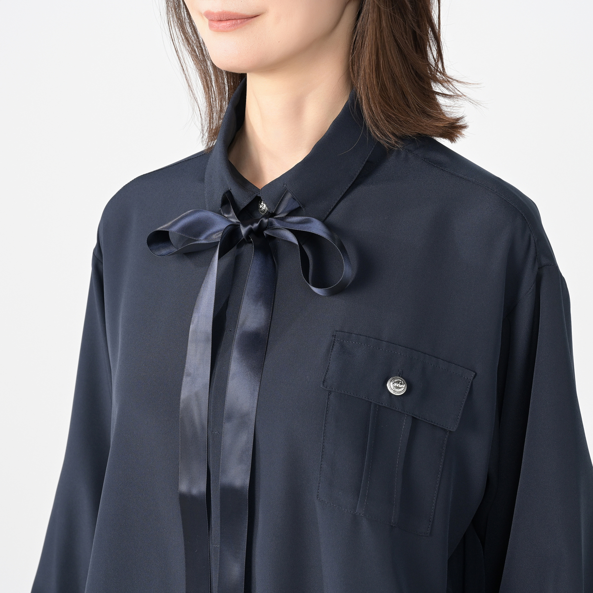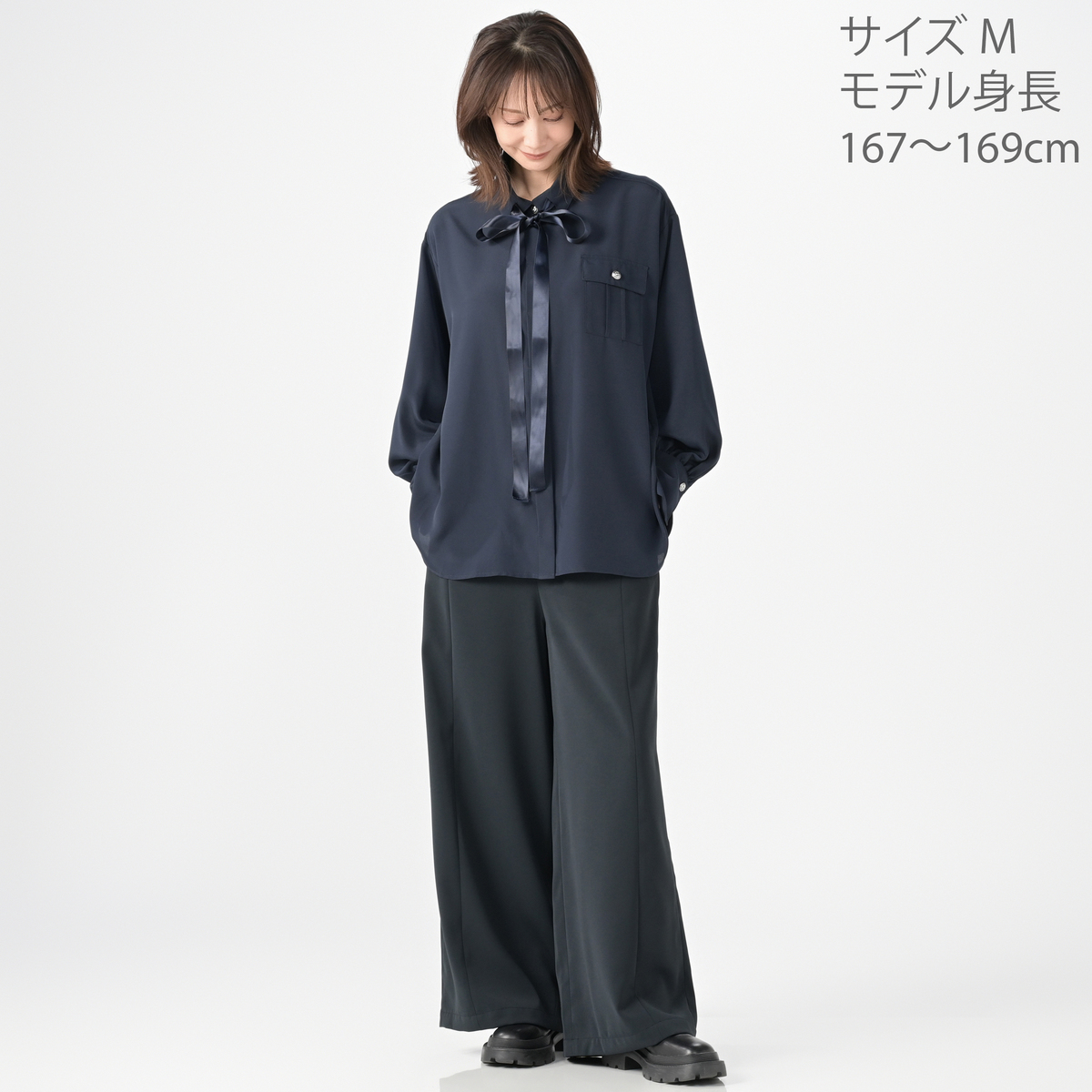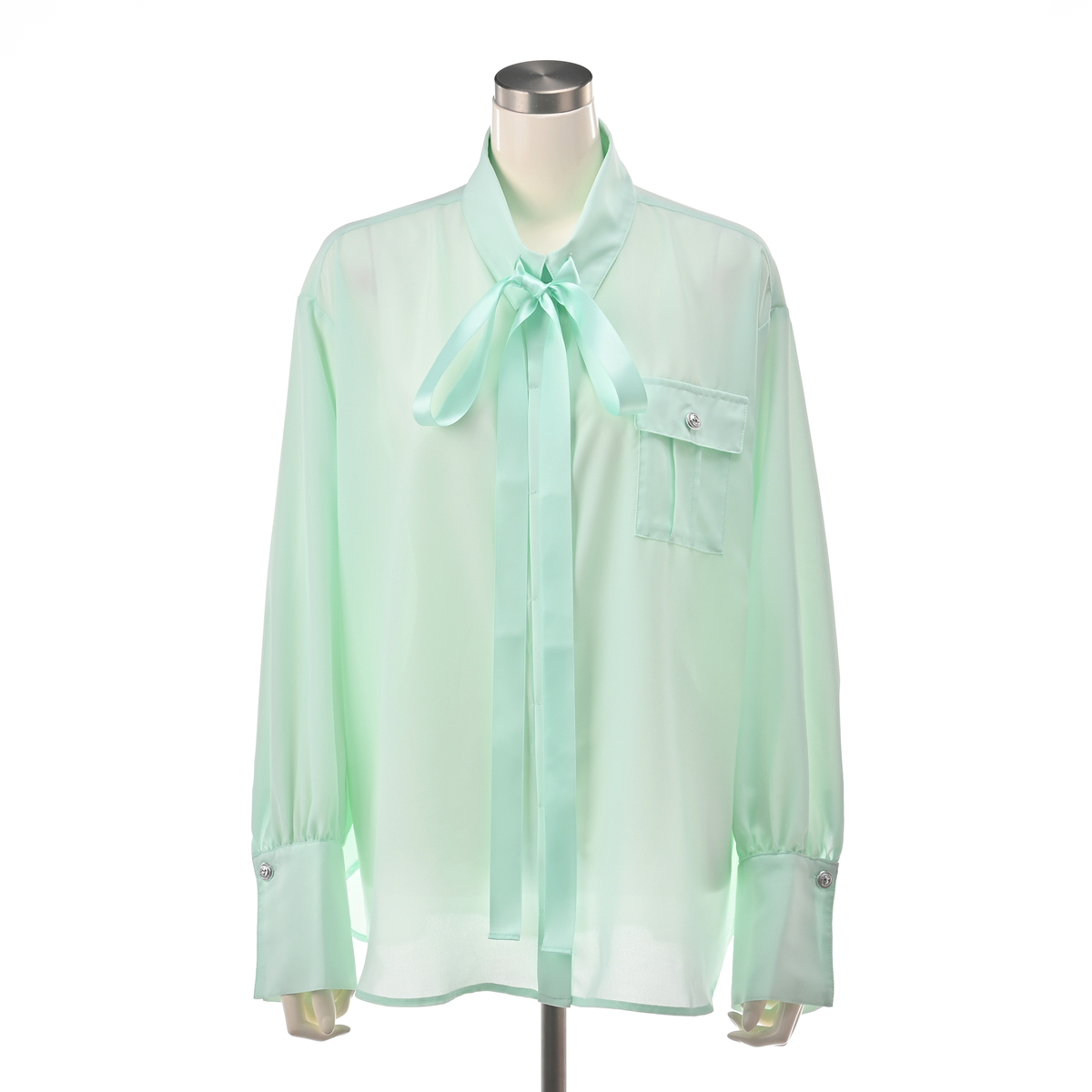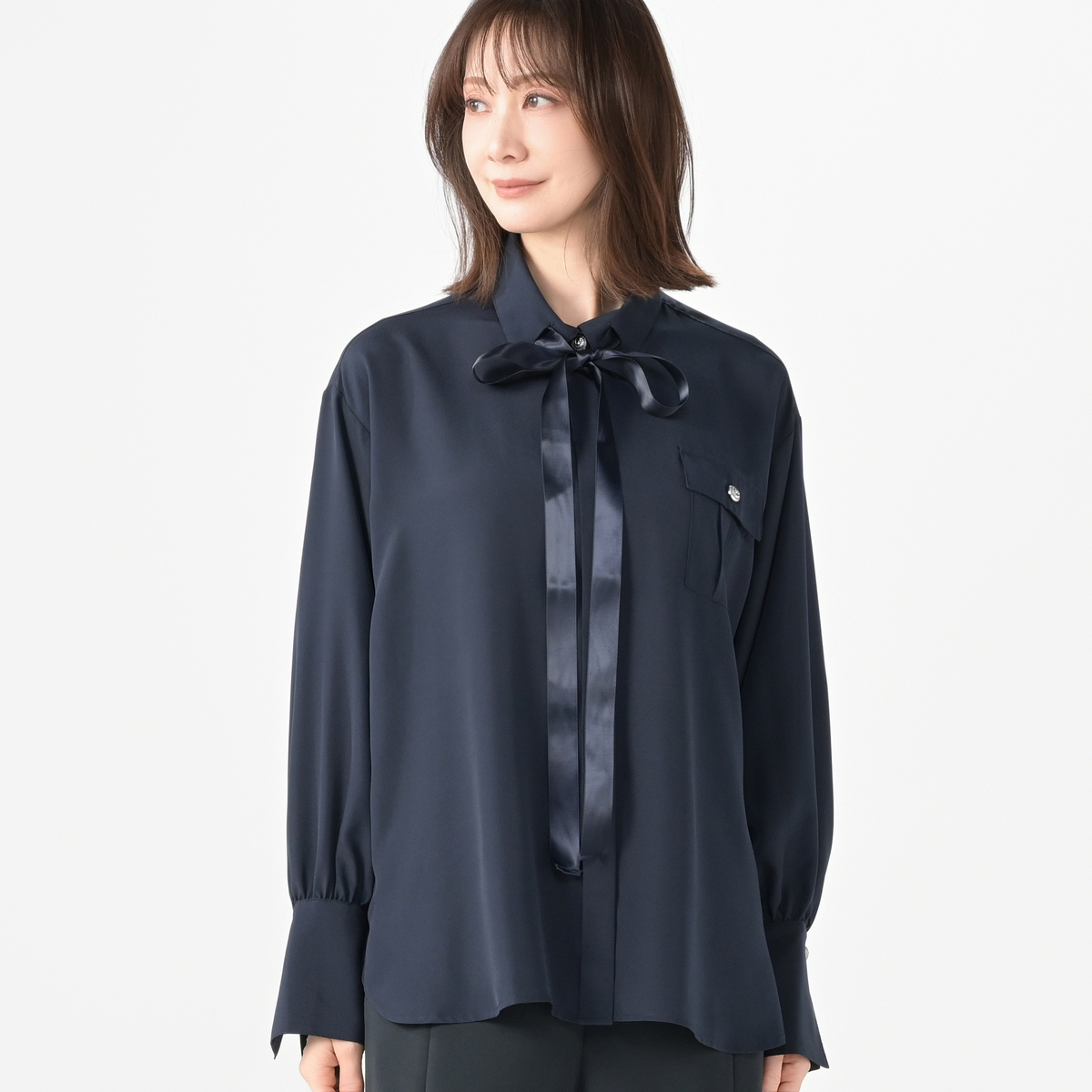 透け感のあるシフォン素材で仕立てたテープリボン付きブラウス。首元のリボンがアクセントとなり、エレガントな雰囲気を演出します