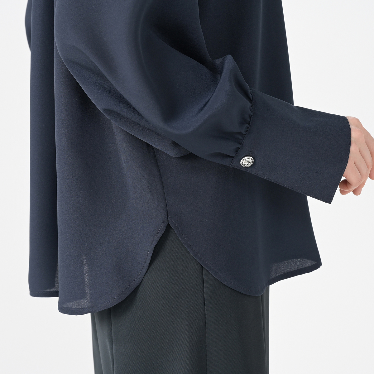 リボンが可愛いと思い購入しました 襟の中にリボンを通して使うブラウスを見たことがなく初めてだったので、購入しました これはとても良いですね デザインだけでなく、襟にリボンを通すことによってリボンが表に出て主張してくれるので、ジャケットの下に隠れてしまわず良かったです サイズ感は少しだけ大きく感じました L Lサイズでも良かったかなと思いましたが、このままいただきます こんなブラウスは初めてだったので、着用するのが とても楽しみです