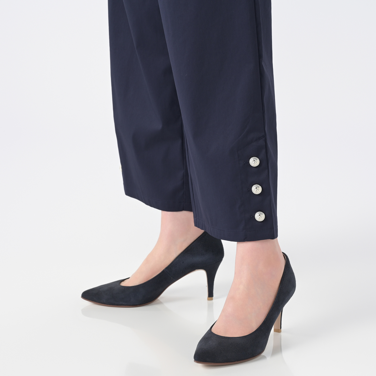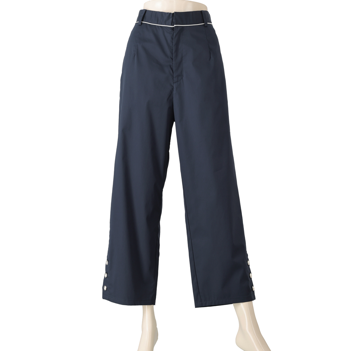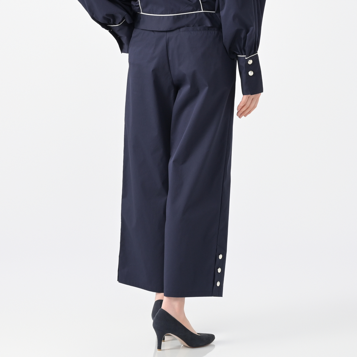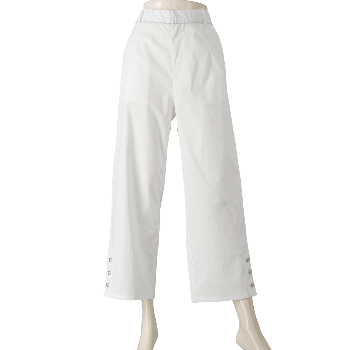 軽やかに穿けるセミテーパードパンツ。くるぶし丈で足もとがすっきり見えるバランスです。ストレッチ性があり動きやすく、左右脇のポケットも便利。左右脇にはベンツ、裾にはボタンをあしらい、控えめなアクセントを添えています