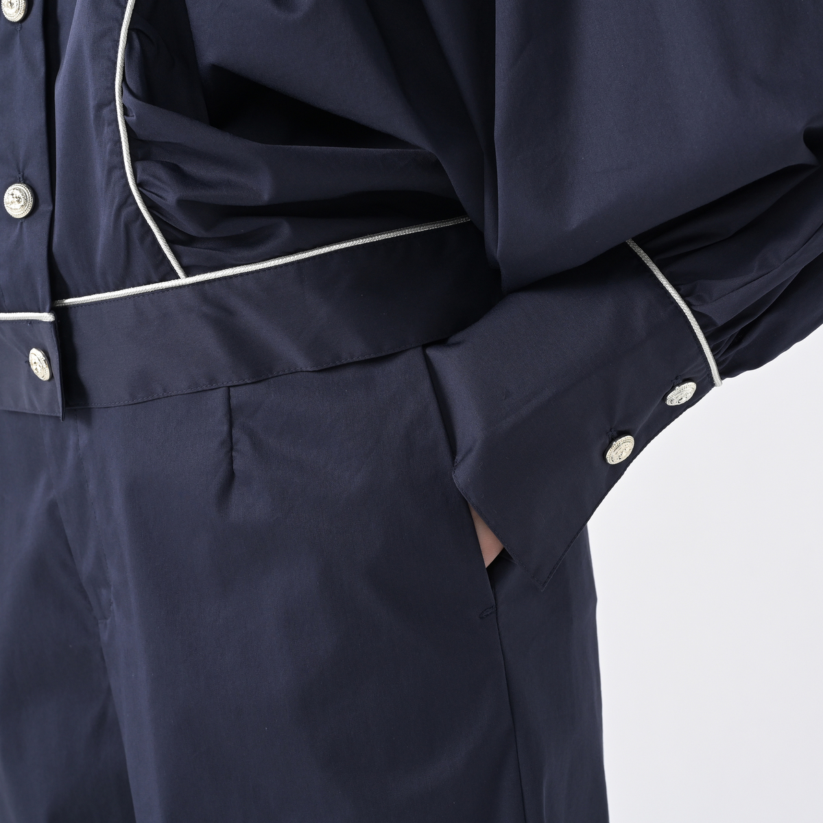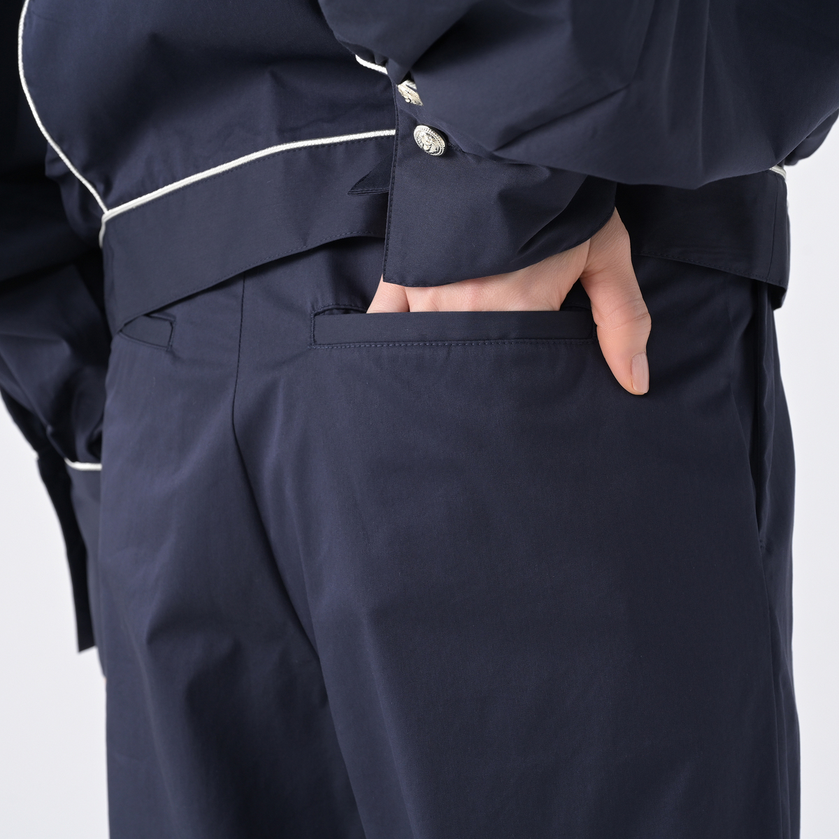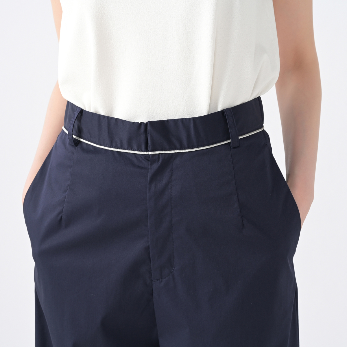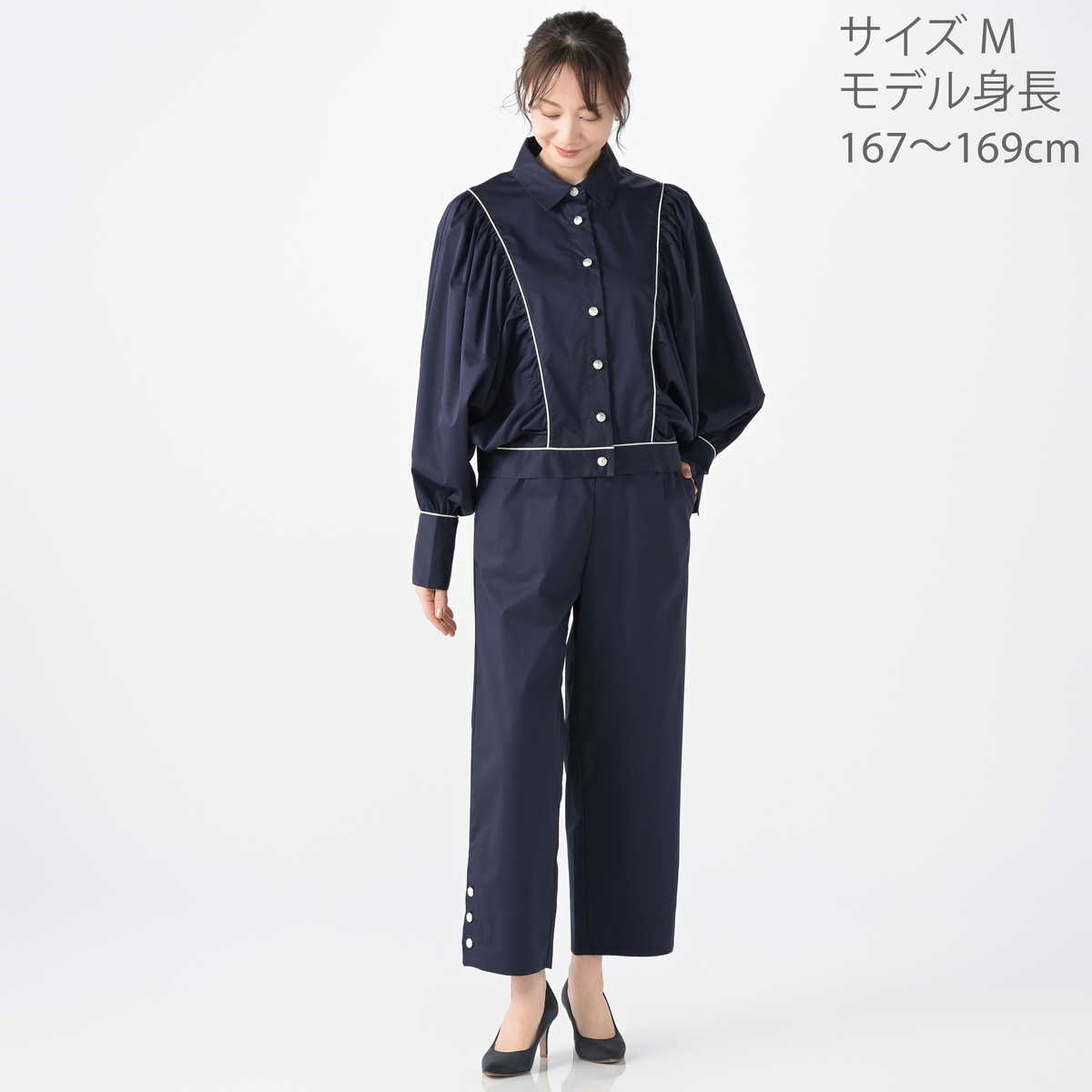 軽やかに穿けるセミテーパードパンツ。くるぶし丈で足もとがすっきり見えるバランスです。ストレッチ性があり動きやすく、左右脇のポケットも便利。左右脇にはベンツ、裾にはボタンをあしらい、控えめなアクセントを添えています
