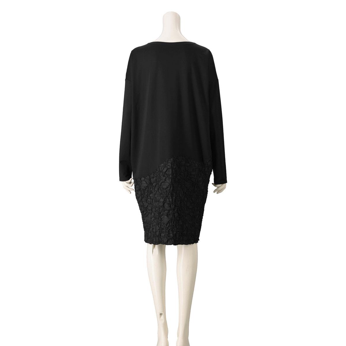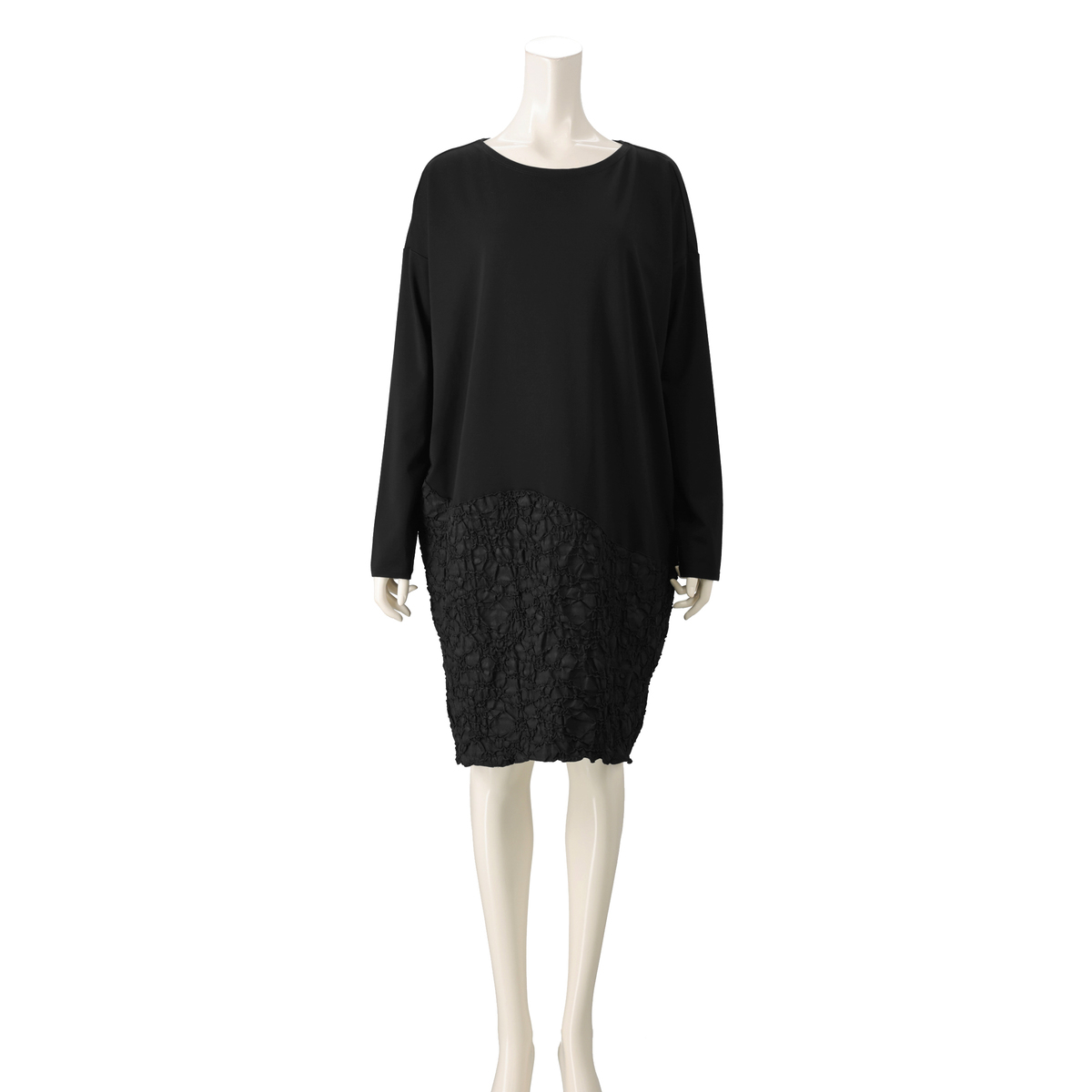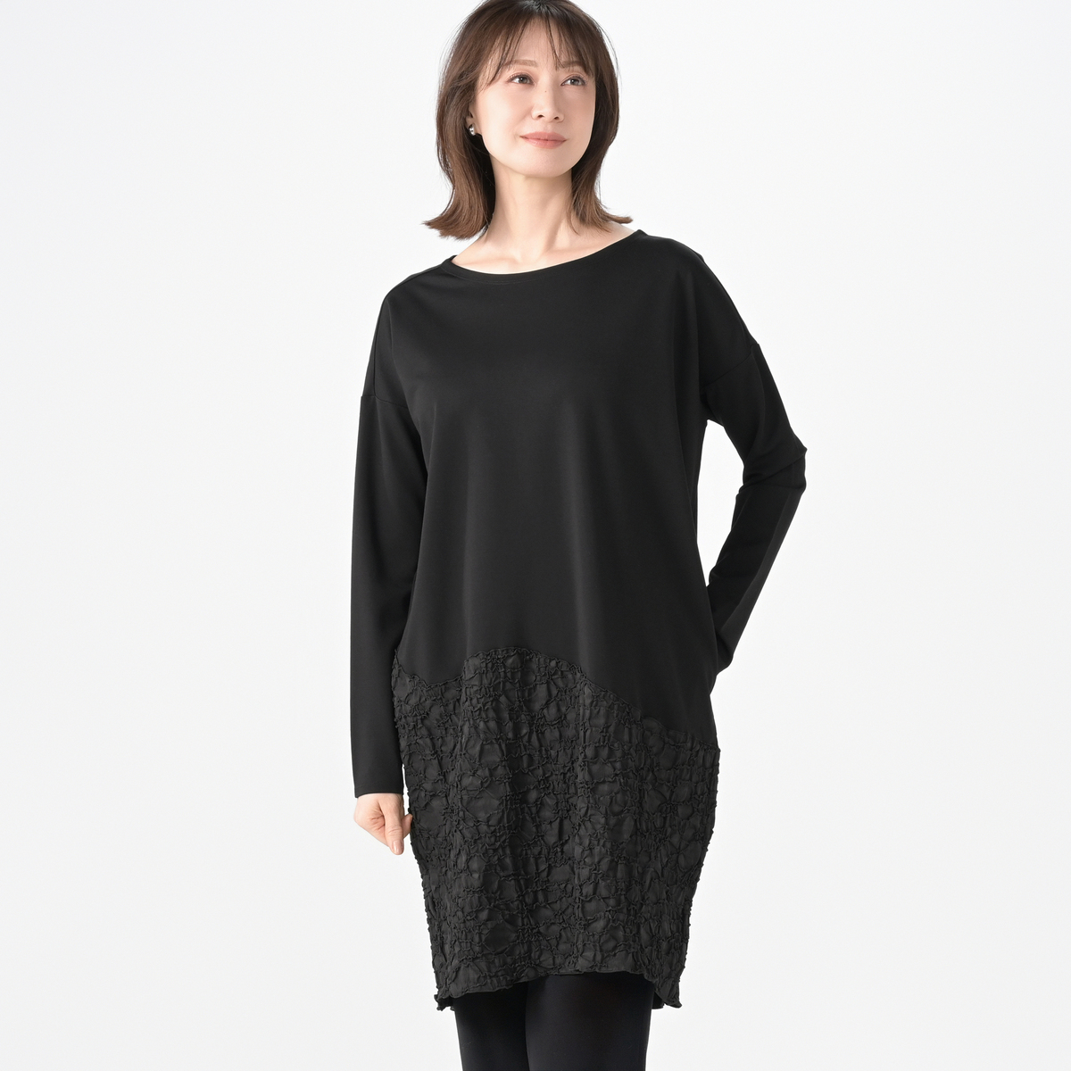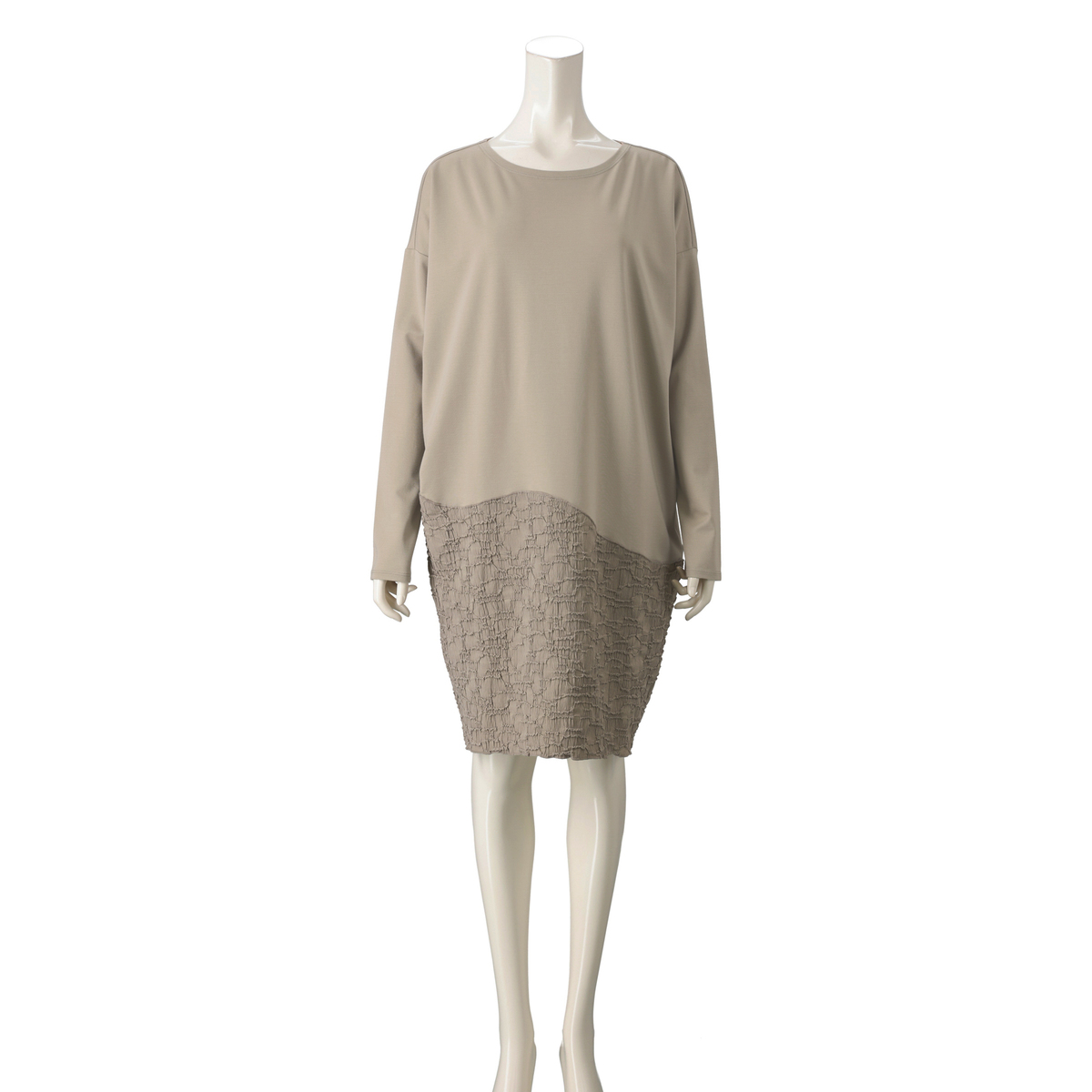 ジャガード素材と、無地のジャージをドッキングしたワンピース。高級感があり、エレガントな雰囲気を演出します