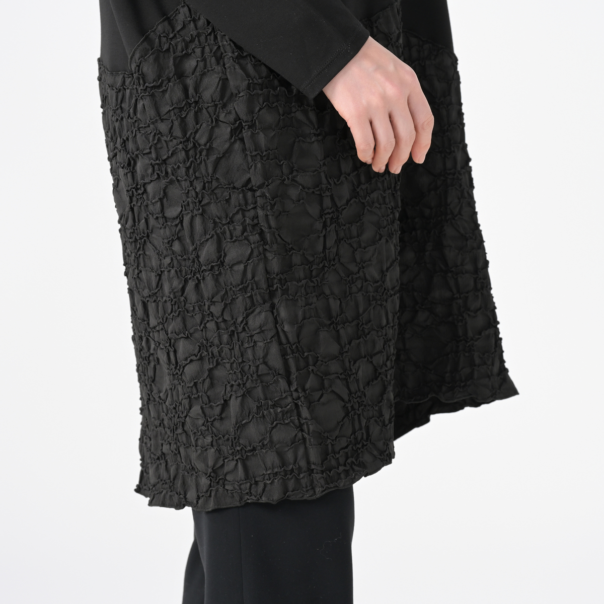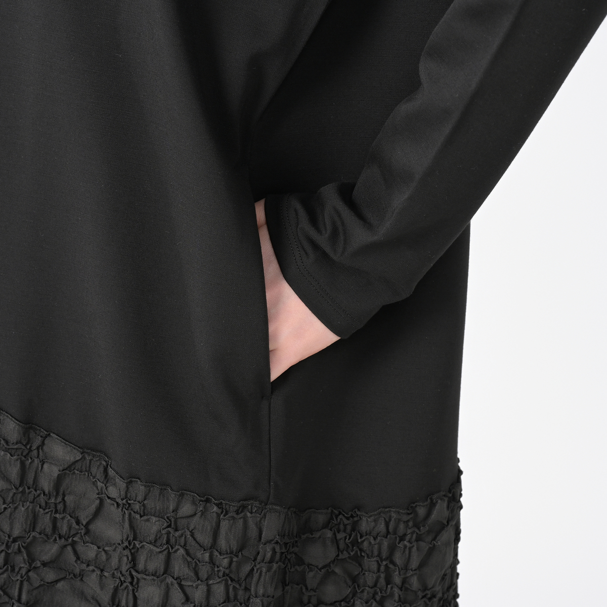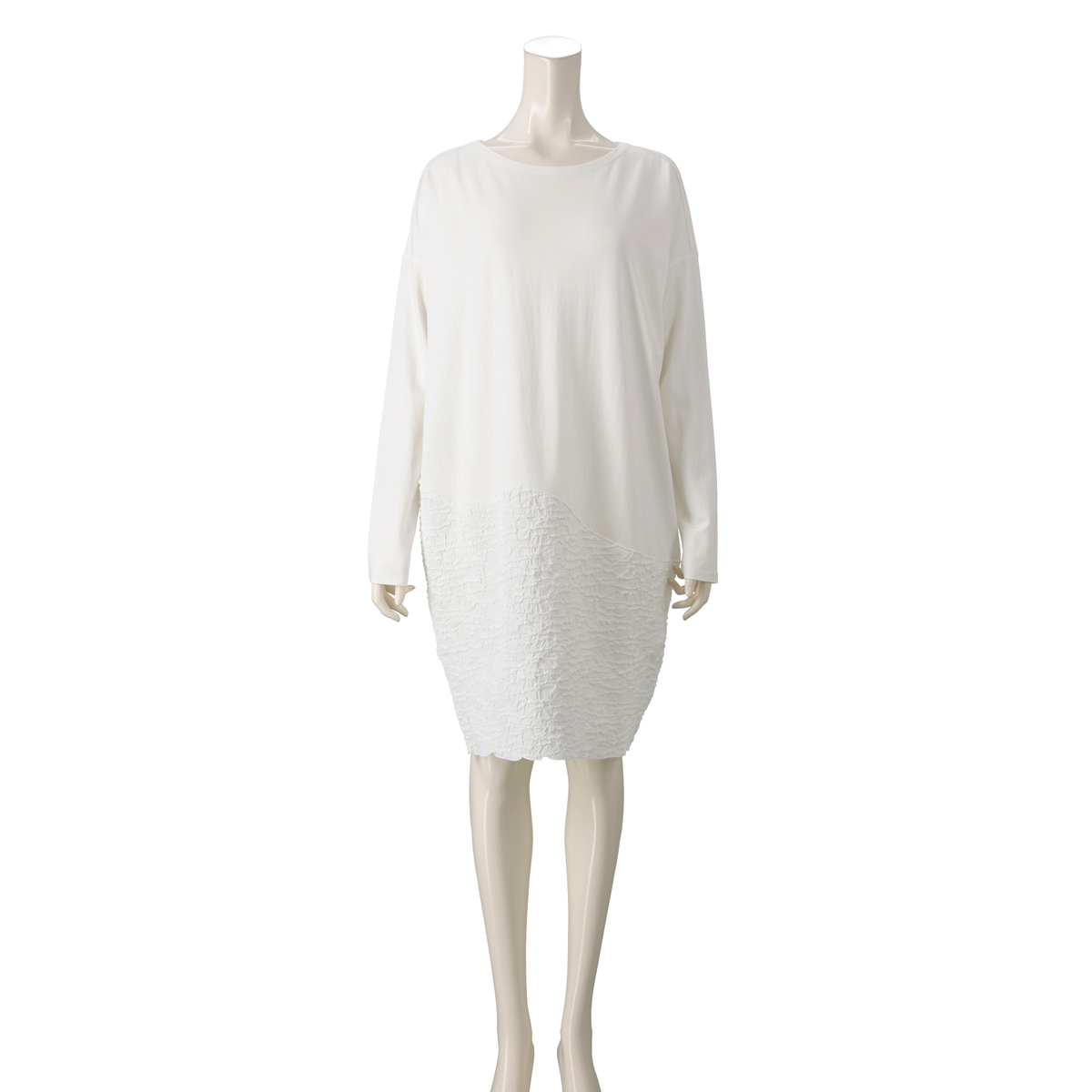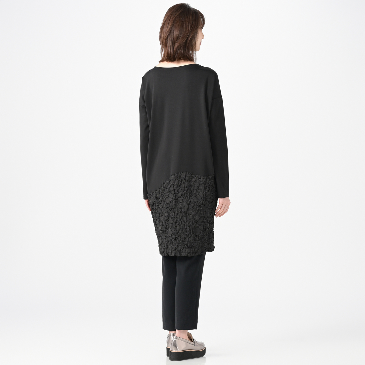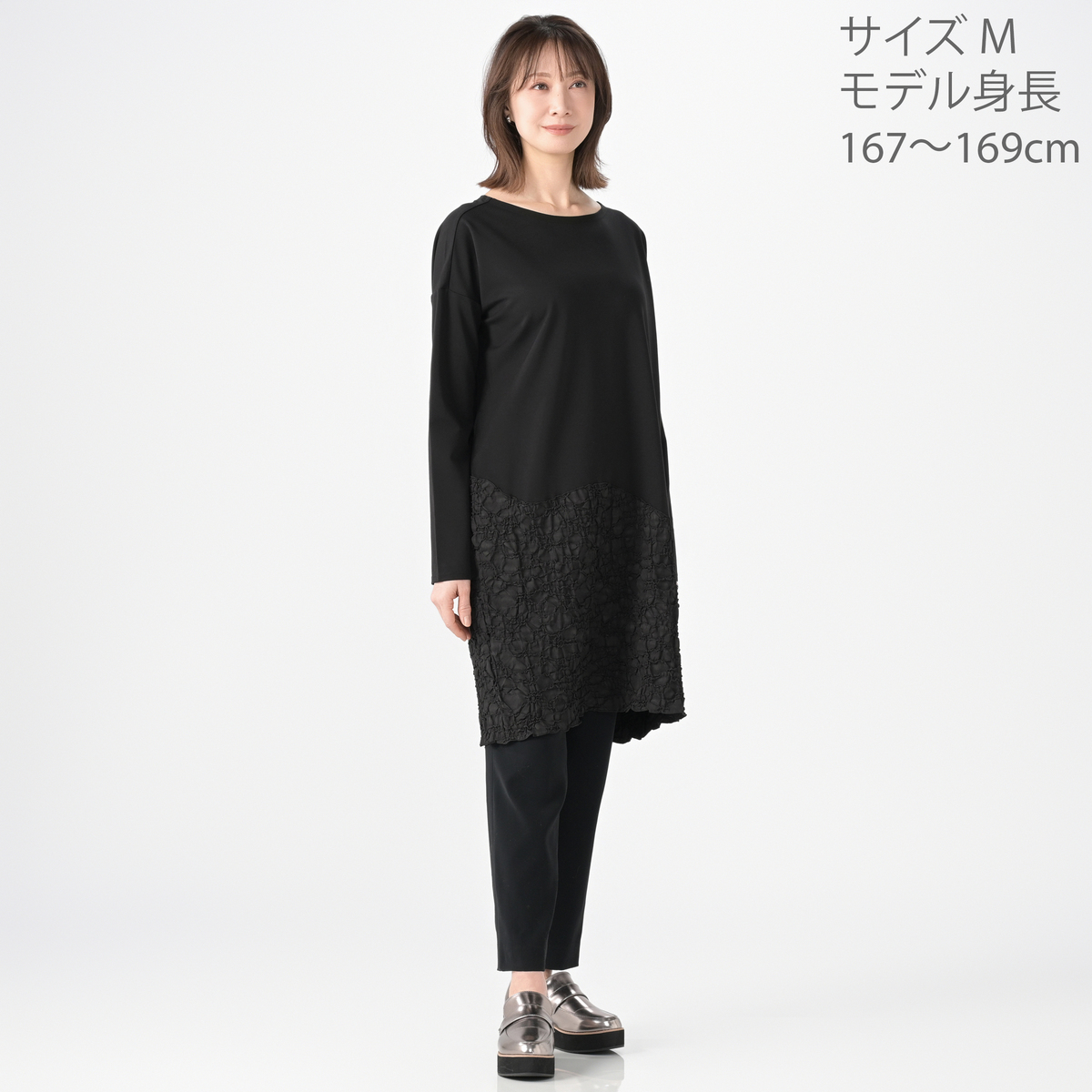 ジャガード素材と、無地のジャージをドッキングしたワンピース。高級感があり、エレガントな雰囲気を演出します