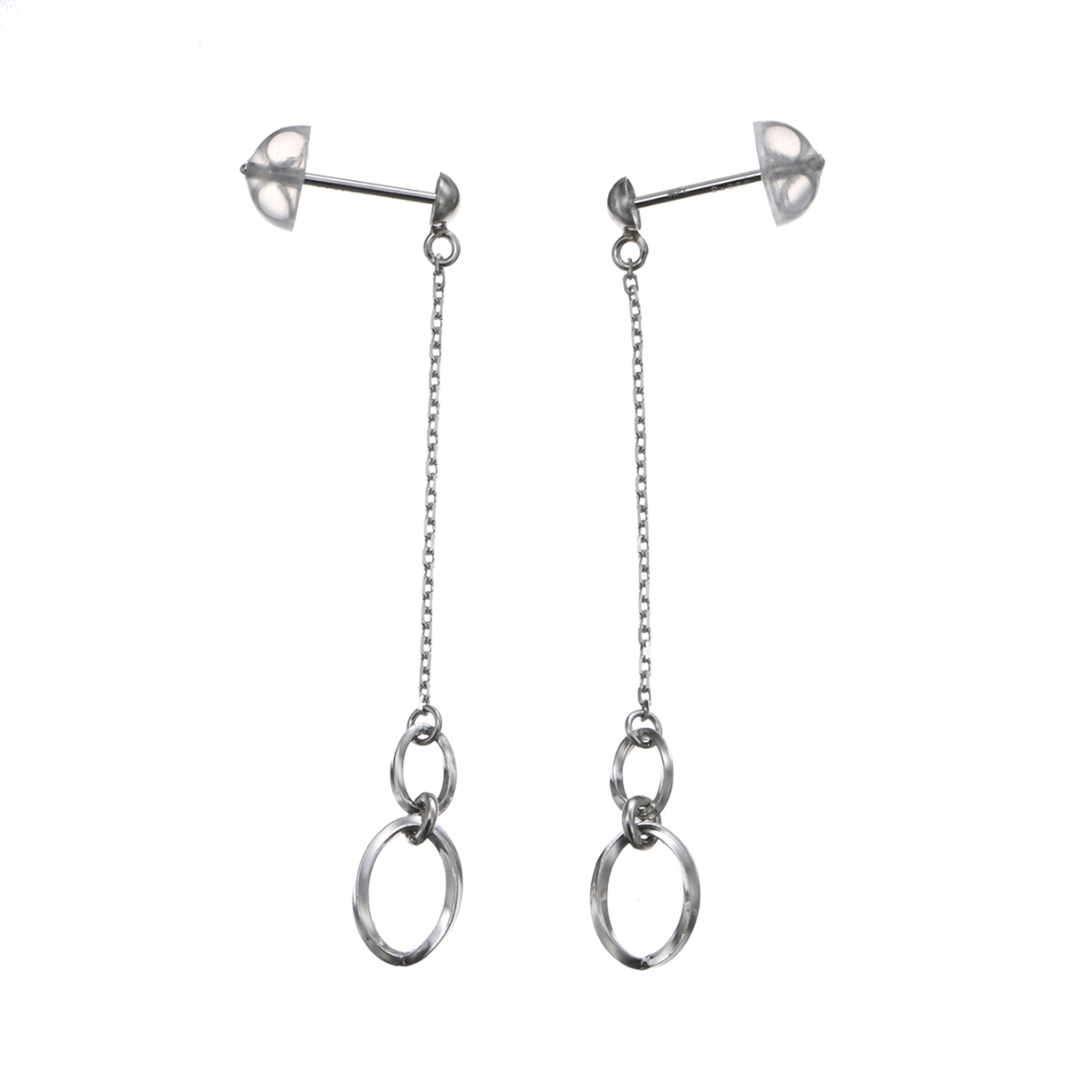 英語でしずくを意味する"DEW"。角線をひねった2つのオーバルサークルを、丸線の小さなサークルで繋げました。縦のラインを強調しながら耳元を印象的に飾ります
