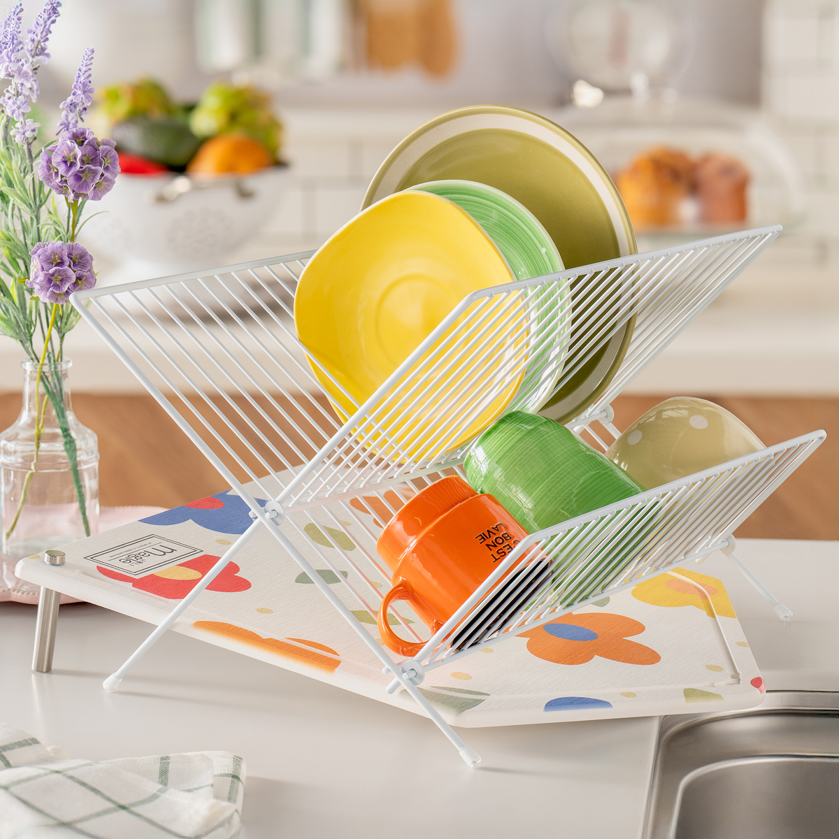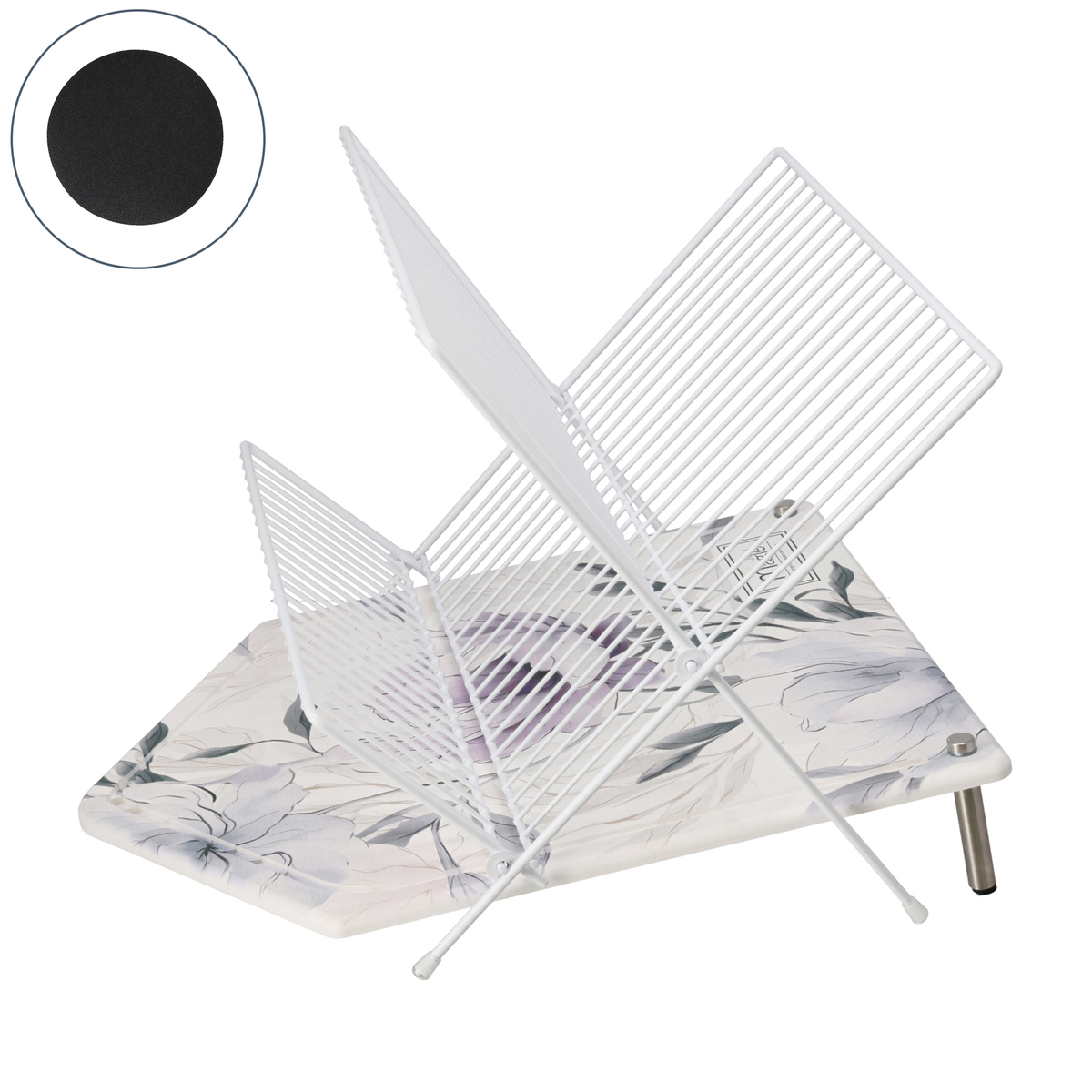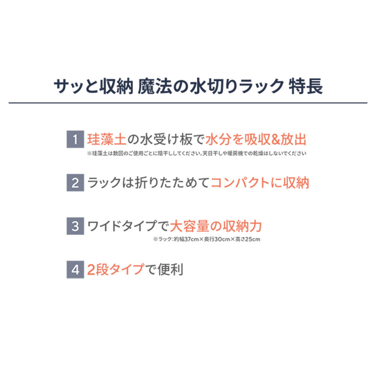 ワイドタイプで大容量の収納力ながら、使わない時はラックを折りたためるのでコンパクトに。水受け板は多孔構造を持った珪藻土を使用しています*