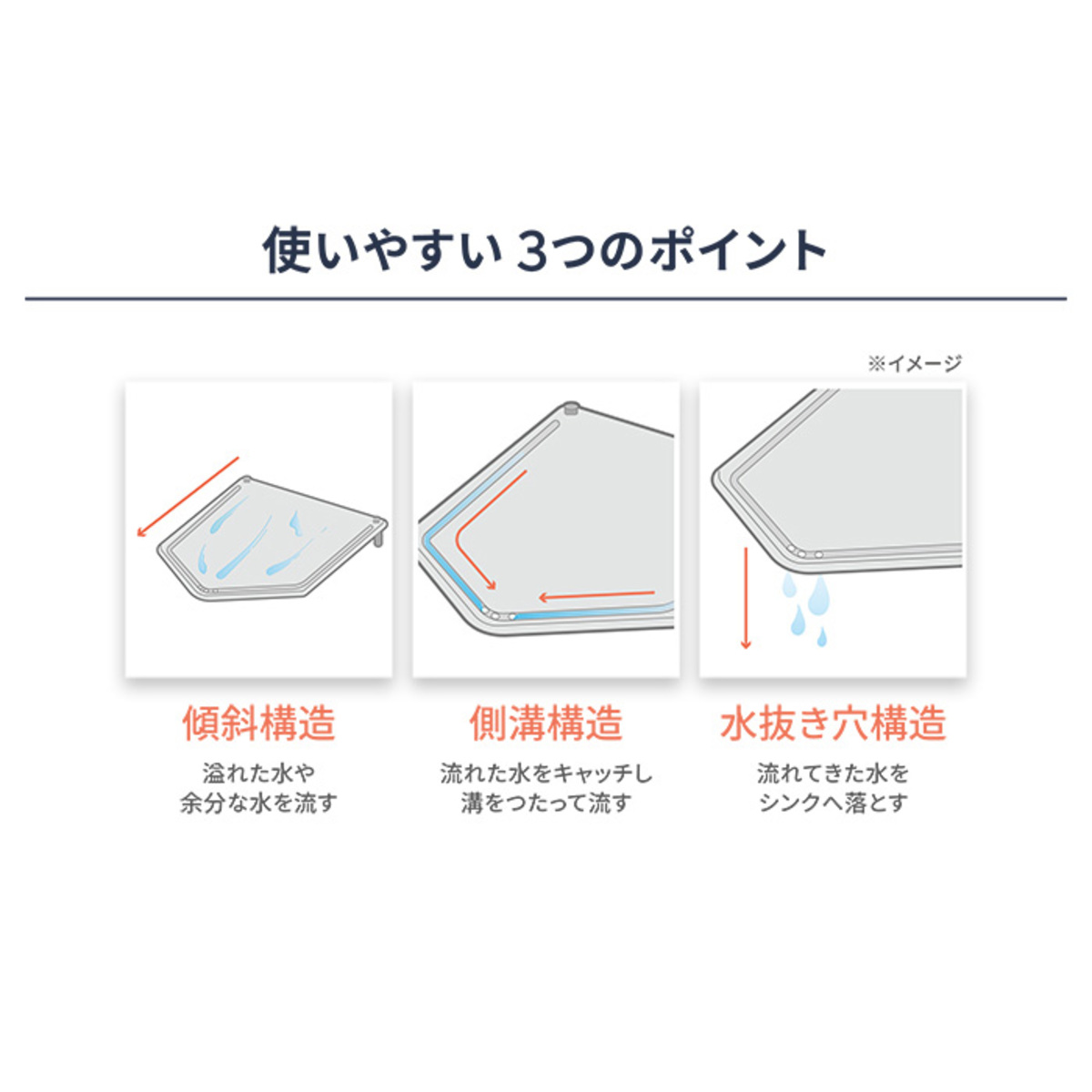 珪藻土マットは傾いているため、あふれた水や余分な水を流すことができます。側溝構造により流れた水が側溝に入り、溝をつたって傾斜で流れ、シンクに落ちるようになっています。また、水抜き穴構造により側溝をつたって流れてきた水をシンクへ落とします