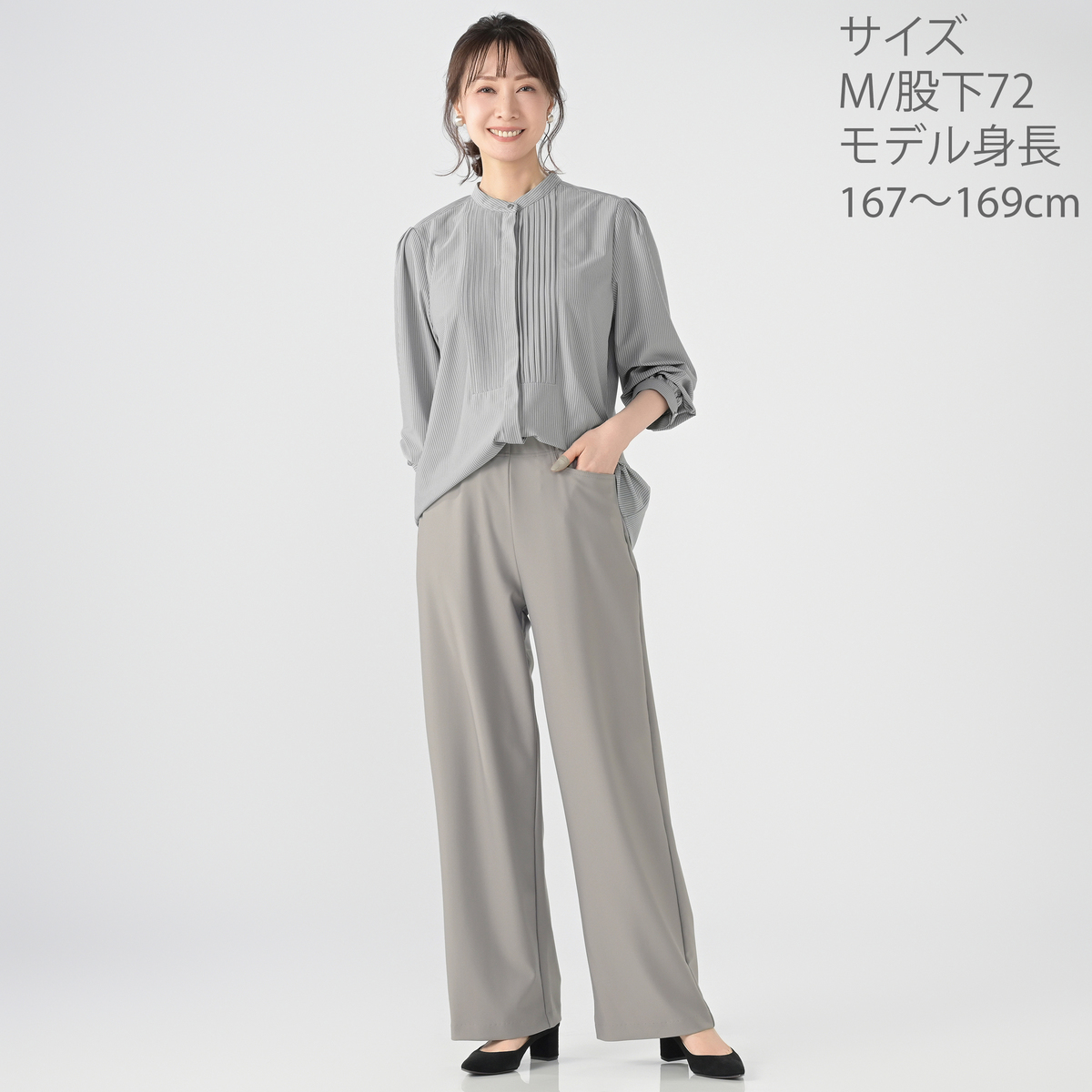 体のラインに沿う設計で、動きに合わせてフィット。落ち感のある素材でドレープ性があり、シワになりにくい点も魅力。毛玉にもなりにくく、UVカットや吸水速乾、接触冷感などの機能も備え、快適さを意識した仕上がりです