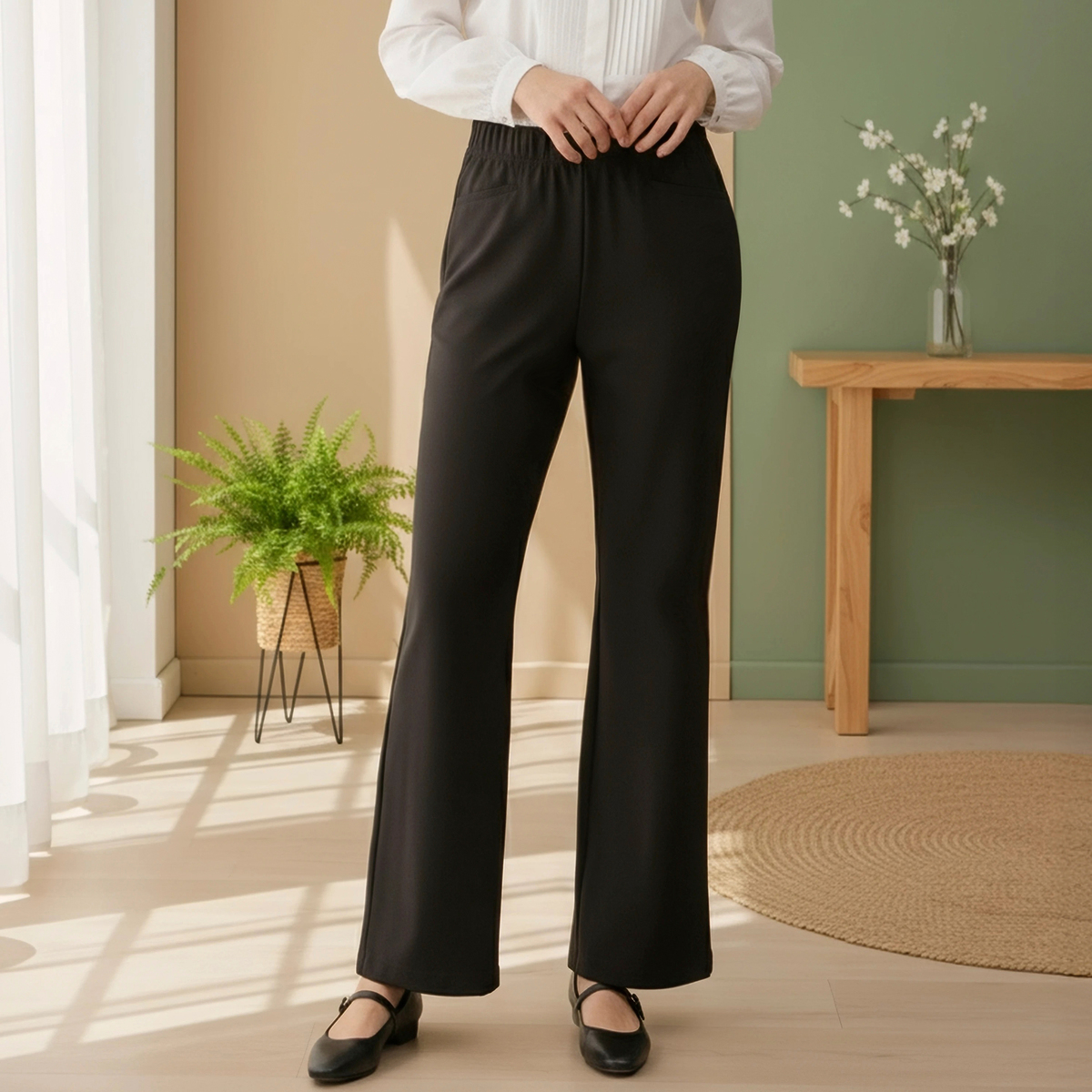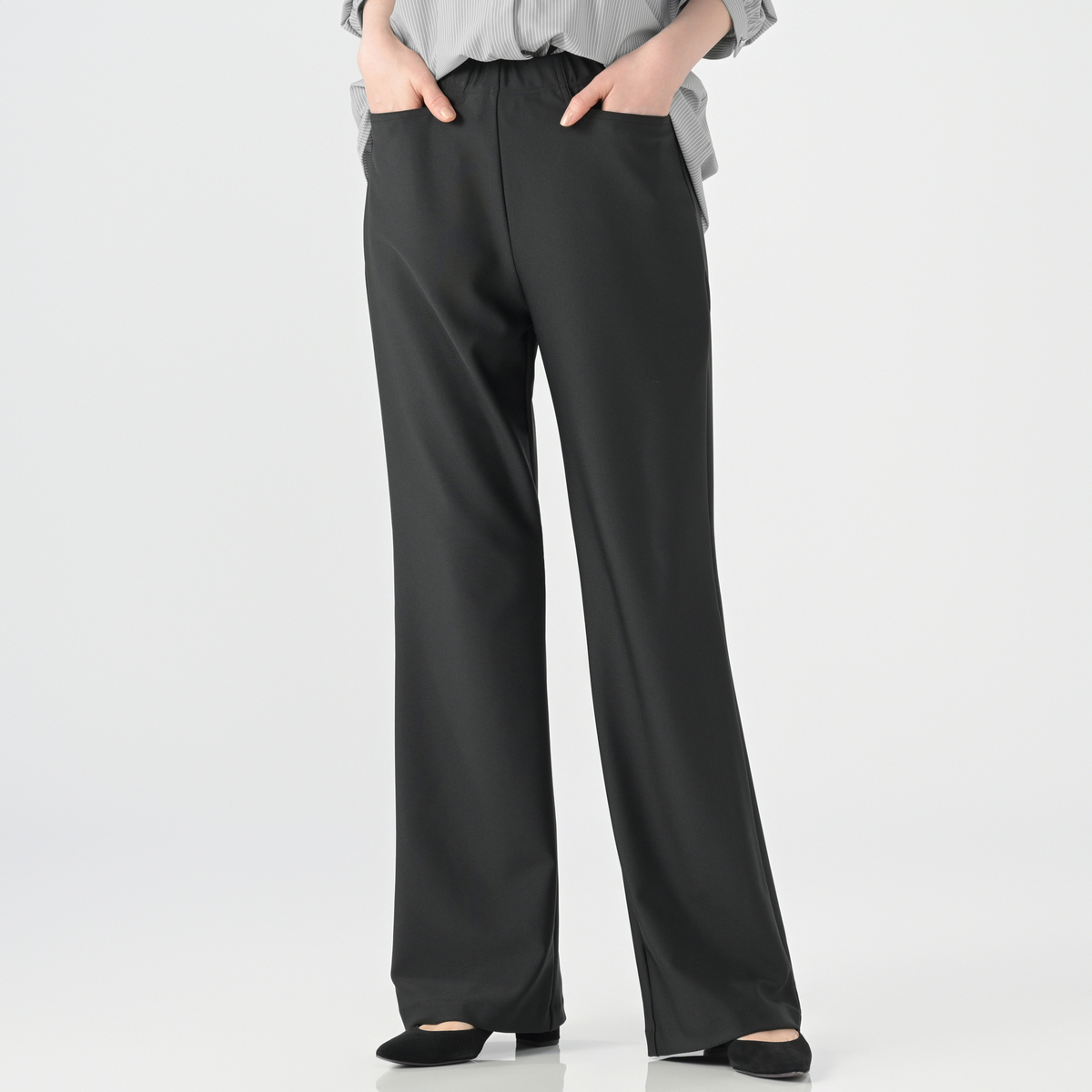 立体的なパターン設計で穿き心地にこだわったブーツカットパンツ。タテ・ヨコ・ナナメにストレッチ性があり締めつけ感が少なく、総ゴム仕様のウエストは立体的な作りでお腹周りをすっぽり包んでくれます