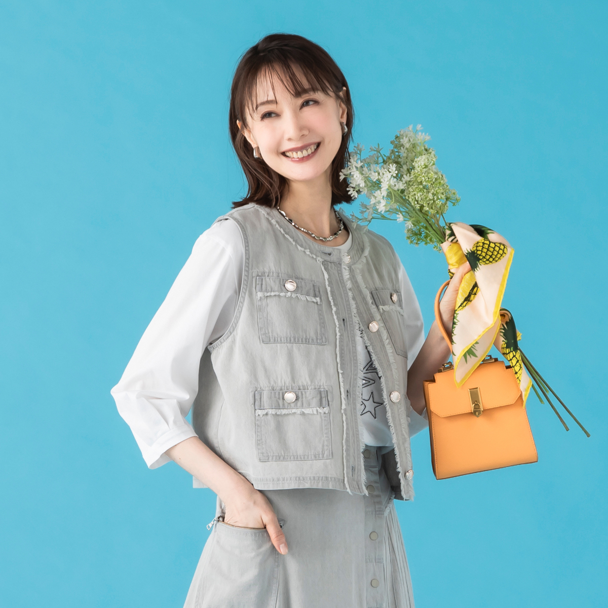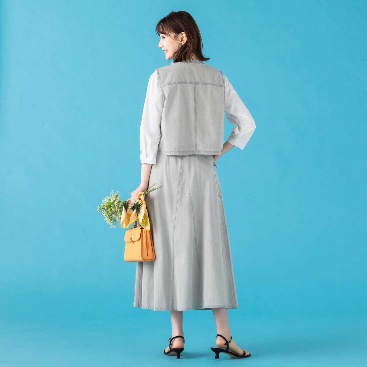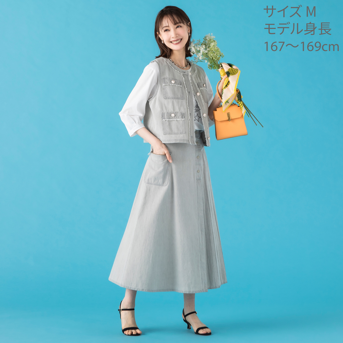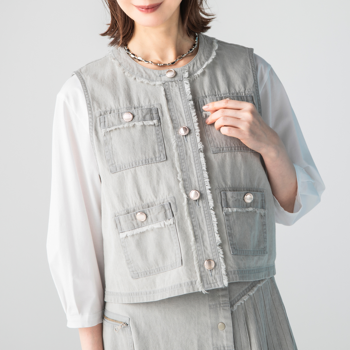 ドライな質感が心地よいデニムをベースに、前立てや衿ぐり、ポケット口へフリンジを添えたベスト。4つのアウトポケットとメタリックボタンが程よい存在感を引き寄せます。ノーカラーならではのすっきり感で重ねやすく、いつものスタイルに軽いニュアンスを足してくれます