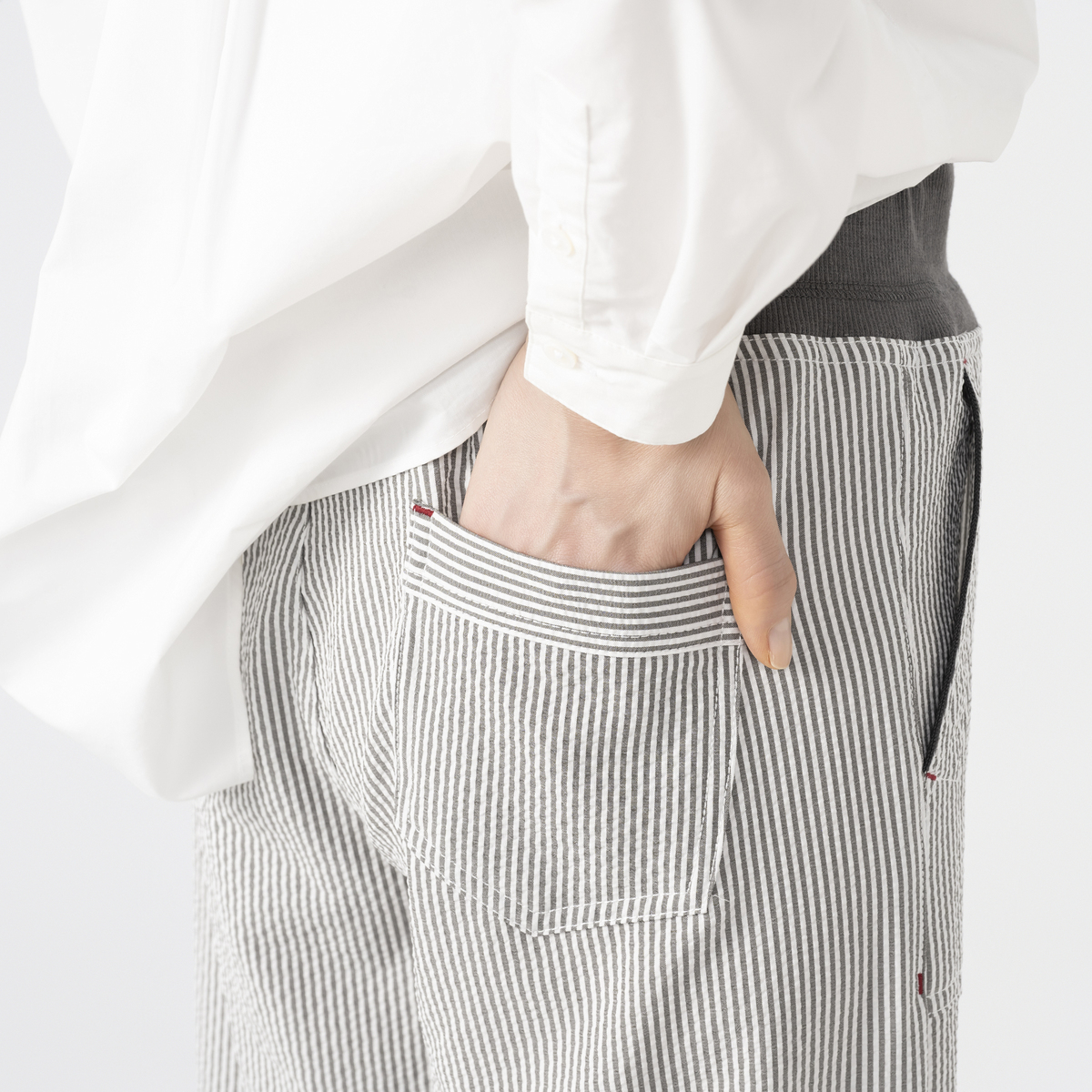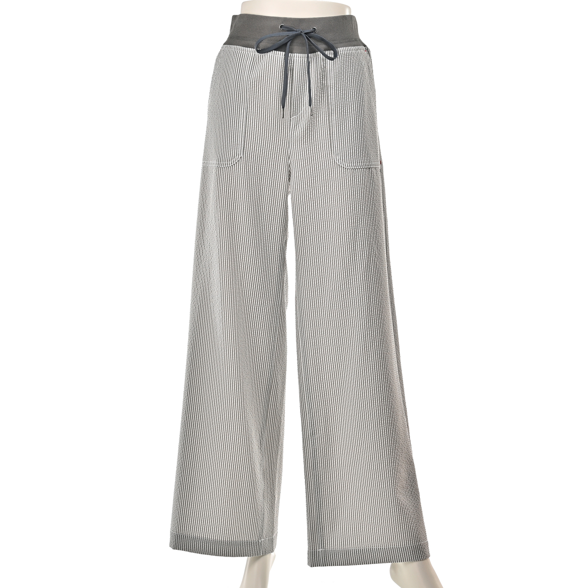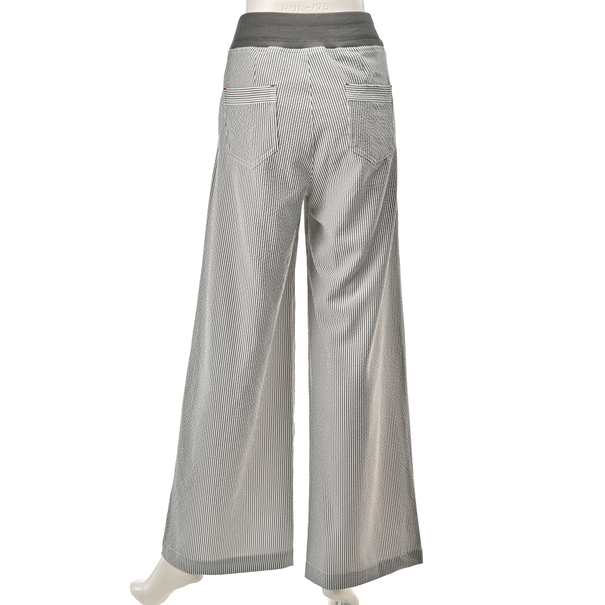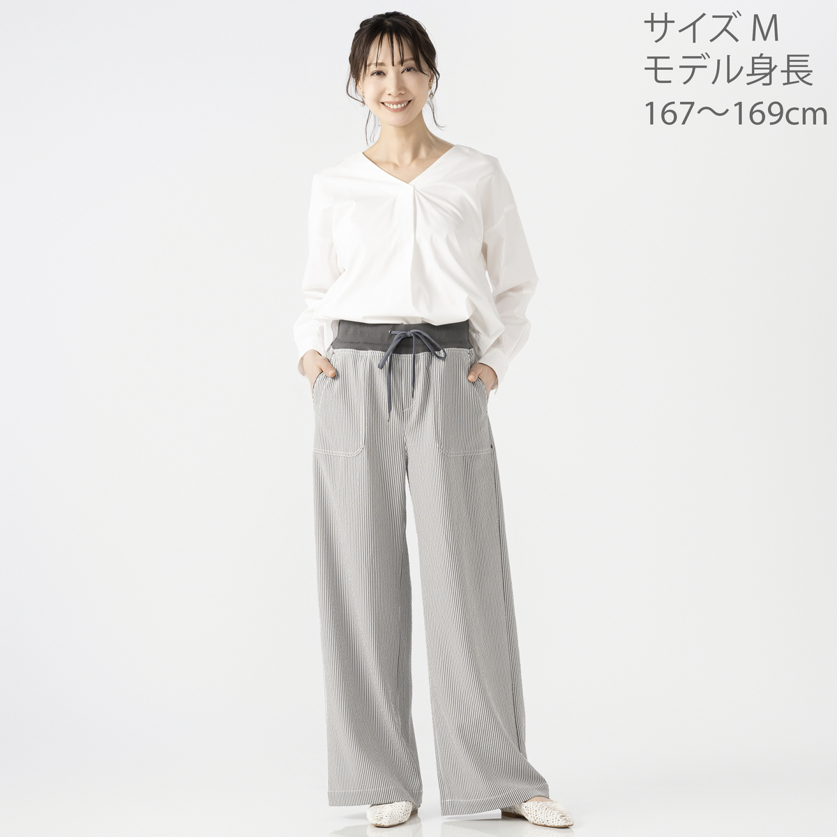 ストレッチ性のある細いストライプの生地で仕立てたワイドパンツ。ウエストにはリブニットを採用し、穿き心地良く仕上げました