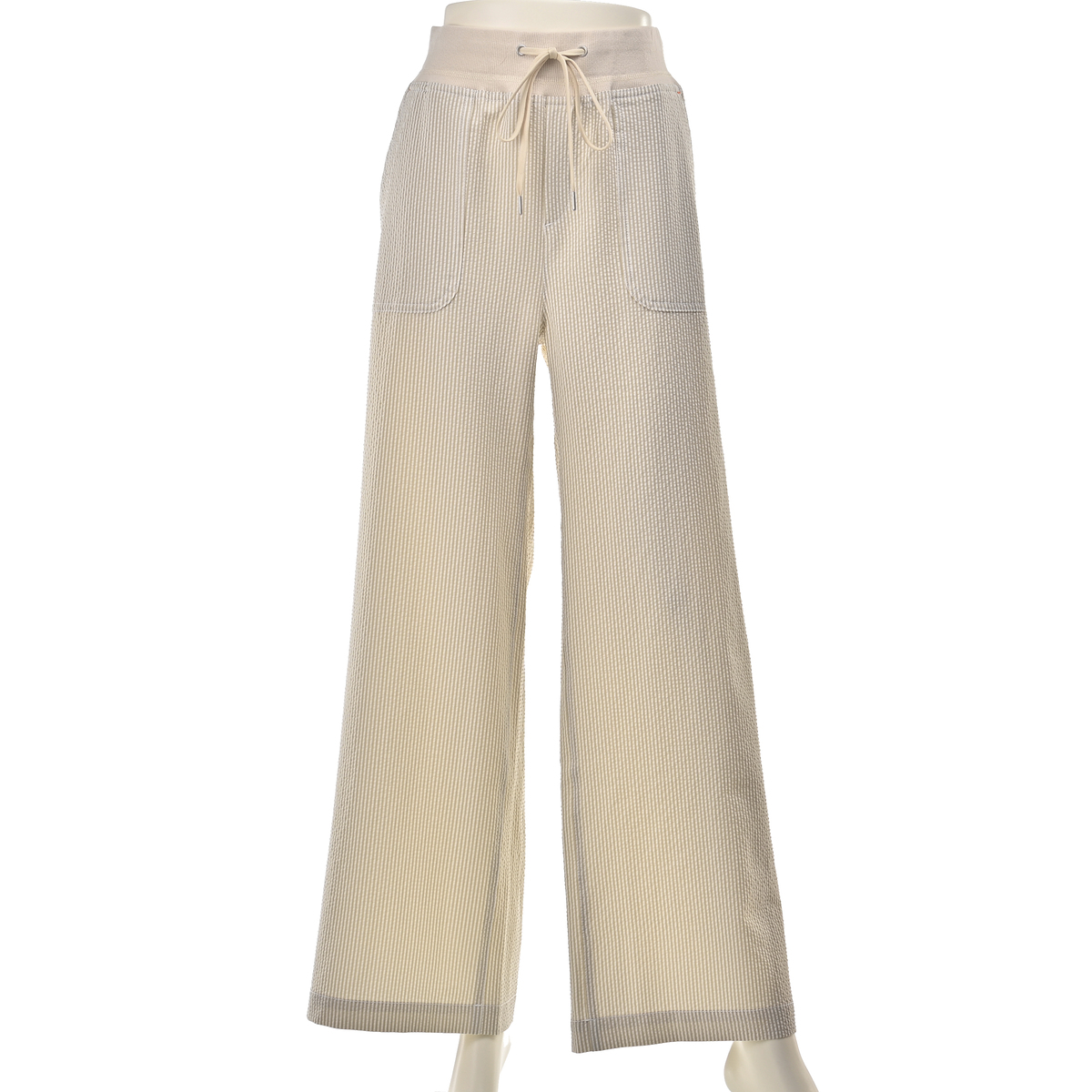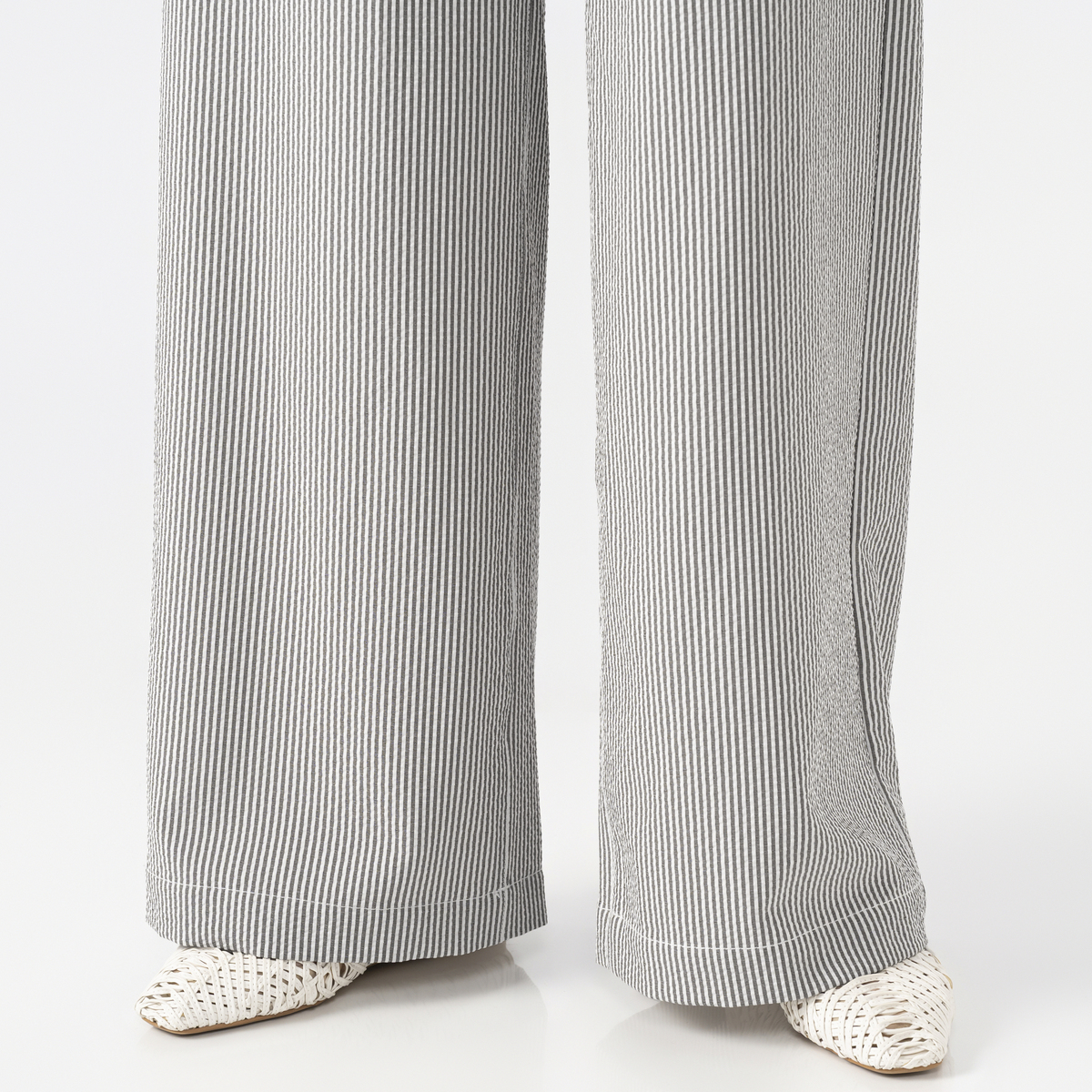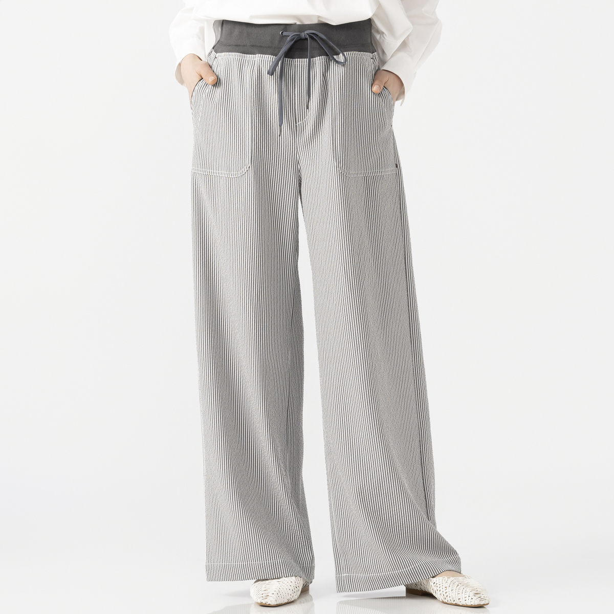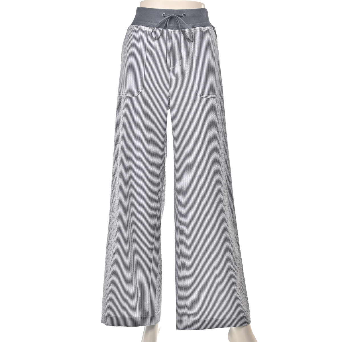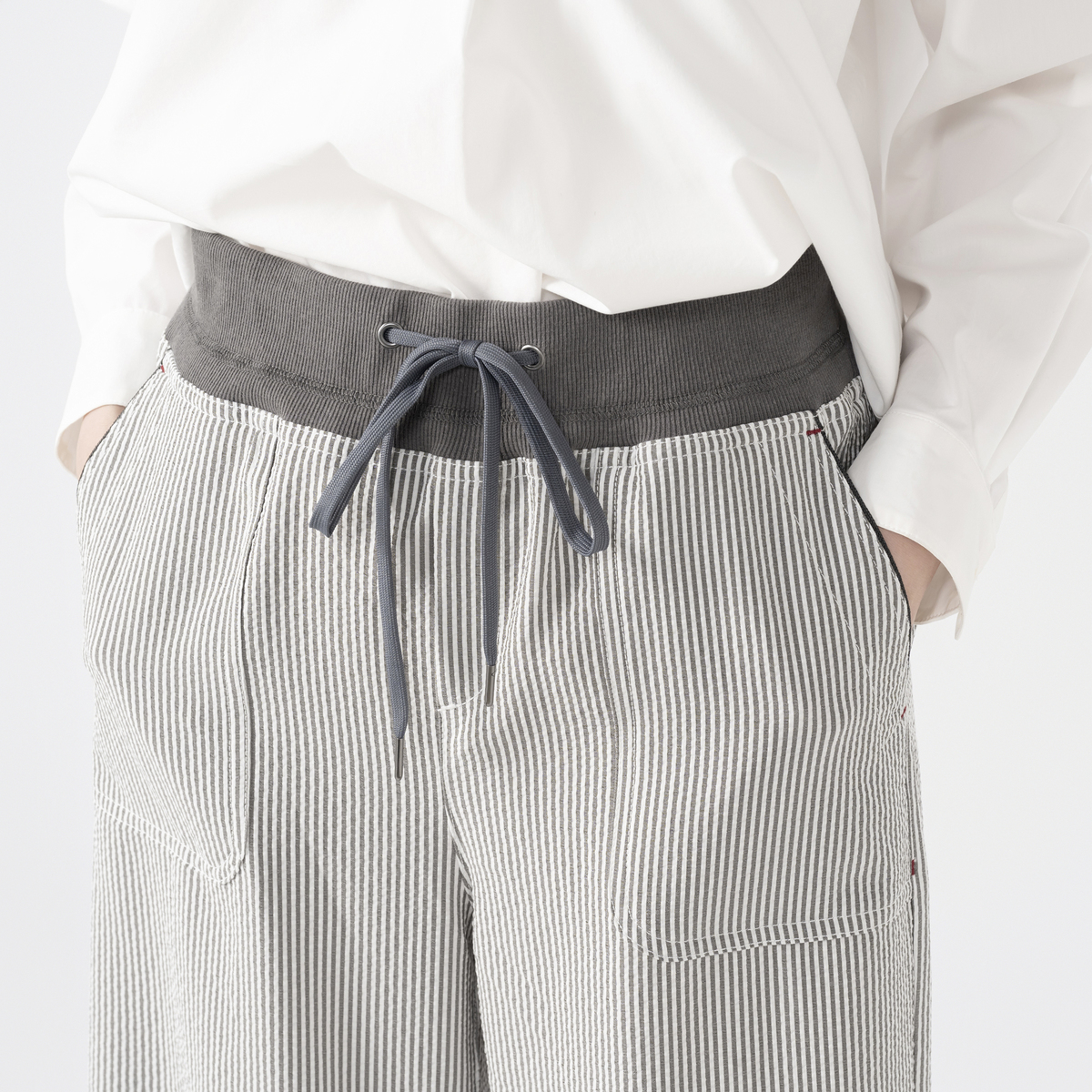 ストレッチ性のある細いストライプの生地で仕立てたワイドパンツ。ウエストにはリブニットを採用し、穿き心地良く仕上げました