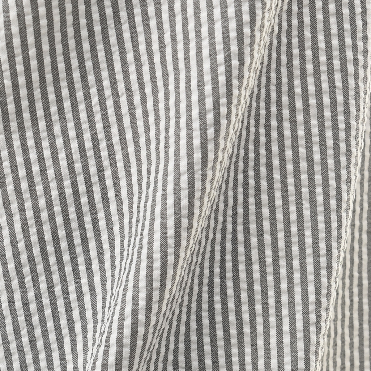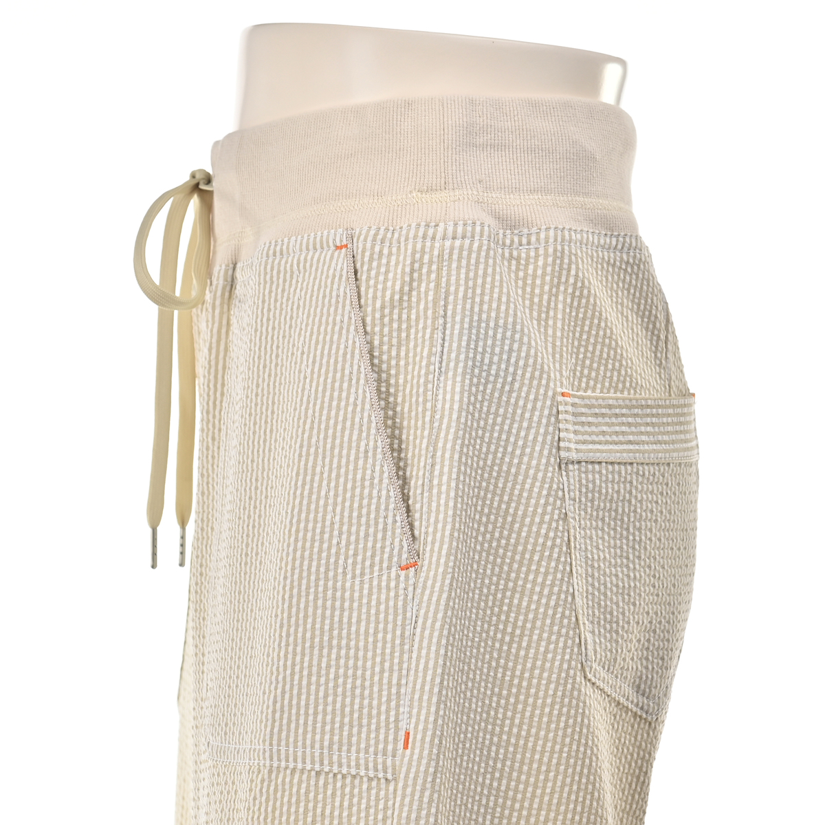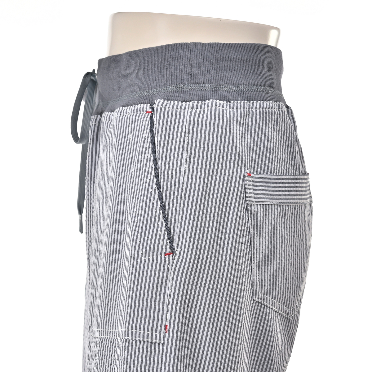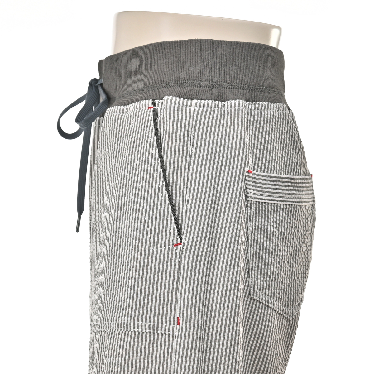 ストレッチ性のある細いストライプの生地で仕立てたワイドパンツ。ウエストにはリブニットを採用し、穿き心地良く仕上げました