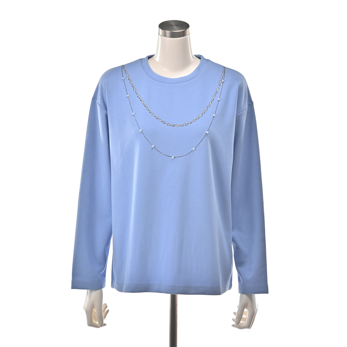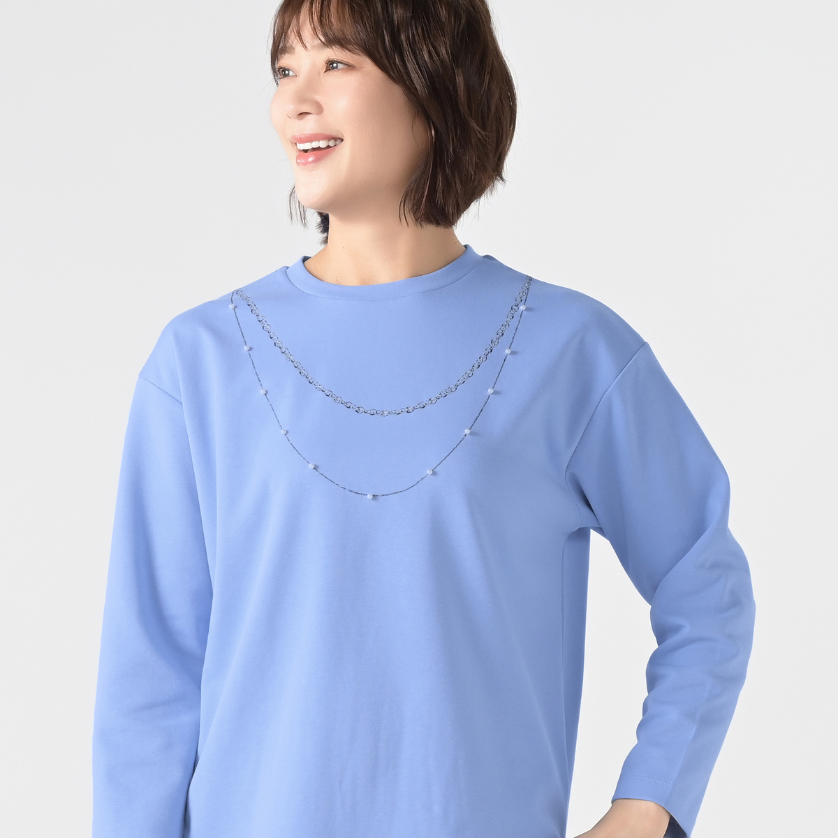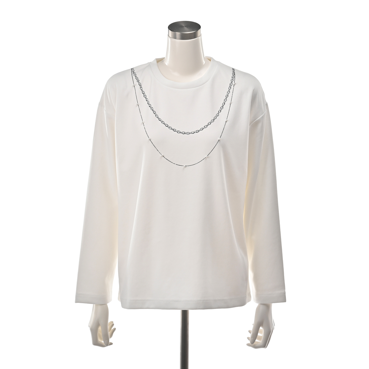 ネックレスを付けたように見えるプリントでデザインした、ロングスリーブTシャツです。ラインストーンやパール調モチーフをあしらい、さりげなく華やかさを演出しています