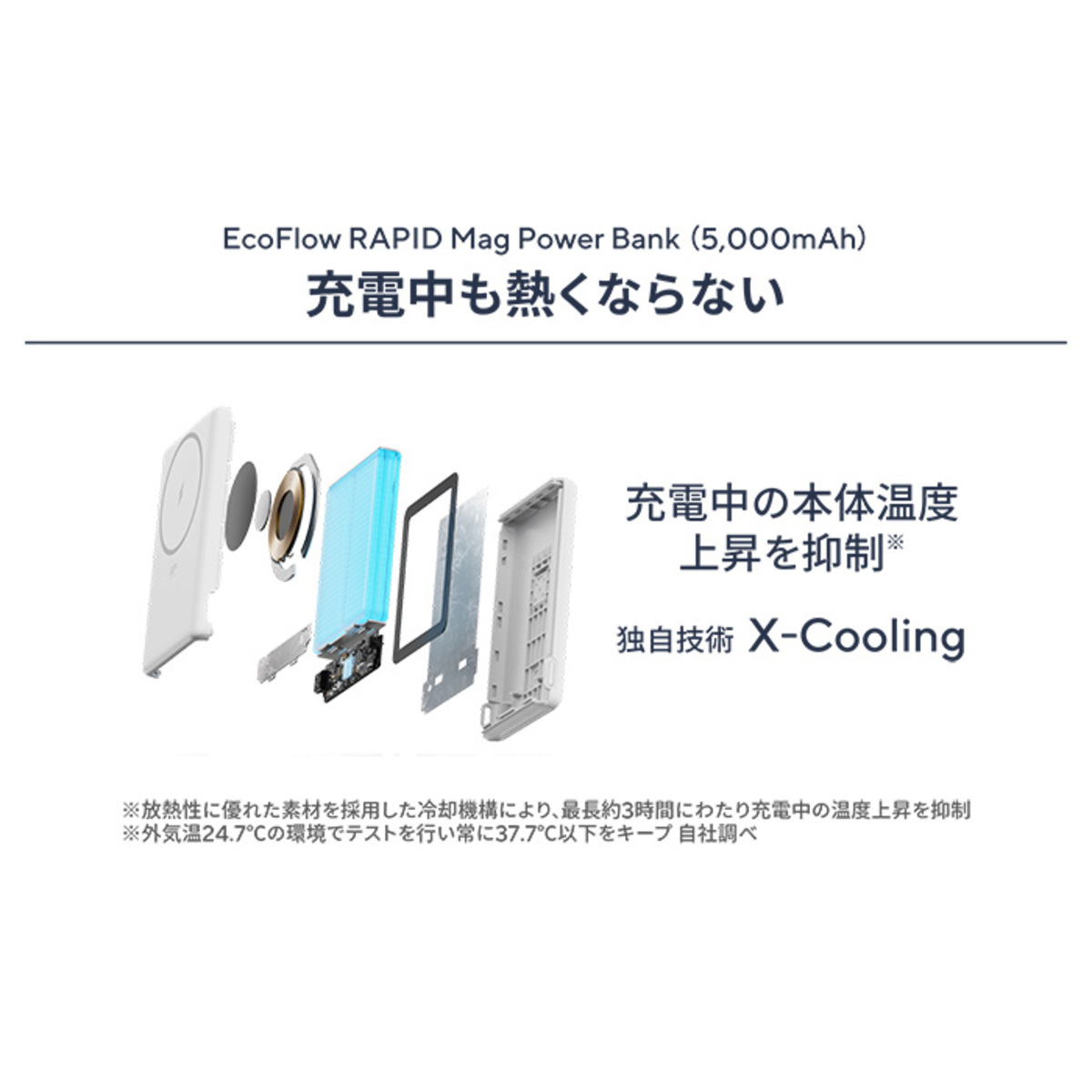 ワイヤレス充電で課題となる温度上昇を抑え、スマートフォンのバッテリー寿命延長にも貢献することを目指した、独自の温度制御技術X-Coolingを起用。外気温24.7℃の環境でテストを行ったところ常に37.7℃以下をキープしていました(温度は環境等により異なります)