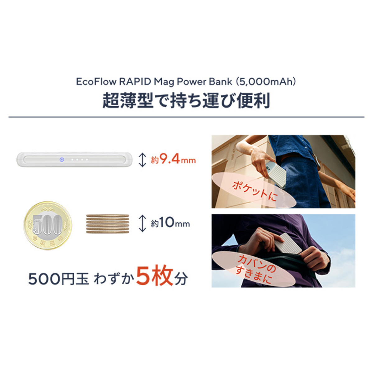 メーカー最薄クラスのワイヤレス充電対応モバイルバッテリー。5000mAhの容量で500円玉5枚分未満の薄型デザインを実現し、スペースを取らず便利に持ち運べます。停電などの非常時や、キャンプなどコンセントがない時の充電に便利です