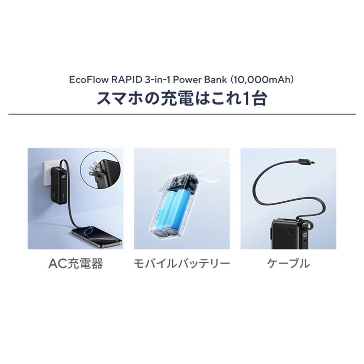 [商品内容] ・本体 ・USBーCケーブル(本体付属) [サイズ] 10.3×7.16×1.55cm [重量] 270g [ケーブル長さ] 22cm [充電時間] 78分 [電池容量] 10000mAh [仕様] ●出力ポート数:USBーC ×1、USBーCケーブル ●最大 35W 出力(AC 充電器) ●最大 30W 出力(モバイルバッテリー) AC 充電器: 入力:100〜240V~ 1.5A 50/60Hz 出力:USBーC / USBーC ケーブル:5V/9V~3A、15V~2.33A、20V~1.75A、35W 最大 USBーC + USBーC ケーブル: 5V~1.8A + 5V~1.8A、18W 最大 モバイルバッテリー: 入力:5V~3A、9V~3A、12V~2.5A、15V~2A、20V~1.5A(USBーC ポートまたは内蔵 USBーC ケーブル) 出力:USBーC / USBーC ケーブル:5V/9V~3A、15V~2A、20V~1.5A、30W 最大 USBーC + USBーC ケーブル: 5V~2A + 5V~2A、20W 最大 [使用方法] 10000mAhモバイルバッテリー、もしくは折りたたみ式AC充電器として使用可能です <充電時> コンセントに直接差し込むことで、本体内蔵バッテリーを充電できます。プラグは折りたたみ式で、持ち運び時は収納可能です。充電中はLEDインジケーターが点灯し、残量や充電状況を確認できます。また、USB-Cポートや内蔵ケーブルを介して他デバイスを同時に充電しながら本体も充電する「パススルー充電」も可能です <給電時> 内蔵USB-Cケーブルを直接スマートフォンに接続すれば、追加ケーブル不要でスマートフォンに給電可能です。さらにUSB-Cポートを併用すれば複数台同時充電も可能です。USB-Cポートから別売ケーブルを使用した給電も可能です。給電中もLEDインジケーターで残量を確認でき、必要に応じて再充電のタイミングを把握できます [注意事項] ※モバイルバッテリーは変換効率により実際容量が定格未満となります。使用時はマニュアルに従い、充電電圧を一致させ付属ケーブルを使用してください ※定期的な充電で耐用年数を延ばせます。火災や爆発防止のため、開封・圧搾・高温加熱・焼却・水没・分解・改造は禁止です ※水・火・熱源や子供の手の届く場所を避け、変形や漏れがあれば直ちに使用停止してください ※廃棄時・修理希望時もEcoFlowへ相談してください ■取り扱い説明を充分にご確認の上、ご使用下さい 【中国製】