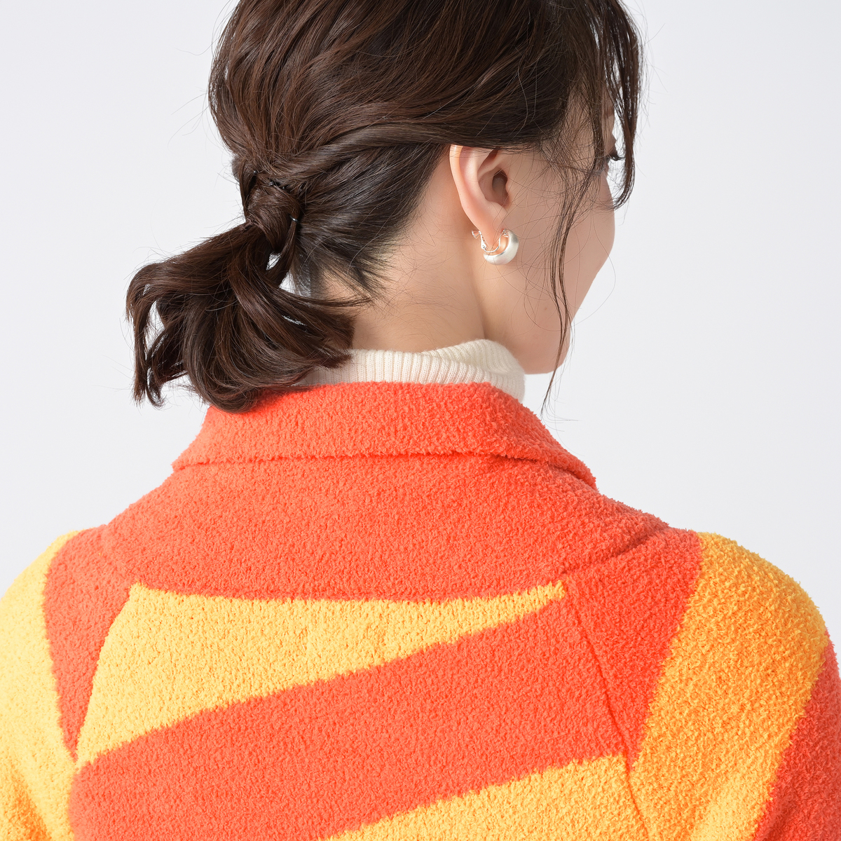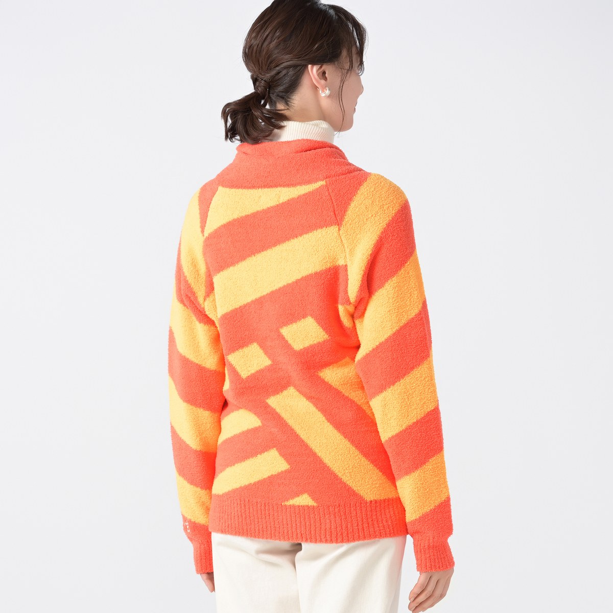 前開きでさっと羽織れるショールカーディガンです。モール糸ならではの柔らかさで、冷え込む季節の体温調整にも重宝し、普段使いからワンマイルまで幅広く活躍します