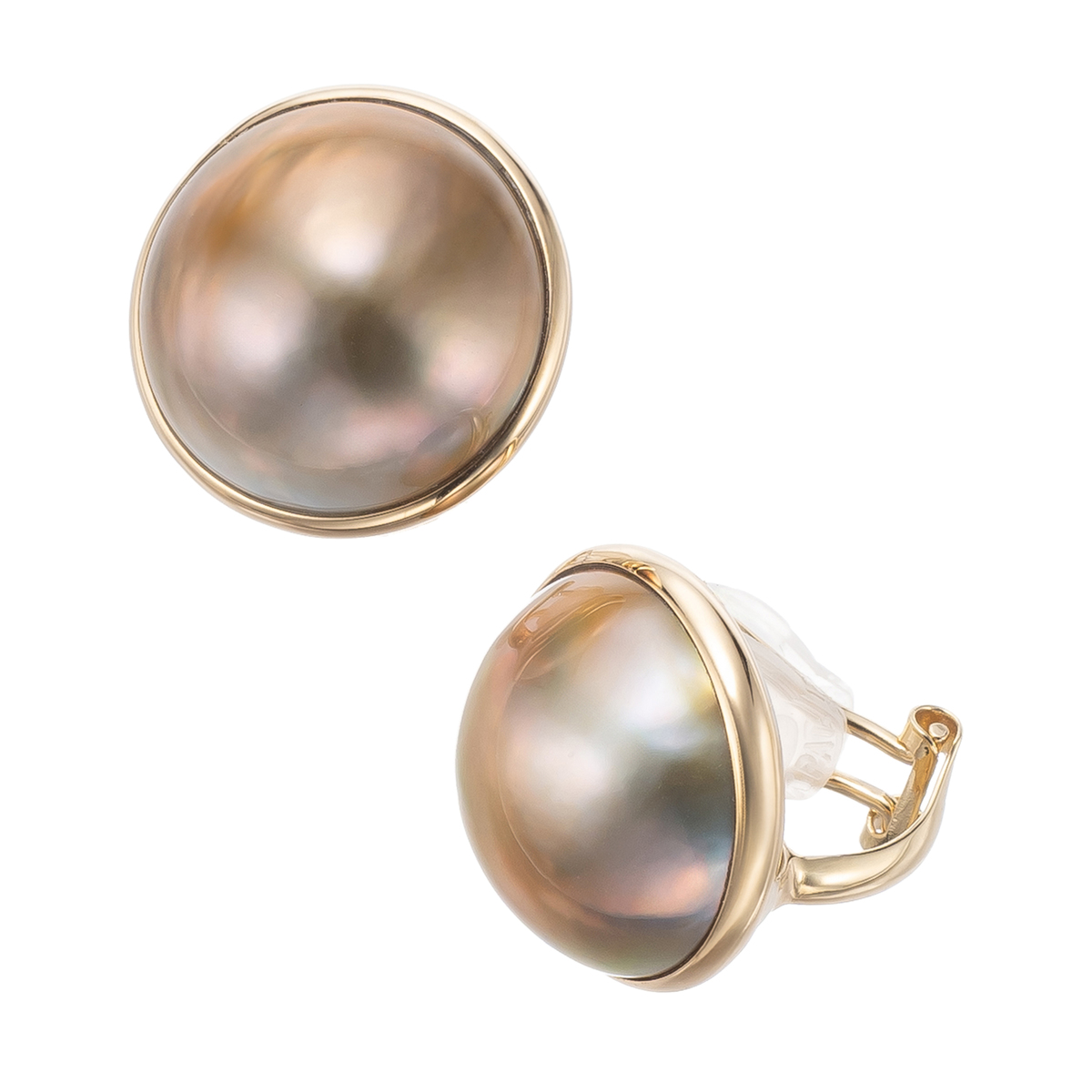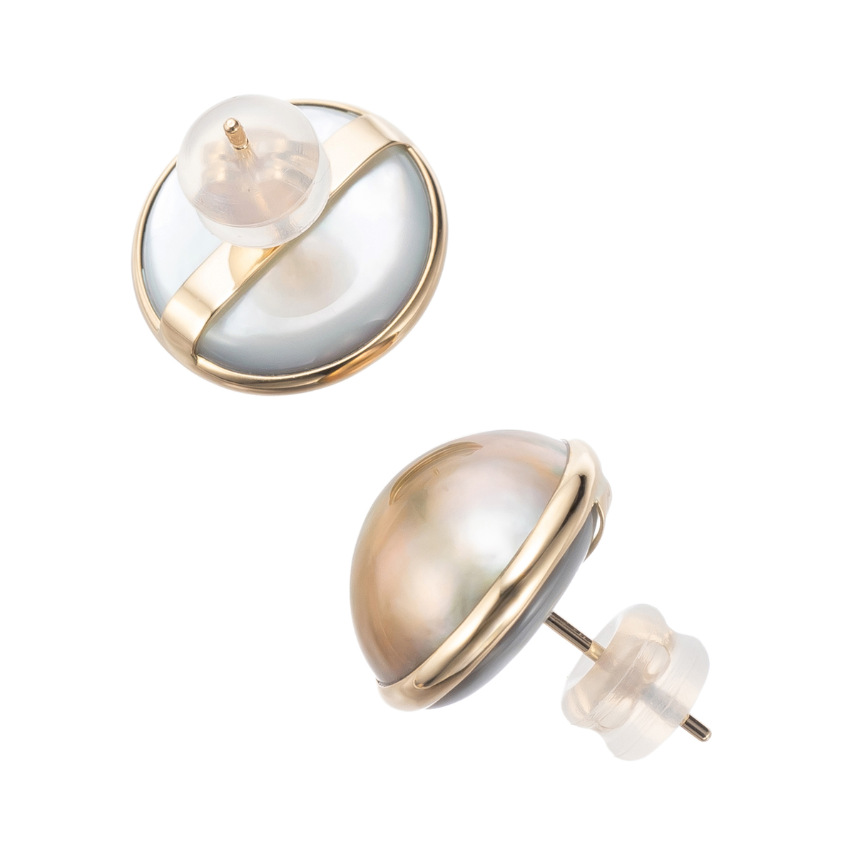 ゴールド系の地色に干渉色が合わさり、独特の色相を生み出すマベパールを使用したイヤリングまたはピアス。耳元を上品に彩るジュエリーです