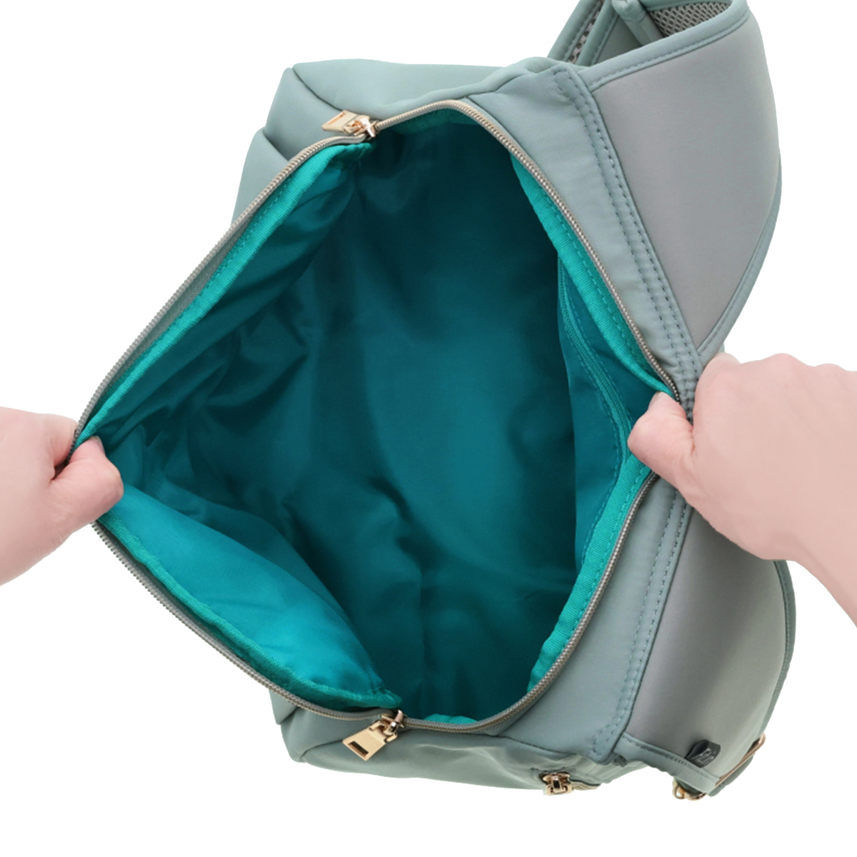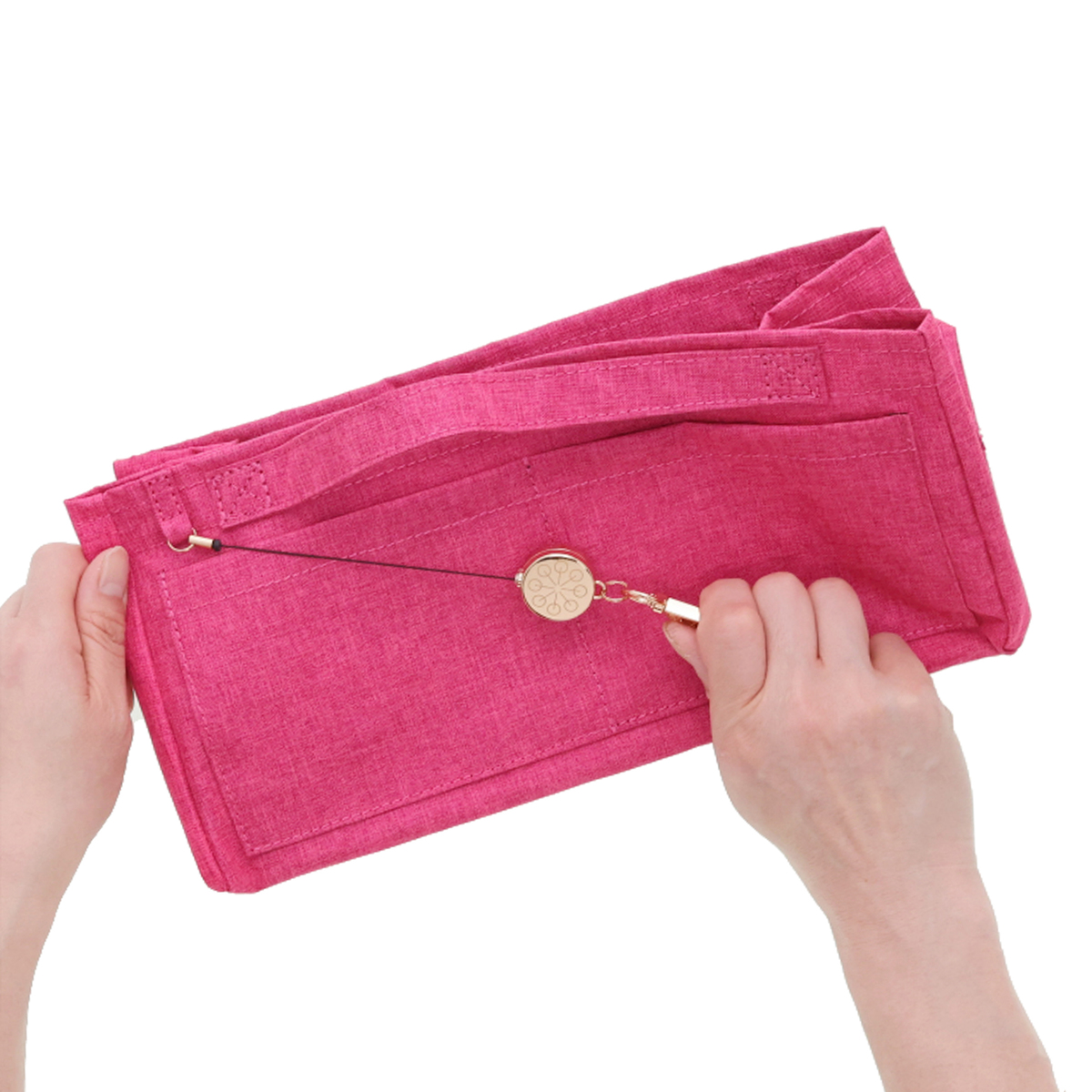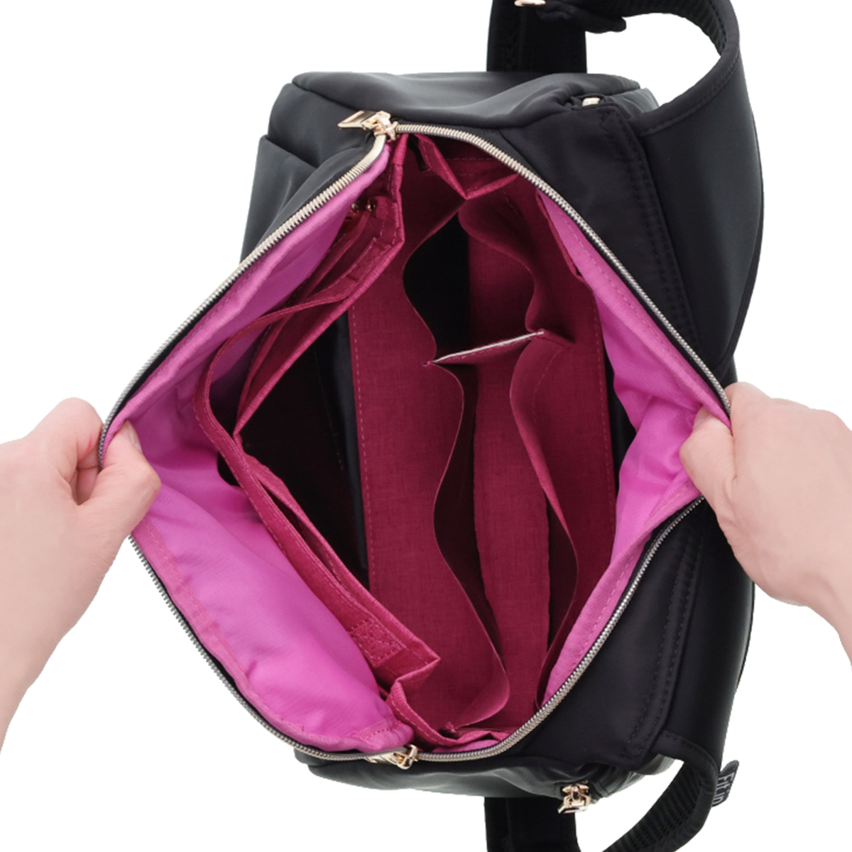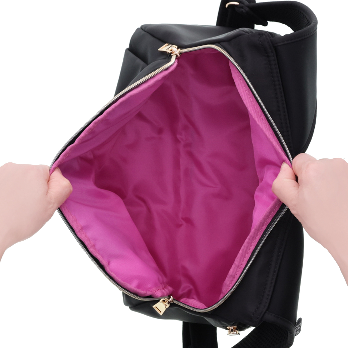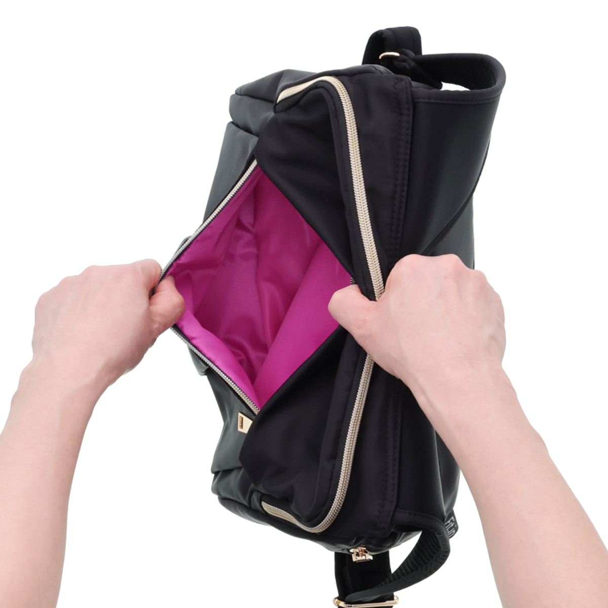 開口部はファスナー仕様で開け閉めが簡単です。フロントには隠しポケットが付いています。バッグの中身を整理整頓できるバッグインバッグ付きで、必要なものをスムーズに取り出せます