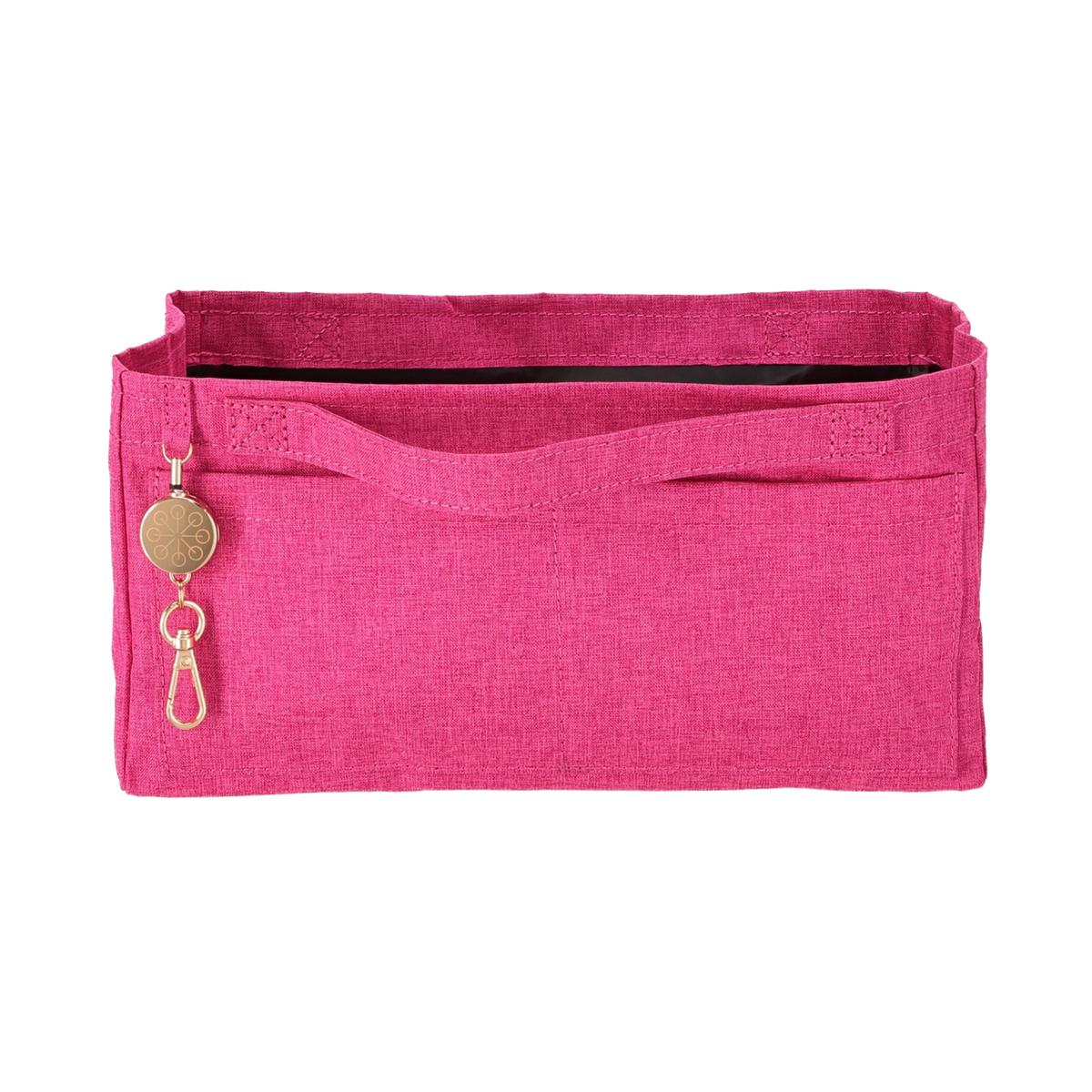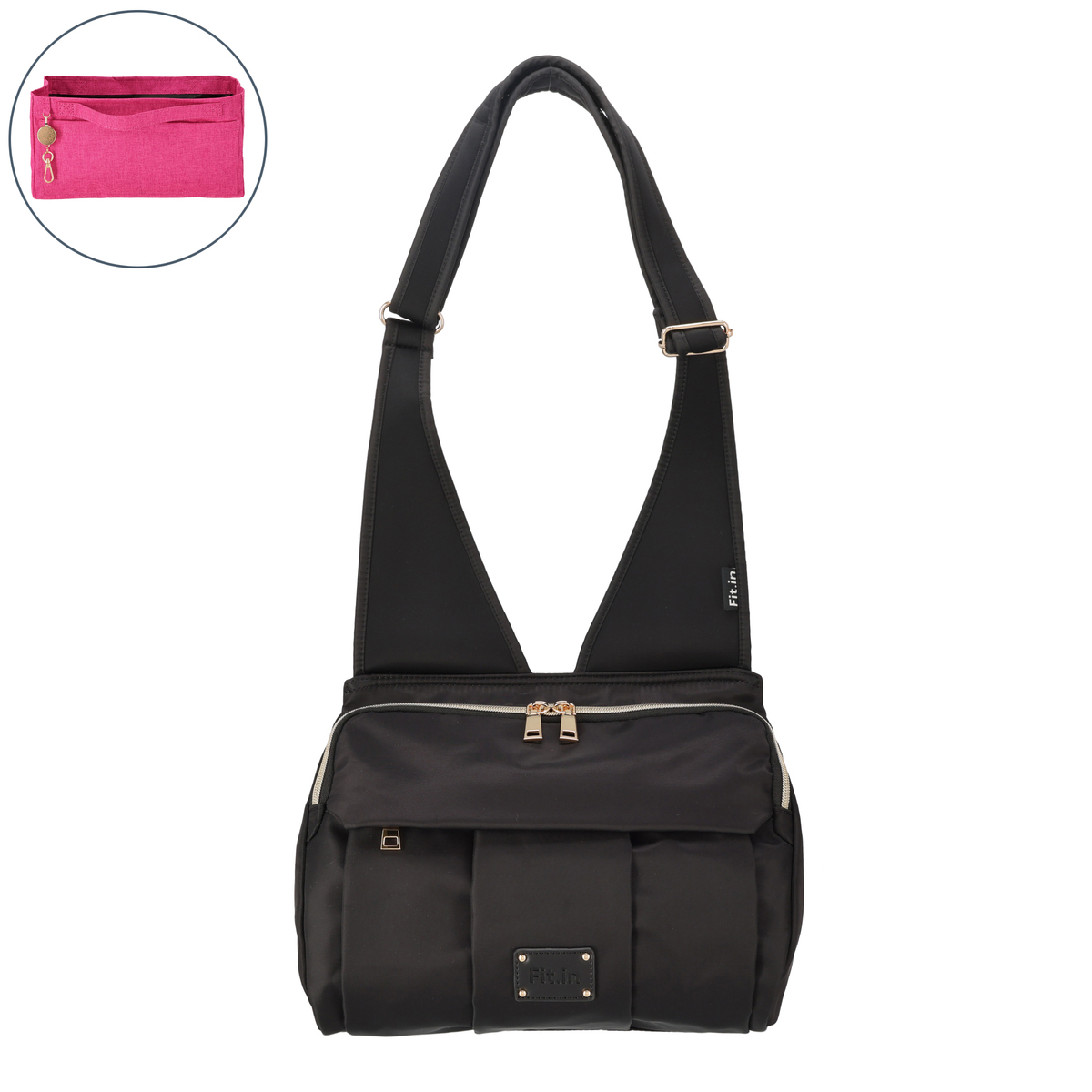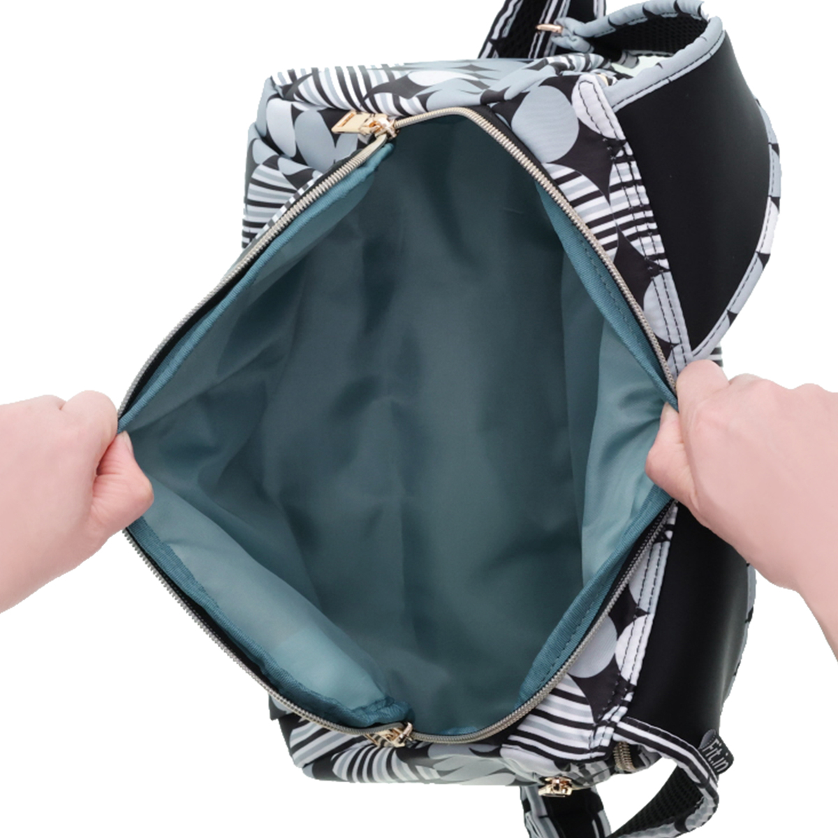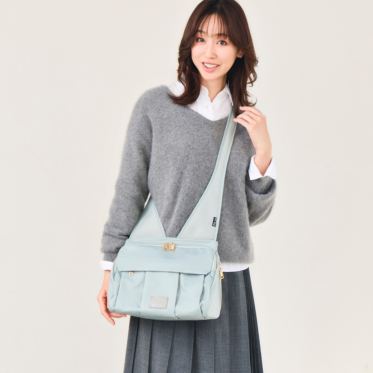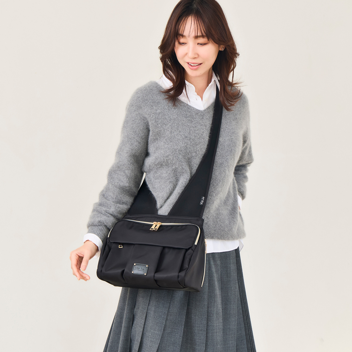 開口部はファスナー仕様で開け閉めが簡単です。フロントには隠しポケットが付いています。バッグの中身を整理整頓できるバッグインバッグ付きで、必要なものをスムーズに取り出せます