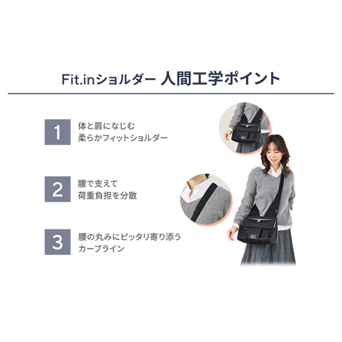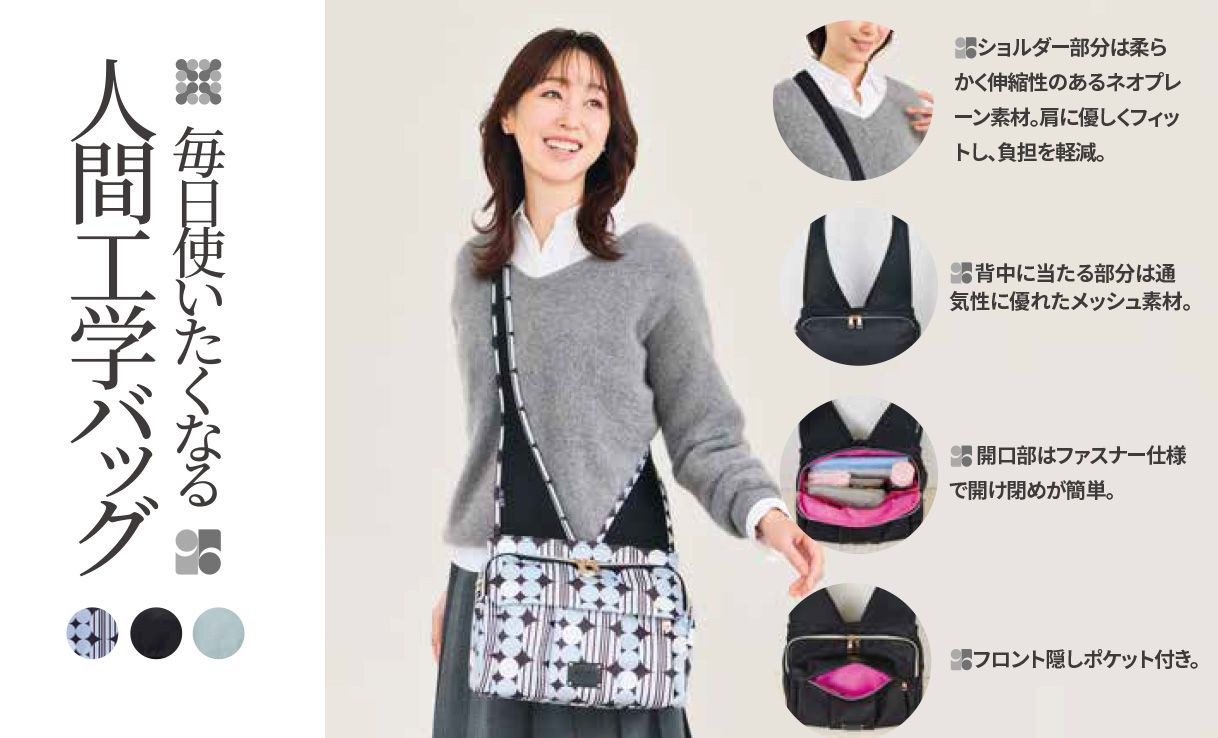 人間工学に基づいた、ひとにやさしく使いやすいバッグ。ショルダーの形が体に寄り添うデザインで、腰で支えて荷重負担を分散させます。肩や腰にバランスよく重さが分散され、荷物が多くなっても負担が少ないデザインです