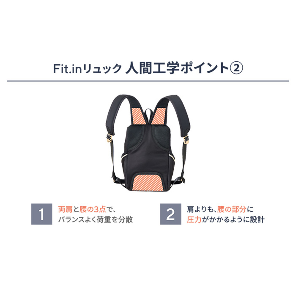 人間工学に基づいたデザインのリュック。背中にぴったり寄り添い、腰で支え荷重をバランスよく分散。肩の負担が少ないため、リュック初心者や年配の方にも使いやすい仕様です