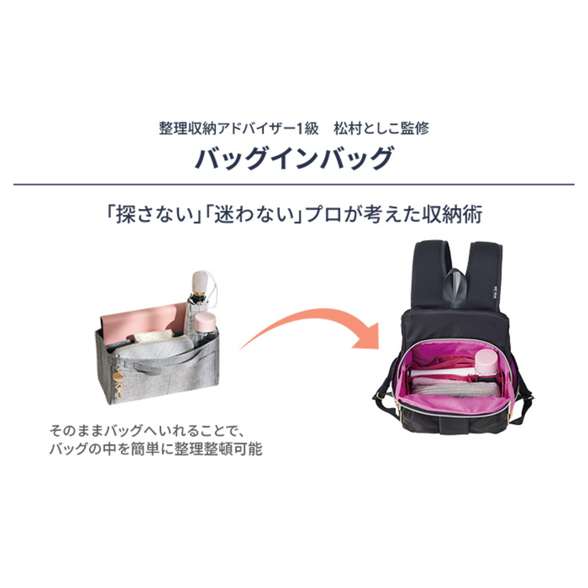 A4サイズや長財布、500mlペットボトル、ポーチなどが収納可能。また、バッグインバッグ付きで、荷物を整理して収納できます