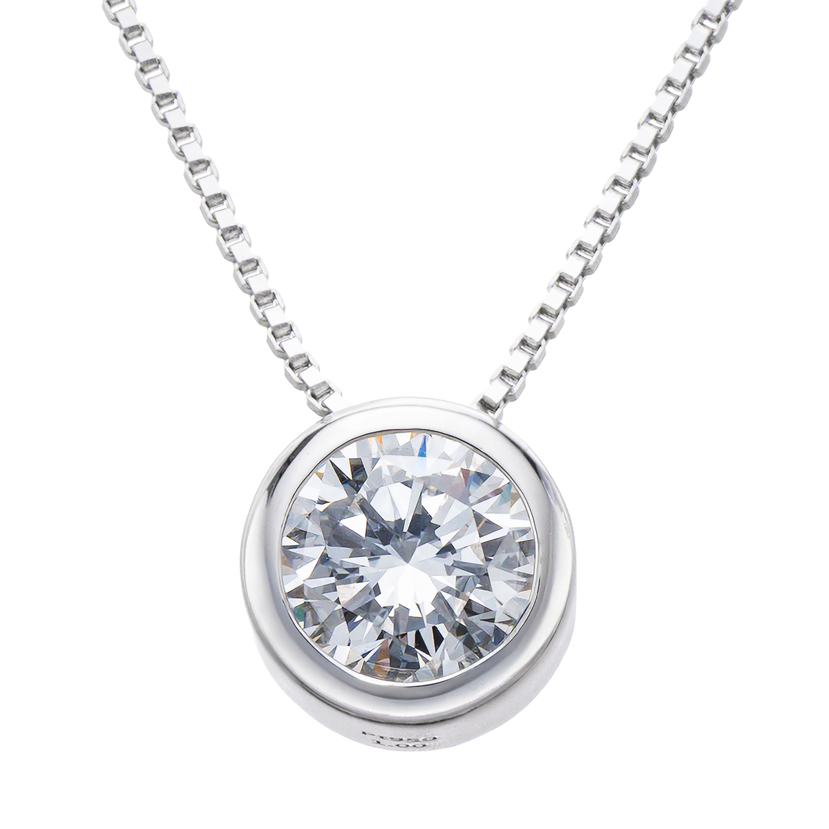 Dカラーのダイヤモンドをベゼルの枠で包み込んだペンダントです。シンプルなデザインがダイヤモンドの存在感を際立たせ、胸元をエレガントに彩ります